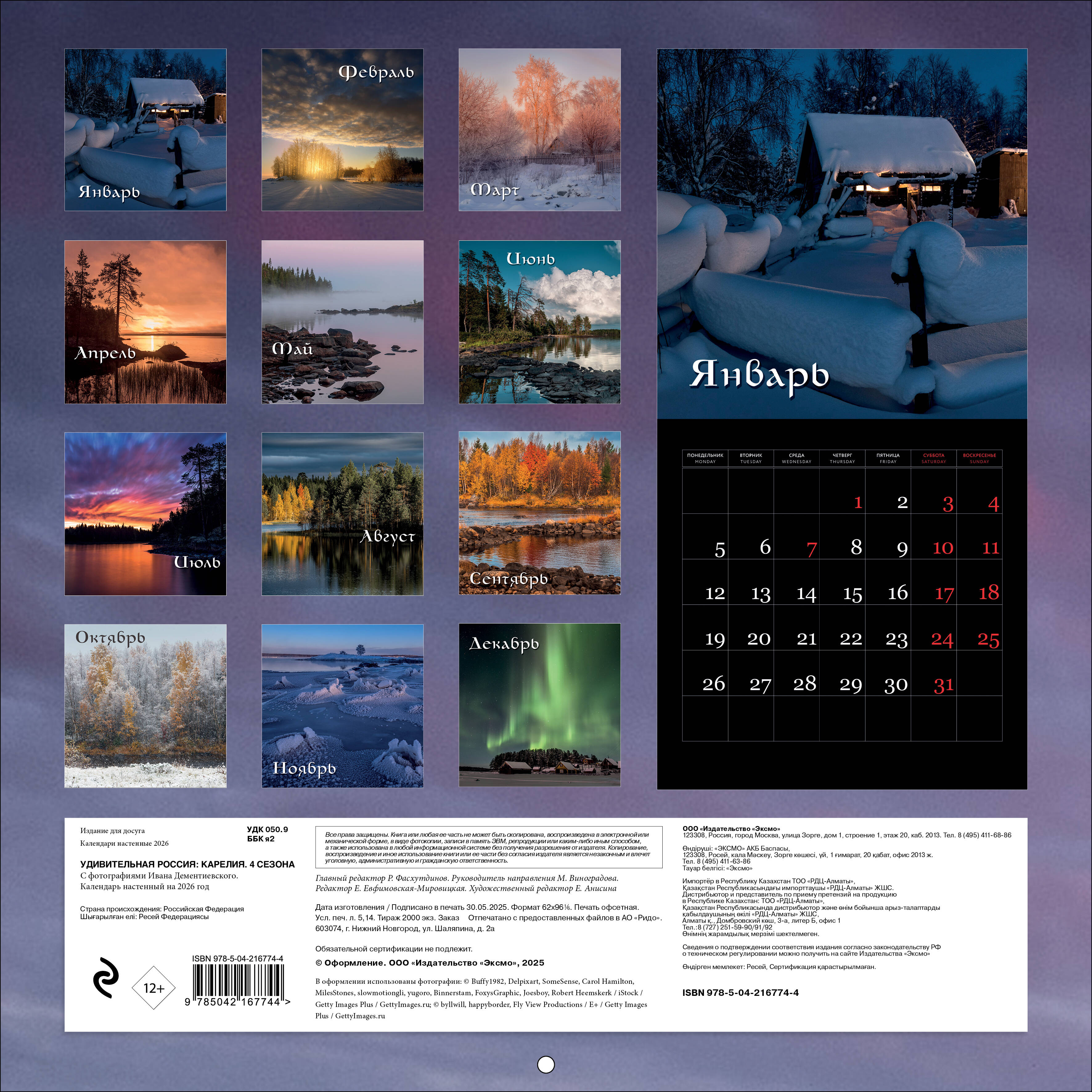 Аннотация: Удивительная Россия: Карелия. 4 сезона. C фотографиями Ивана Дементиевского. Календарь настенный на 2026 год (300х300 мм)