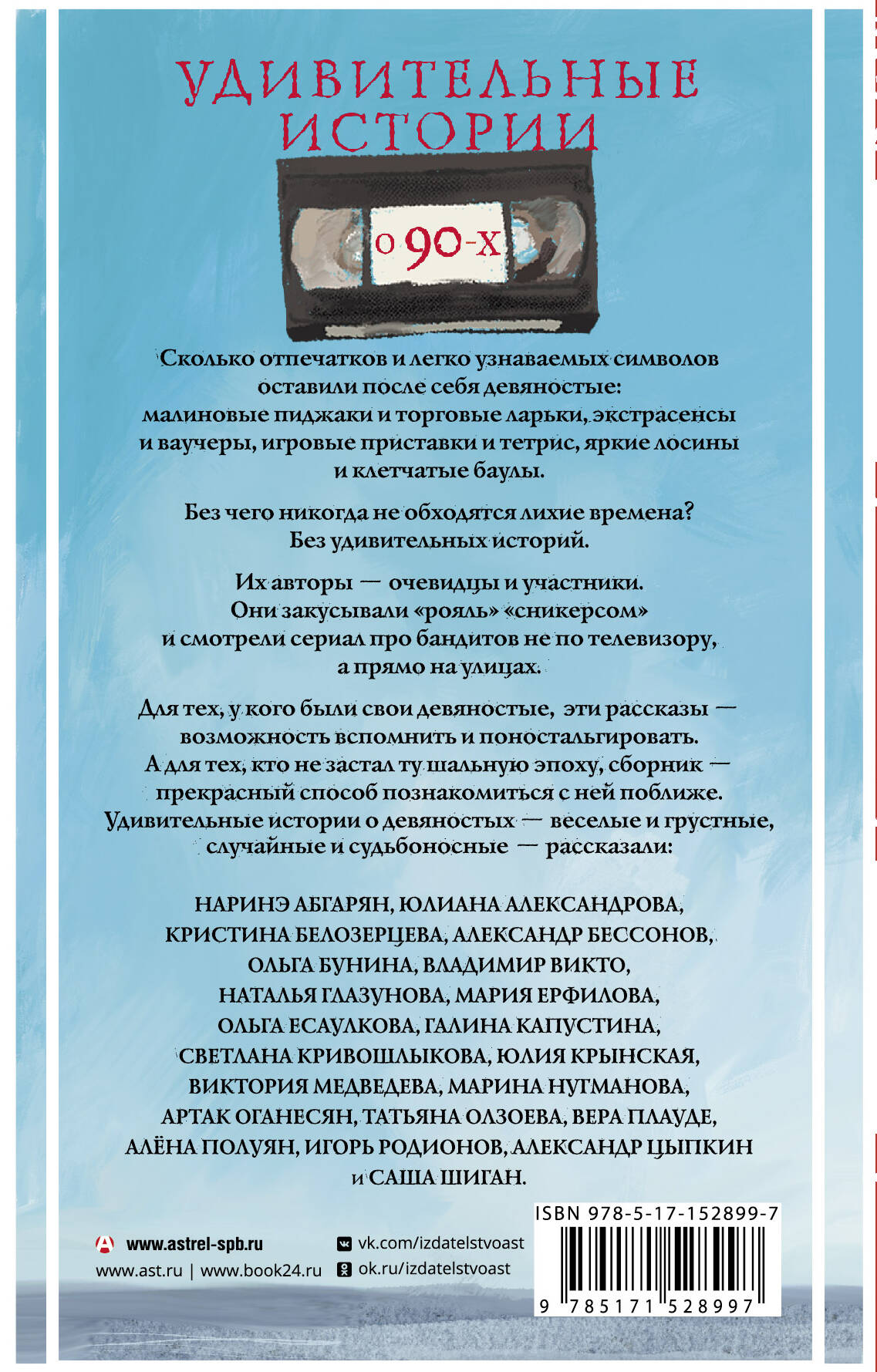 Новый сборник удивительных историй от издательства АСТ. Рассказы более двадцати авторов под одной обложкой. Истории от Александра Цыпкина, Наринэ Абгарян и Александра Бессонова. Для всех, кто с ностальгией вспоминает девяностые.| Издательство | ИЗДАТЕЛЬСТВО "АСТ" |