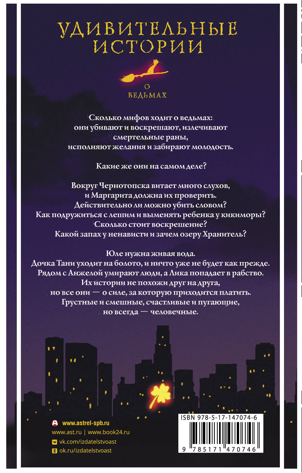 Сколько мифов ходит о ведьмах: они убивают и воскрешают, излечивают смертельные раны, исполняют желания и забирают молодость. Какие же они на самом деле? Вокруг Чернотопска витает много слухов, и Маргарита должна их проверить. Действительно ли можно убить словом? Как подружиться с лешим и выменять ребенка у кикиморы? Сколько стоит воскрешение? Какой запах у ненависти и зачем озеру Хранитель? Юле нужна живая вода. Дочка Тани уходит на болото, и ничто уже не будет как прежде. Рядом с Анжелой умирают люди, а Лика попадает в рабство. Их истории не похожи друг на друга, но все они - о силе, за которую приходится платить. Грустные и смешные, счастливые и пугающие, но всегда - человечные.| Издательство | АСТ |