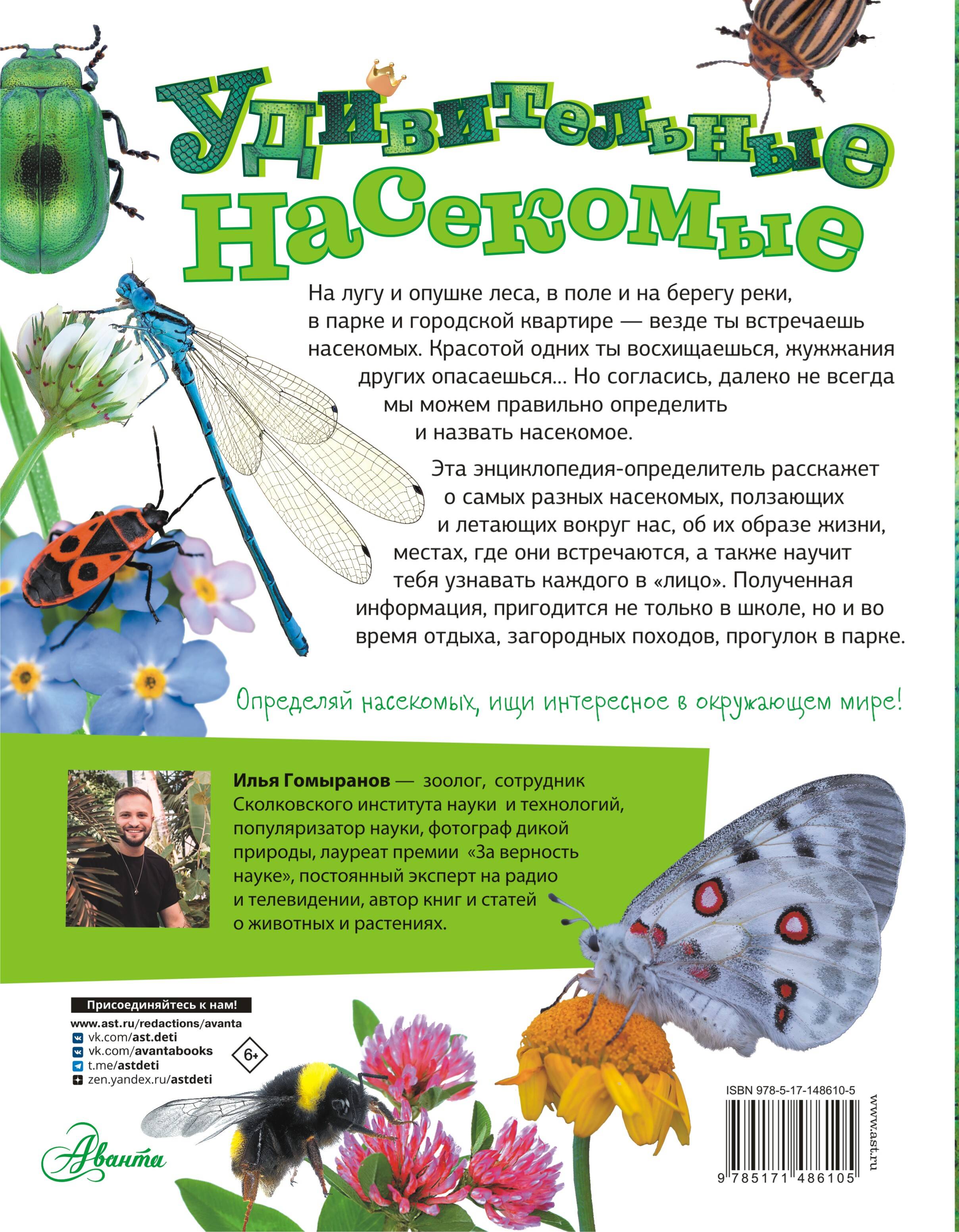 Познакомься поближе с теми, кто летает, ползает и жужжит рядом с тобой. Открой удивительный и разнообразный мир насекомых! Эта энциклопедия-определитель написана известным энтомологом, популяризатором науки Ильей Гомырановым для тех, кто хочет точно знать, кого он встречает на дачном участке, на опушке леса, лугу или на прогулках в городском парке. Ведь иногда нам только кажется, что мы знаем о них все.... Сможешь ли ты отличить муху от слепня, шершня от шмеля, поденку от водомерки? Энциклопедия-определитель поможет справиться и не с такой простой задачей. В красочной книге в емкой, но интересной форме дана разнообразная информация о насекомых нашей страны. Она пригодится на уроках в школе, для подготовки докладов и домашних заданий, а еще во время прогулок и отдыха в лесу, на реке, в горах. Изучай природу - учись определять насекомых в лесу, на лугу, в парке!| Издательство | ИЗДАТЕЛЬСТВО "АСТ" |