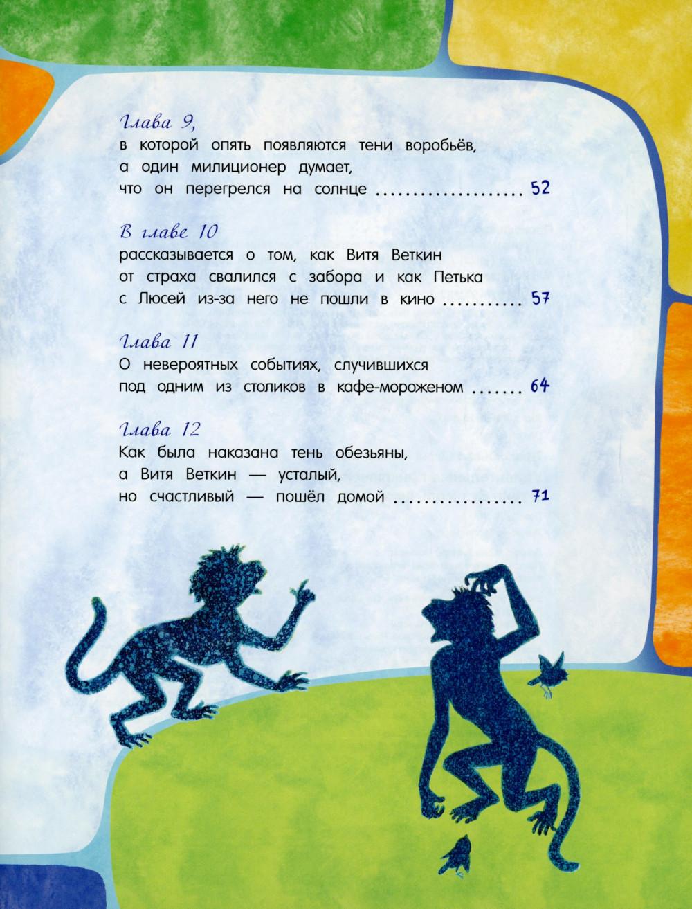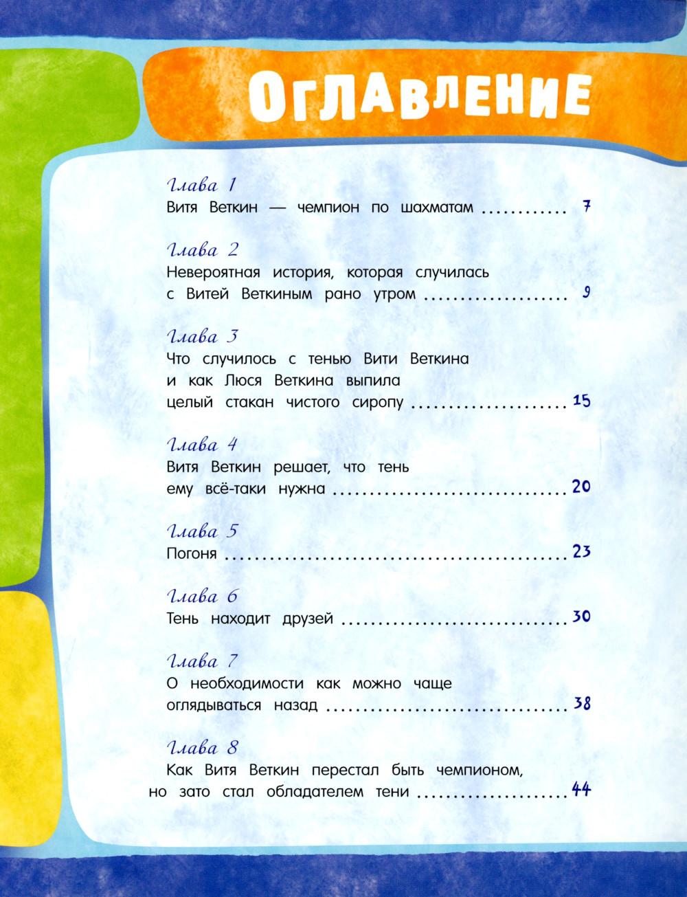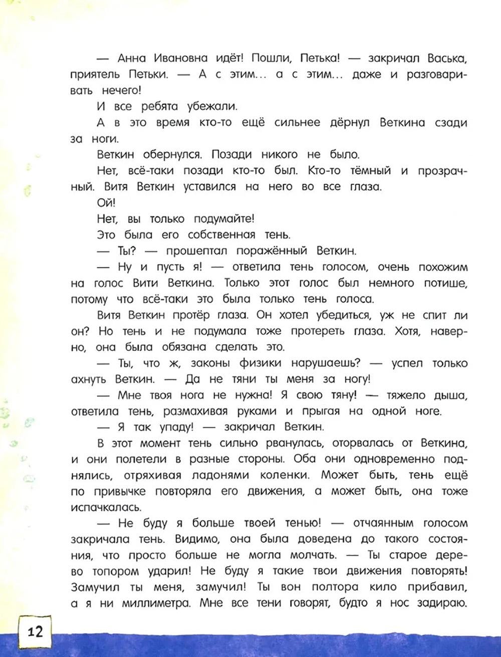 Сказочная повесть Софьи Прокофьевой о фантастических приключениях Вити Веткина и его тени! Став школьным чемпионом по шахматам, Витя не просто начал задаваться, а сделался таким высокомерным и обидчивым, что от него сбежала его собственная тень - а остаться без тени в жаркий летний день не так уж приятно. И начинаются невероятные похождения двух очень похожих мальчиков - настоящего Вити и его тени, которая ходит сама по себе, знакомится с тенями зверей в зоопарке и мечтает, что однажды настоящий Витя образумится и исправится. Это одна из тех детских книжек, которые увлекательно и весело учат простым и необходимым вещам: тому, что быть добрым и щедрым гораздо лучше, чем высокомерным и эгоистичным, и тому, как важно иметь верных друзей. Озорные и яркие иллюстрации к повести нарисовал Сергей Бордюг. Рекомендовано для внеклассного чтения. Для детей 7-10 лет.| Издательство | Изд. Лабиринт Пресс |