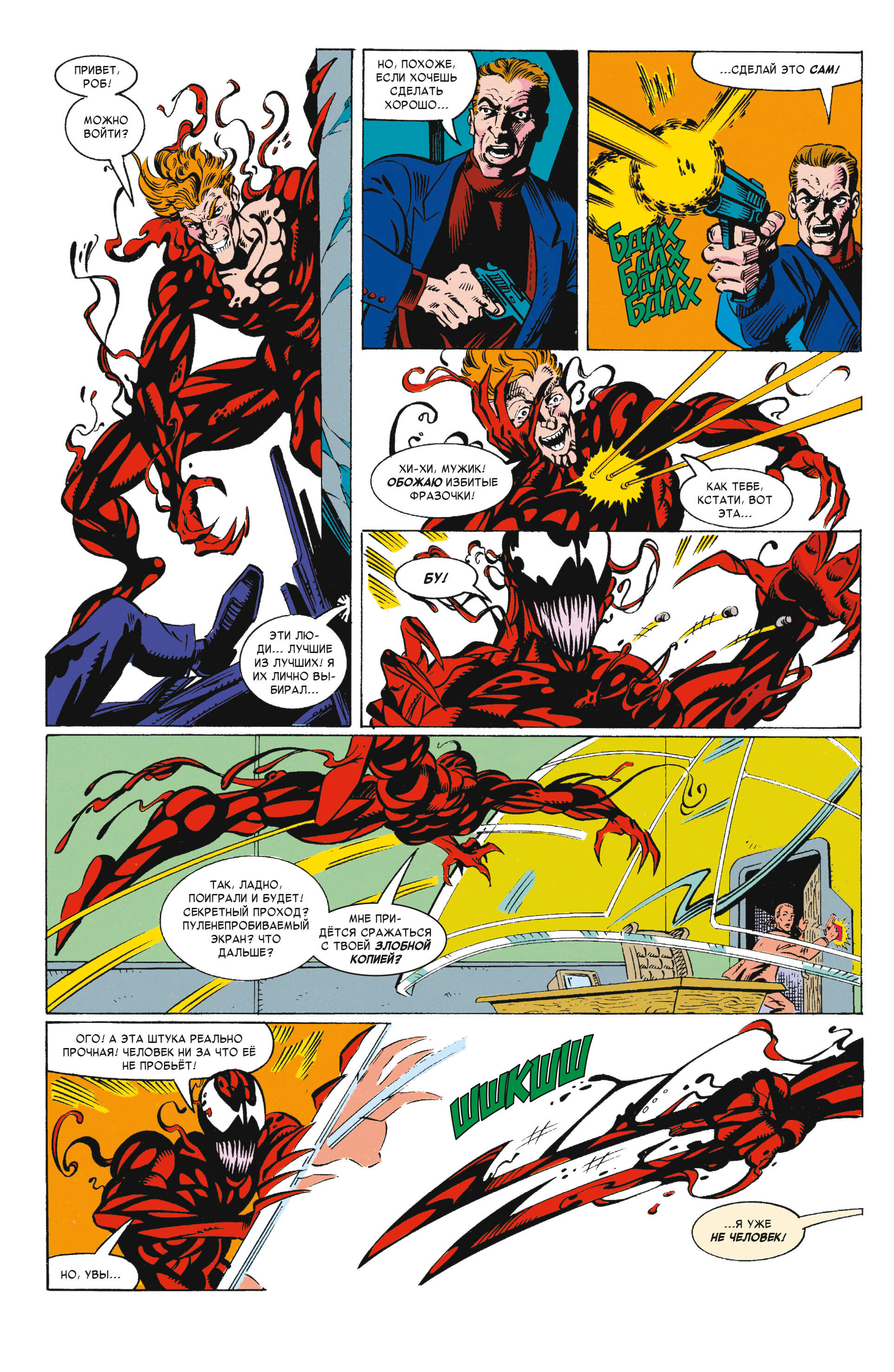 Даёшь резню! При побеге Эдди Брока из тюрьмы от его симбиота отделилась небольшая часть и слилась с сокамерником Венома, маньяком Клетусом Кэссиди. Так родился Карнаж! Теперь Нью-Йорк в ужасе, никто не чувствует себя в безопасности. Карнаж убивает без разбору, его жертвами становятся даже самые беззащитные. На что придётся пойти Человеку-пауку чтобы остановить психопата? Хватит ли помощи проверенных друзей или звать на подмогу придётся злейшего врага?