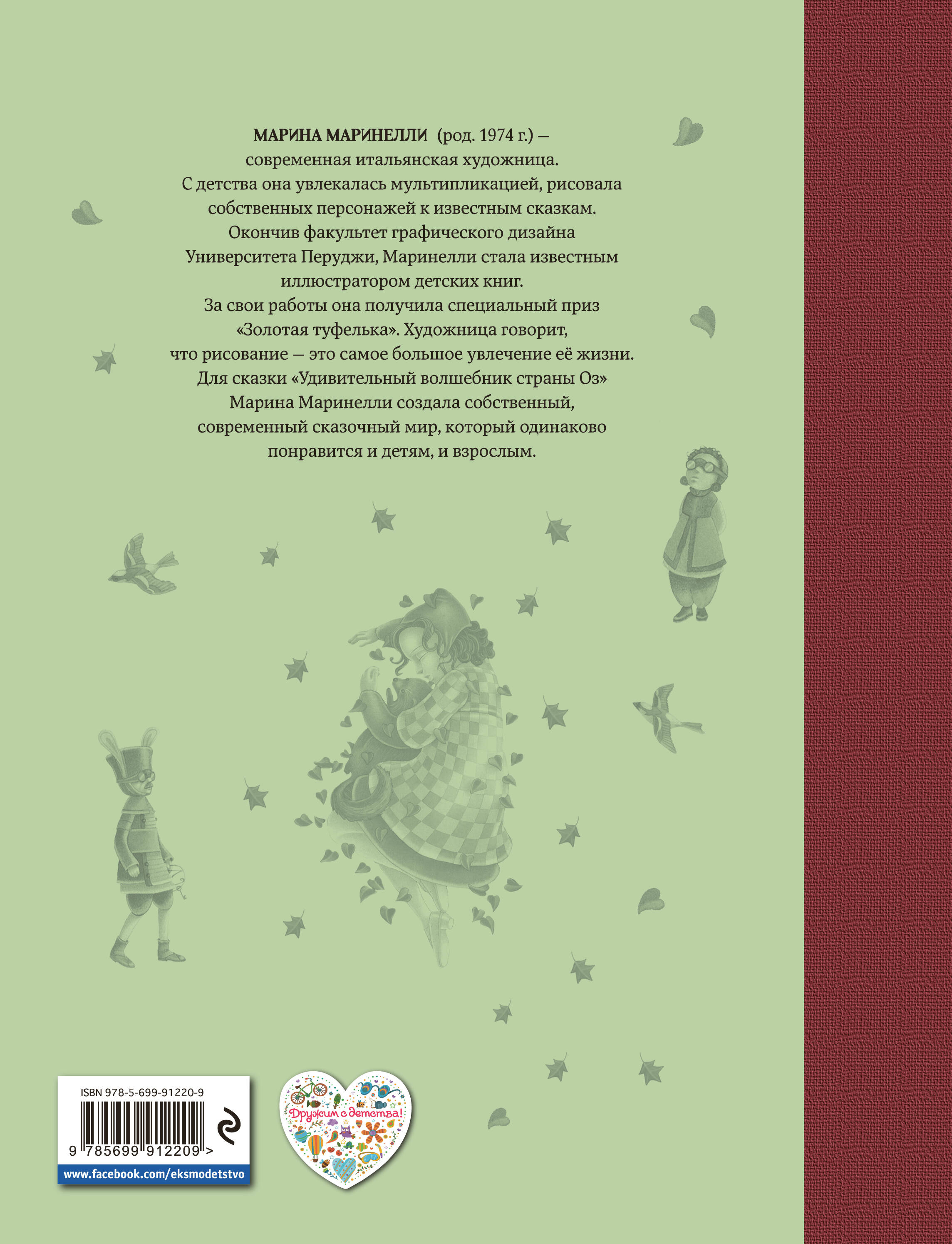 МАРИНА Маринелли (род. 1974 г.) - современная итальянская художница. С детства она увлекалась мультипликацией, рисовала собственных персонажей к известным сказкам. Окончив факультет графического дизайна Университета Перуджи, Маринелли стала известным иллюстратором детских книг. За свои работы она получила специальный приз «Золотая туфелька». Художница говорит, что рисование - это самое большое увлечение в её жизни. Для сказки «Удивительный волшебник из страны Оз» Марина Маринелли создала собственный, современный сказочный мир, который одинаково понравится и детям, и взрослым.| Издательство | ООО "Издательство "Эксмо" |