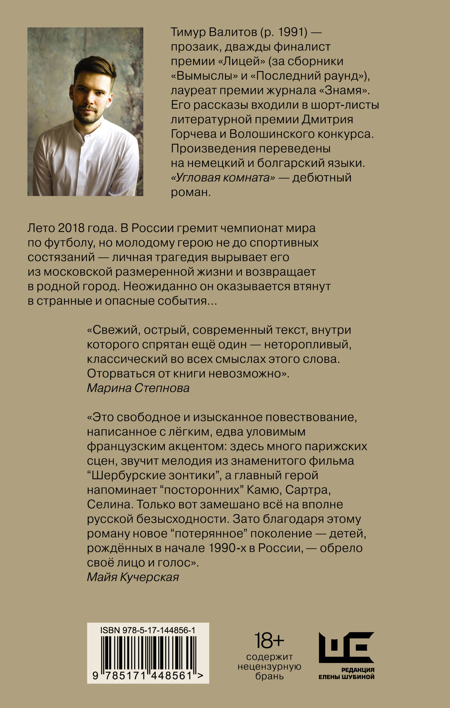 Тимур Валитов (р. 1991) - прозаик, дважды финалист премии "Лицей" (за сборники "Вымыслы" и "Последний раунд"), лауреат премии журнала "Знамя". Его рассказы входили в шорт-листы литературной премии Дмитрия Горчева и Волошинского конкурса. Произведения переведены на немецкий и болгарский языки. "Угловая комната" - дебютный роман. Лето 2018 года. В России гремит чемпионат мира по футболу, но молодому герою не до спортивных состязаний - личная трагедия вырывает его из московской размеренной жизни и возвращает в родной город. Неожиданно он оказывается втянут в странные и опасные события... "Свежий, острый, современный текст, внутри которого спрятан ещё один - неторопливый, классический во всех смыслах этого слова. Оторваться от книги невозможно". Марина Степнова "Это свободное и изысканное повествование, написанное с лёгким, едва уловимым французским акцентом: здесь много парижских сцен, звучит мелодия из знаменитого фильма "Шербурские зонтики", а главный герой напоминает "посторонних" Камю, Сартра, Селина. Только вот замешано всё на вполне русской безысходности. Зато благодаря этому роману новое "потерянное" поколение - детей, рожденных в начале 1990-х в России, - обрело своё лицо и голос". Майя Кучерская| Издательство | Издательство "АСТ" |