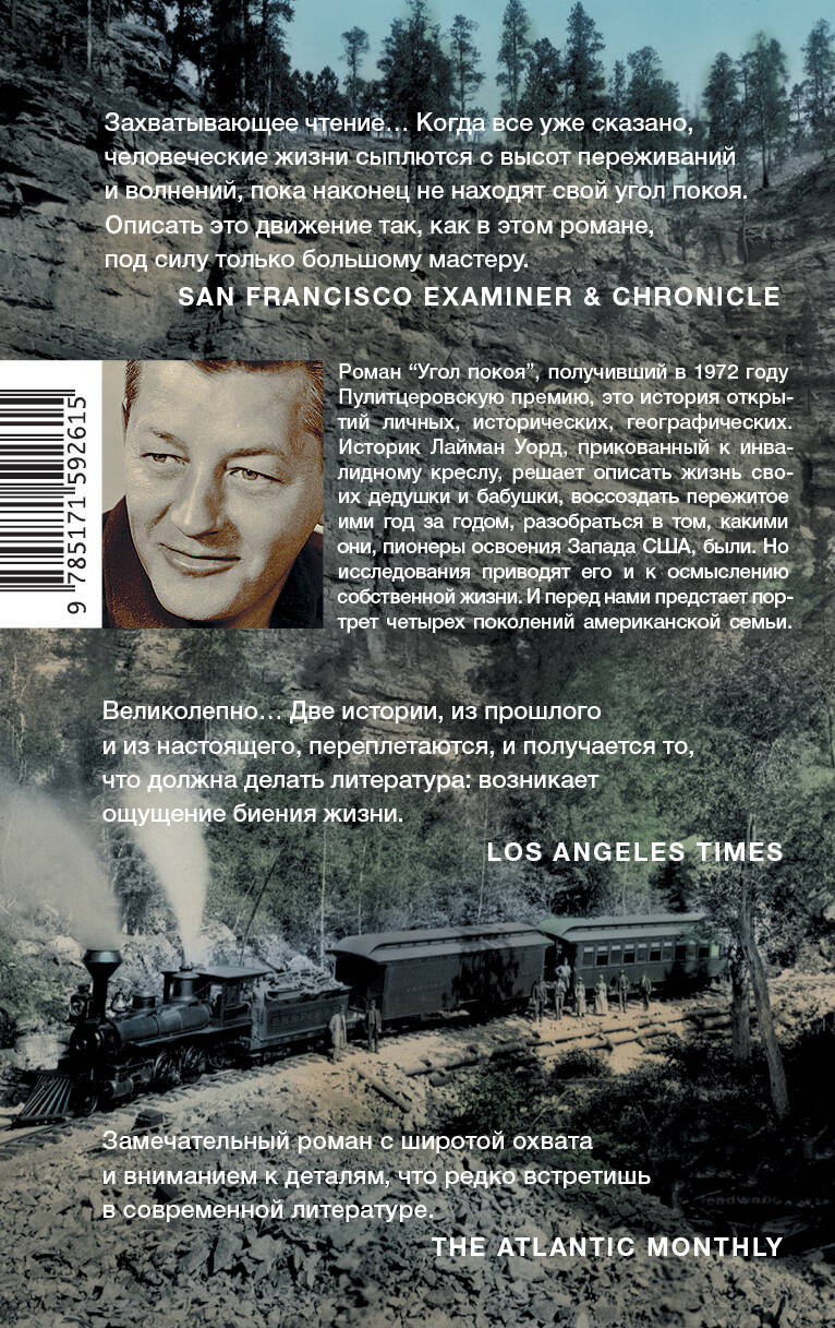 Уоллес Стегнер получил за роман "Угол покоя" Пулитцеровскую премию, и эта книга заслуженно считается вершиной его творчества. Лайман Уорд, пожилой человек, прикованный к инвалидному креслу, решает разобрать архивы своих дедушки и бабушки и воссоздать историю их жизни. Дед-инженер и бабушка, художница и писательница, были пионерами освоения Запада США. Но, пытаясь разобраться в перипетиях их судеб, Уорд помимо своей воли погружается и в осмысление собственной жизни.| Издательство | Издательство "АСТ" |