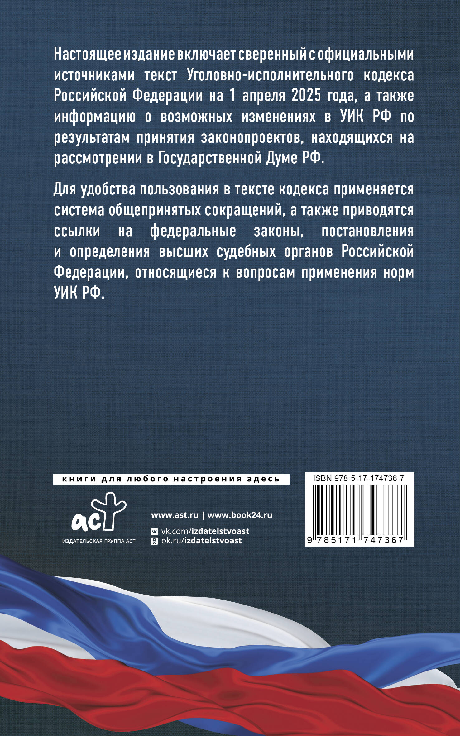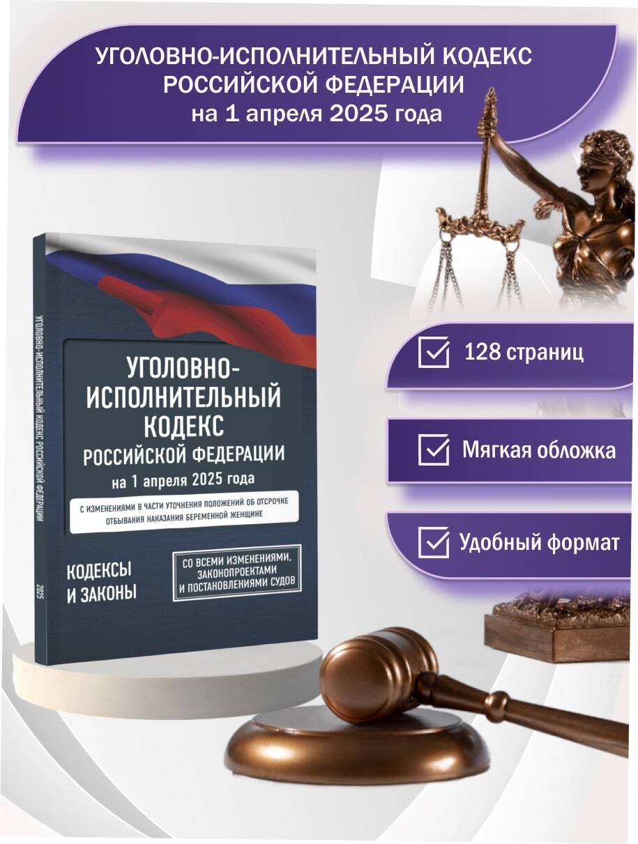 Данное издание Уголовно-исполнительного кодекса РФ сверено с официальным источником и приводится по состоянию на 1 апреля 2025 года. Кодекс учитывает все изменения, опубликованные в официальных источниках на момент подписания издания в печать. В издании представлена информация о возможных изменениях в УИК РФ по результатам принятия законопроектов, находящихся на рассмотрении в Государственной Думе РФ. Для удобства пользования в тексте кодекса применяется система общепринятых сокращений, а также приводятся ссылки на федеральные законы, постановления Правительства Российской Федерации, постановления и определения высших судебных органов Российской Федерации, относящиеся к вопросам применения норм УИК РФ.| Издательство | Издательство "АСТ" |