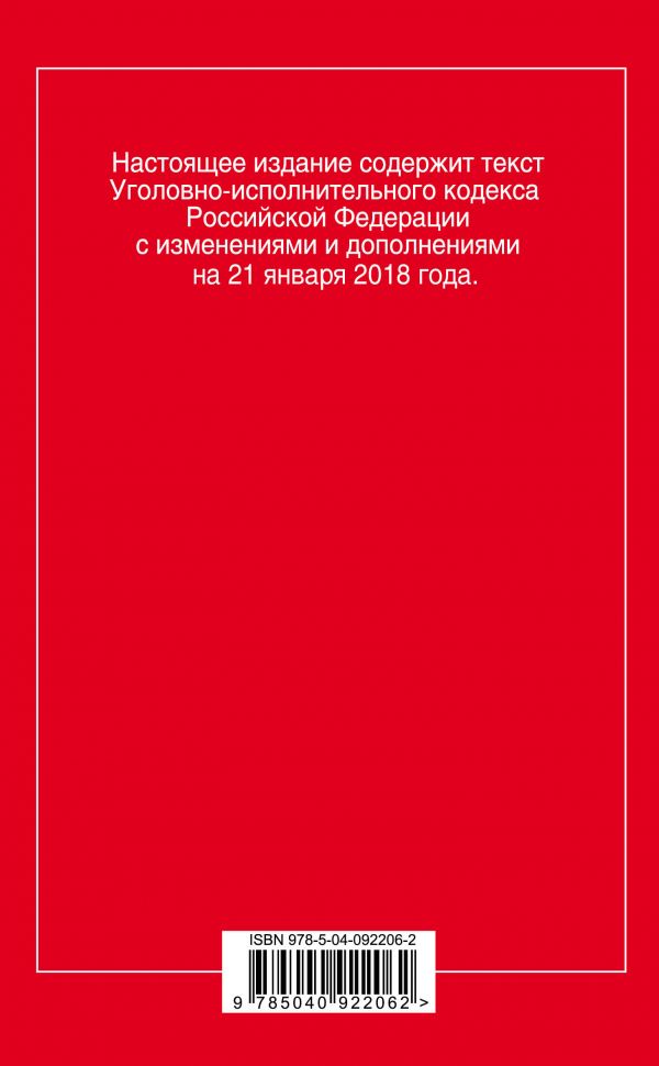 Настоящее издание содержит текст Уголовно-исполнительного кодекса Российской Федерации в редакции, действующей на 21 января 2018 года. Если есть изменения, вступающие в силу позднее, то вместе с редакцией нормы, действующей на эту дату, приводится норма в новой редакции и указывается дата, с которой она вступает в силу.