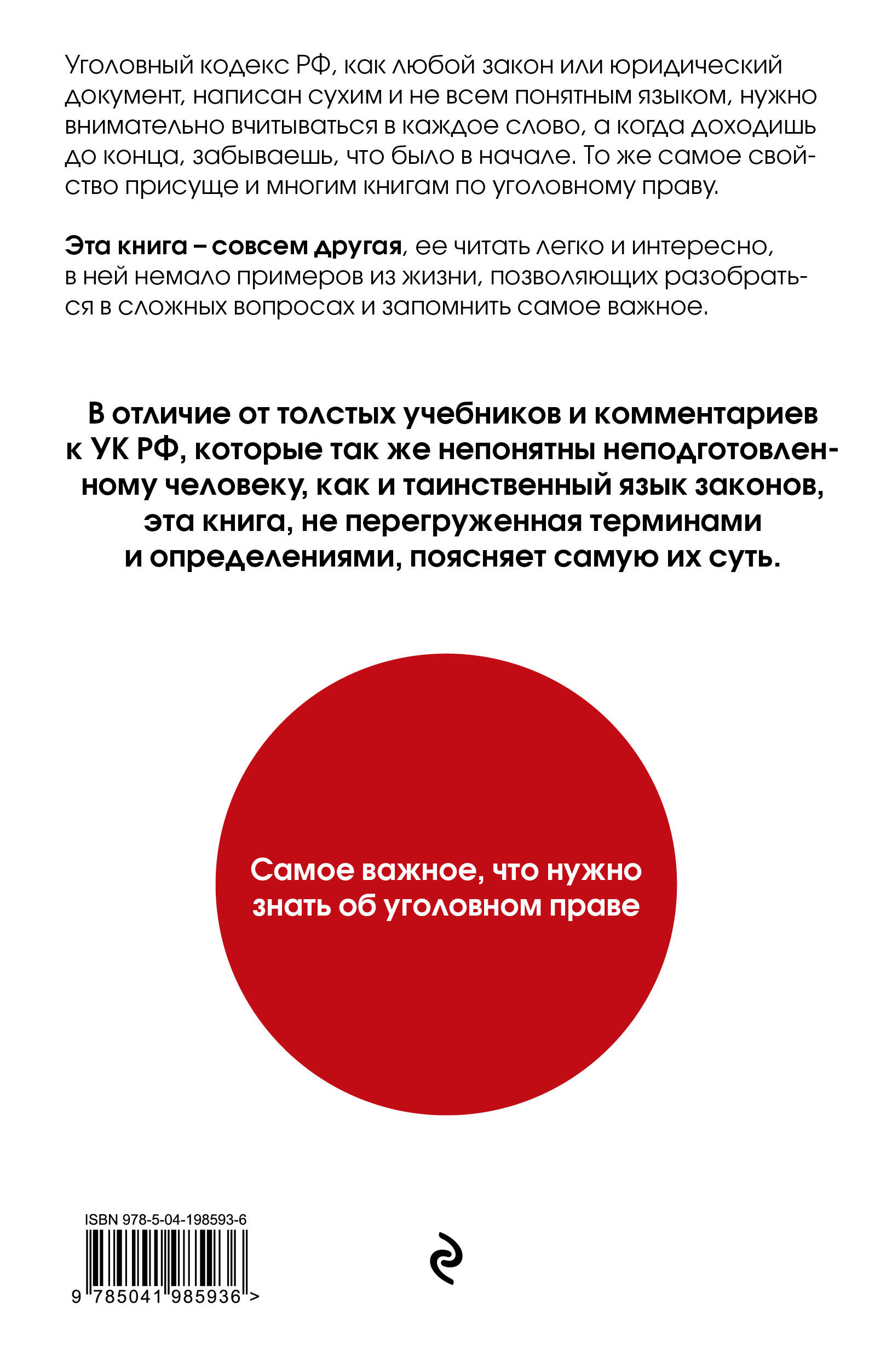 Любой, кто хочет знать свои права и обязанности, сталкивается с проблемой понимания законов и нормативных актов. Юридические документы написаны сложным языком, нужно внимательно вчитываться в каждое слово, а когда доходишь до конца, забываешь, что было в начале. Эта книга - совсем другая, она написана легко и интересно, в ней немало примеров из жизни, позволяющих разобраться в сложных вопросах и запомнить самое важное. Книга поможет вам: - понять значение базовых терминов уголовного права - состав преступления, презумпция невиновности, соучастие, уголовная ответственность и уголовное наказание и т.д.; - научиться правильно читать Уголовный кодекс; - и, в конечном итоге - научиться понимать Уголовный кодекс О чем эта книга Автор в популярной форме, простым языком объясняет сложные вопросы и дает комментарии к нормам Уголовного кодекса. Для кого эта книга: Для тех, кто желает обогатить свой кругозор общеправовыми знаниями. необходимыми для личностного развития и правовой самозащиты. Для студентов, аспирантов, преподавателей, а также для тех, кто работает или только готовится к работе в правоохранительных органах и нуждается в получении актуальной и достоверной информации. Об авторе: Дмитрий Усольцев - автор книг по правовой поддержке граждан. Его произведения выдержали десятки переизданий, поэтому он точно знает, как заинтересовать читателя юридическими вопросами и рассказать о сложных вещах просто и понятно.