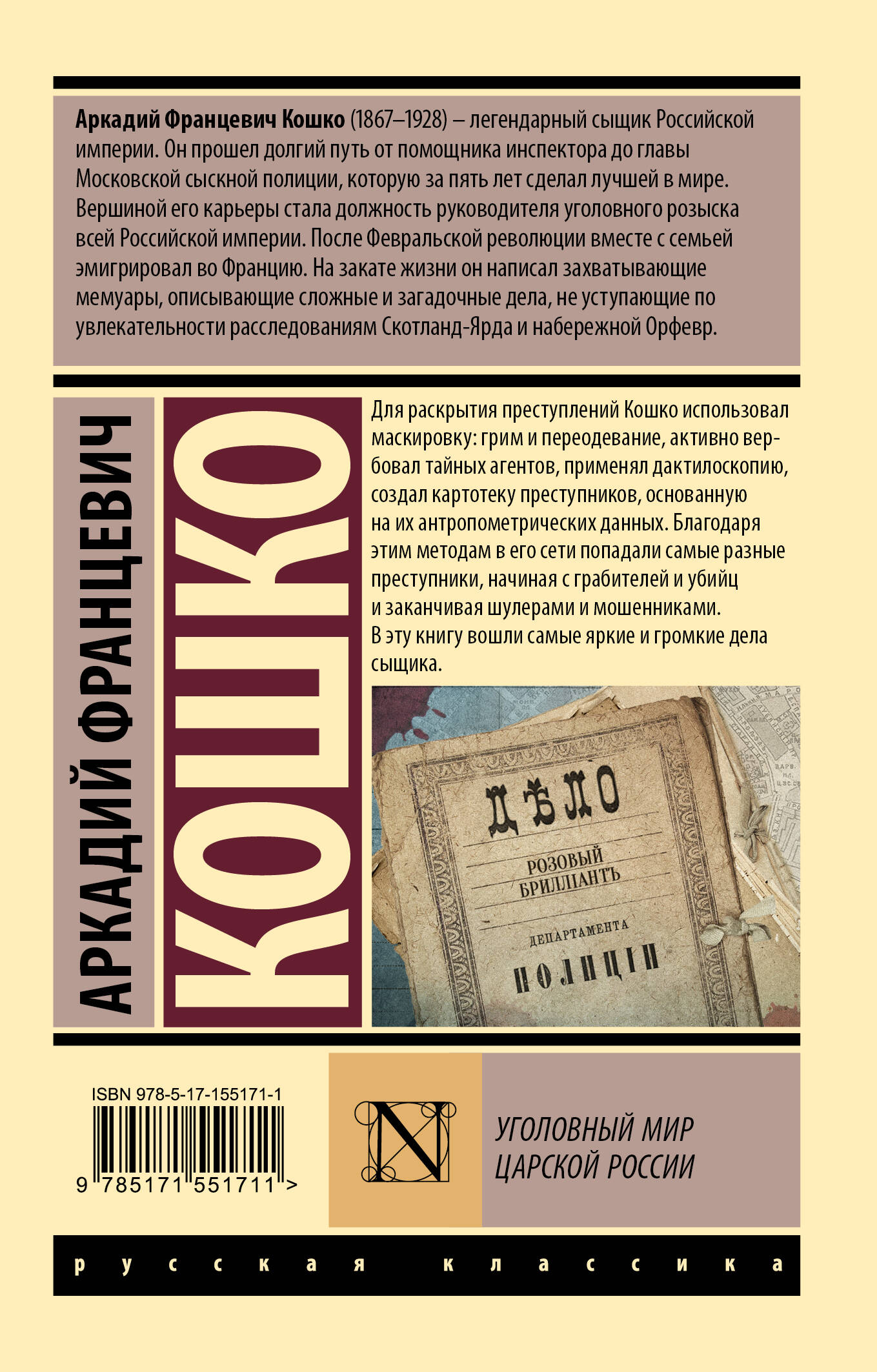 Для раскрытия преступлений Кошко использовал маскировку: грим и переодевание, активно вербовал тайных агентов, применял дактилоскопию, создал картотеку преступников, основанную на их антропометрических данных. Благодаря этим методам в его сети попадали самые разные преступники, начиная с грабителей и убийц и заканчивая шулерами и мошенниками. В эту книгу вошли самые яркие и громкие дела сыщика.| Издательство | ИЗДАТЕЛЬСТВО "АСТ" |
