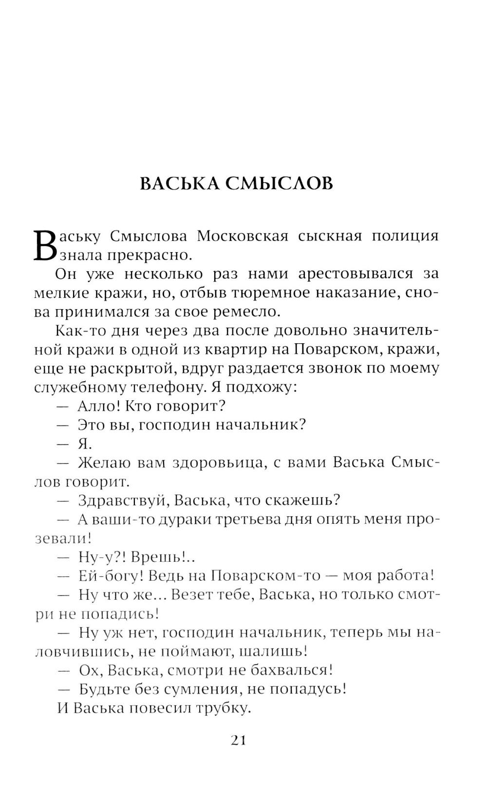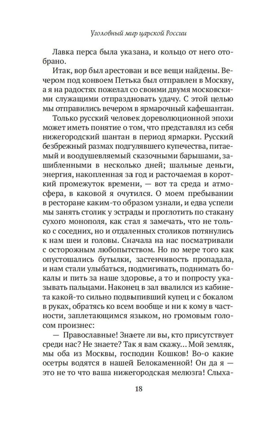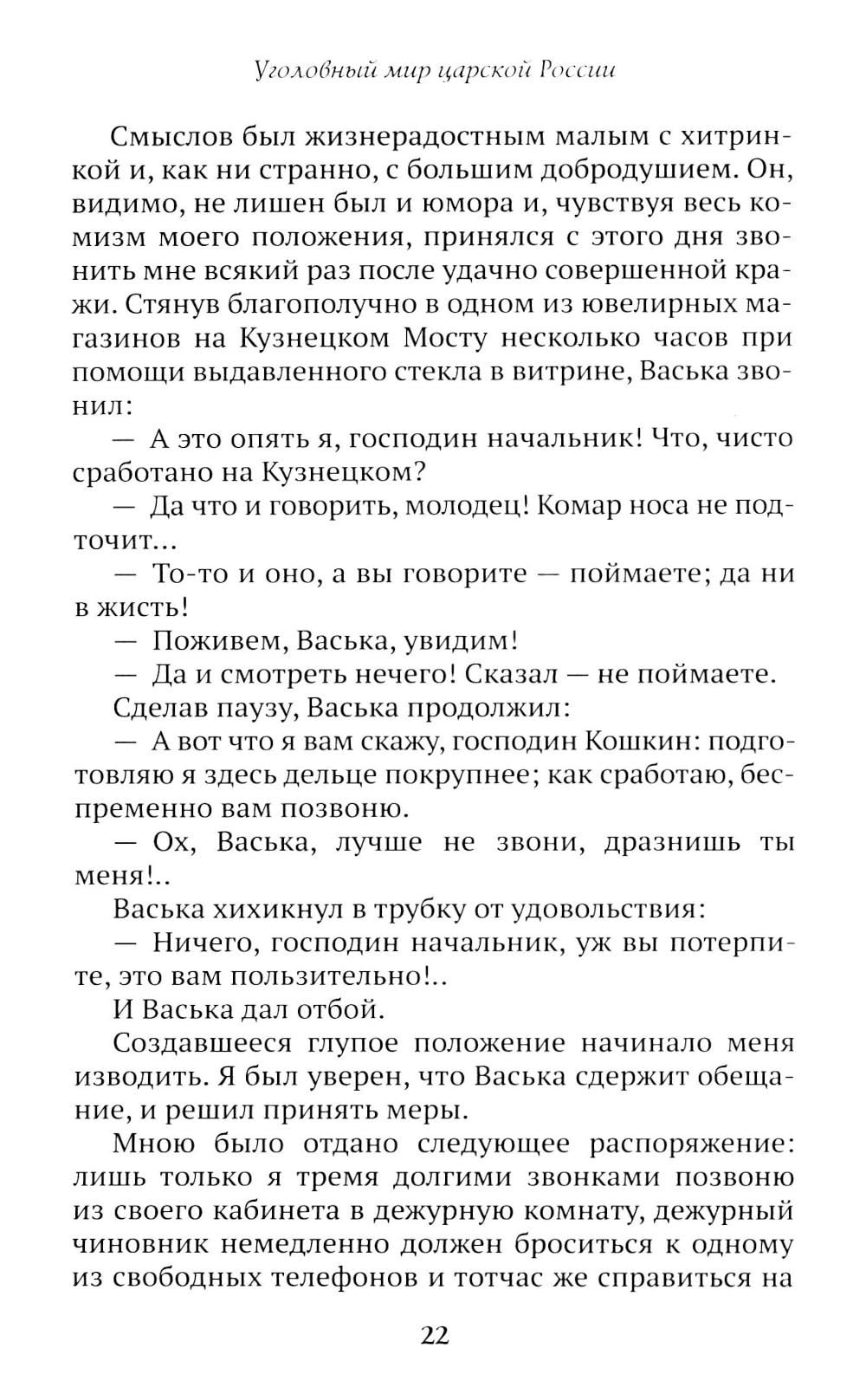 СОДЕРЖИТ ИНФОРМАЦИЮ О НАРКОТИЧЕСКИХ ИЛИ ПСИХОТРОПНЫХ ВЕЩЕСТВАХ, УПОТРЕБЛЕНИЕ КОТОРЫХ ОПАСНО ДЛЯ ЗДОРОВЬЯ. ИХ НЕЗАКОННЫЙ ОБОРОТ ВЛЕЧЕТ УГОЛОВНУЮ ОТВЕТСТВЕННОСТЬ. Очерки уголовного мира последних лет Российской империи, написанные начальником Московской сыскной полиции, выдающимся криминалистом и детективом Аркадием Кошко, и в наши дни читаются с неослабевающим интересом. «Русский Шерлок Холмс» обладал не только талантом сыщика, но и незаурядным писательским дарованием. Кошко с азартом и изрядной долей юмора рассказывает об ухищрениях полиции, способах слежки и маскировки, о новейших для своего времени достижениях криминалистики и приемах раскрытия преступлений, восхищая живым и ярким русским языком и преданностью старого служаки делу защиты граждан. Его короткие истории о загадочных происшествиях, опасных злодеях, колоритных жуликах и, конечно же, о бравых сыщиках увлекают не только любителей криминального жанра. В каждом своем деле детектив старался докопаться до обстоятельств, которые приводят к преступлениям, поэтому его очерки - это еще и глубокое исследование человеческой природы.| Издательство | Азбука |