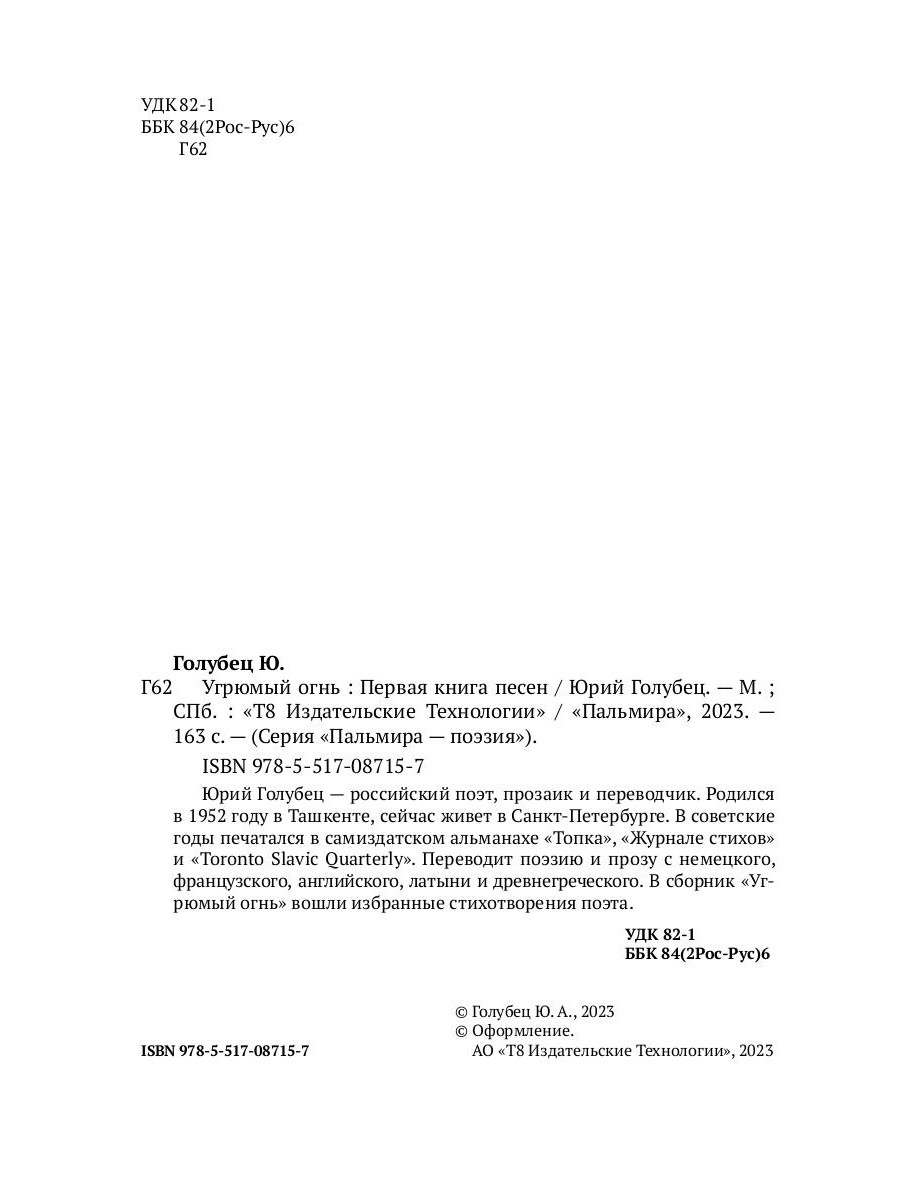 Юрий Голубец - российский поэт, прозаик и переводчик. Родился в 1952 году в Ташкенте, учился и жил в Санкт-Петербурге. Печатался в самиздатском альманахе "Топка", "Журнале стихов" и "Toronto Slavic Quarterly". Переводит поэзию и прозу с немецкого, французского, английского, древнегреческого и латыни. В сборник "Угрюмый огнь" вошли избранные стихотворения поэта.| Издательство | Т8 RUGRAM |