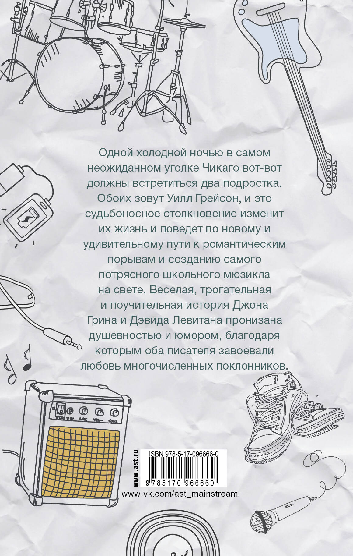 Одной холодной ночью в самом неожиданном уголке Чикаго вот-вот должны встретиться два подростка. Обоих зовут Уилл Грейсон, и это судьбоносное столкновение изменит их жизнь и поведет по новому и удивительному пути к романтическим порывам и созданию самого потрясного школьного мюзикла на свете. Веселая, трогательная и поучительная история Джона Грина и Дэвида Левитана пронизана душевностью и юмором, благодаря которым оба писателя завоевали любовь многочисленных поклонников.| Издательство | Издательство "АСТ" |