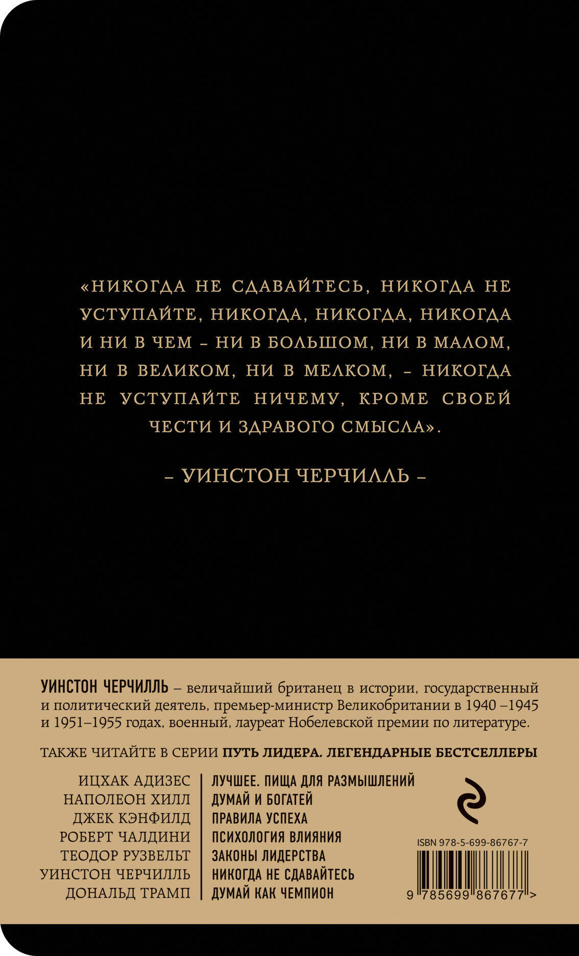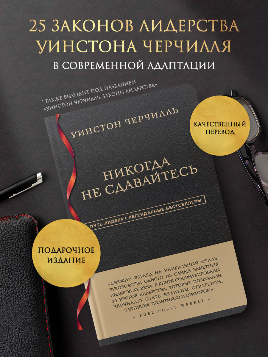 БЕСТСЕЛЛЕР В РОССИИ С 2018 ГОДА. О серии Серия «Путь лидера. Легендарные бестселлеры» - это семь наиболее значимых в своей области книг о влиянии, управлении, стойкости, внутренней силе, богатстве, решительности и упорстве. Все авторы - признанные лидеры или лучшие эксперты по ключевым навыкам лидера. Эти бестселлеры уже имеют свою историю успеха и помогли миллионам людей добиться выдающихся результатов. Фишки Книги серии «Путь лидера. Легендарные бестселлеры» роскошно оформлены: переплет из черного бумвинила, тиснение золотом, скругленные углы, стильные красные форзацы и лента-ляссе, качественная белая бумага в блоке. Прекрасный подарок и украшение книжной полки. Также читайте в серии: - Ицхак Адизес. «Лучшее. Пища для размышлений». - Наполеон Хилл. «Думай и богатей». - Джек Кэнфилд. «Правила успеха». - Роберт Чалдини. «Психология влияния». - Теодор Рузвельт. «Законы лидерства». - Уинстон Черчилль. «Никогда не сдавайтесь». - Дональд Трамп. «Думай как чемпион». О чем Свежий взгляд на уникальный стиль руководства одного из самых заметных лидеров XX века. В книге сформулированы 25 законов лидерства Уинстона Черчилля, которые позволили ему стать великим стратегом, тактиком, политиком, оратором, менеджером. Вот эти законы: 1. Наслаждайтесь моментом. 2. Будьте реалистом. 3. Определите свою судьбу. 4. Учитесь на ошибках. 5. Просто выполняйте свою работу. 6. Убедитесь на собственном опыте. 7. Будьте справедливы. 8. Обозначьте черту. 9. Всегда оставайтесь собой. 10. Говорите правду в глаза. 11. Ориентируйтесь по своему компасу. 12. Отвергайте сделки с тиранами. 13. Примите неизвестность. 14. Предложите возможность жертвовать. 15. Используйте неблагоприятные обстоятельства. 16. Презирайте угрозы. 17. Опирайтесь на важнейшие ценности. 18. Поступайте по совести. 19. Бросьте вызов. 20. Считайте трудность возможностью. 21. Откройте перспективы, расставьте приоритеты. 22. Будьте непреклонны. 23. Обзаведитесь надежными партнерами. 24. Действуйте в соответствии с ситуацией. 25. Побеждайте. Для кого Для руководителей компаний и подразделений, для тех, кто интересуется вопросами лидерства, историей XX века. Фишки Законы лидерства подкреплены интересными фактами из жизни Уинстона Черчилля и его бессмертными высказываниями. Качественный перевод, книга хорошо структурирована. Автор-составитель Алан Аксельрод - автор 80 книг по истории, управлению бизнесом и наукой, многие из которых стали бестселлерами. Доктор философии, постоянный гость на телеканалах СNN, CNBC, Fox, MSNBC и на радио, в том числе и на NPR. Аксельрод и его книги упоминались в таких изданиях, как Fortune, Men's Health и USA Today.| Издательство | ООО "Издательство "Эксмо" |