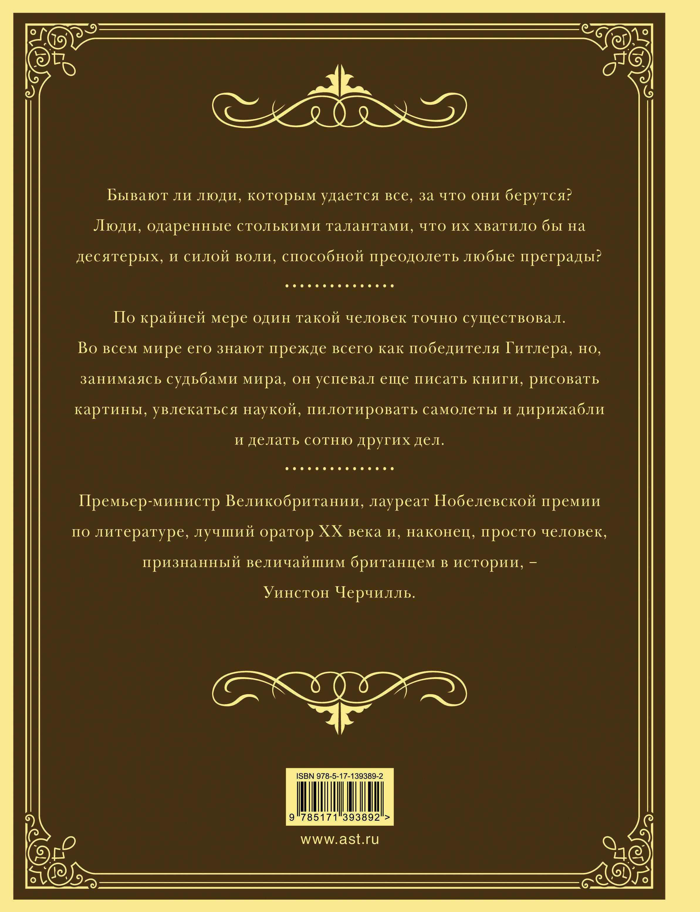 Бывают ли люди, которым удается все, за что они берутся? Люди, одаренные таким букетом талантов, какого хватило бы на десятерых, и силой воли,способной преодолеть любые преграды? По крайней мере один такой человек точно существовал. Во всем мире его знают прежде всего как одного из победителей Гитлера, но, занимаясь судьбами мира, он успевал еще писать книги,рисовать картины, увлекаться наукой, пилотировать самолеты и дирижабли и делать сотню других дел. Премьер министр Великобритании, лауреат Но- белевской премии по литературе, лучший оратор XX века и, наконец, просто человек, признанный величайшим британцем в истории - Уинстон Черчилль.| Издательство | ИЗДАТЕЛЬСТВО "АСТ" |