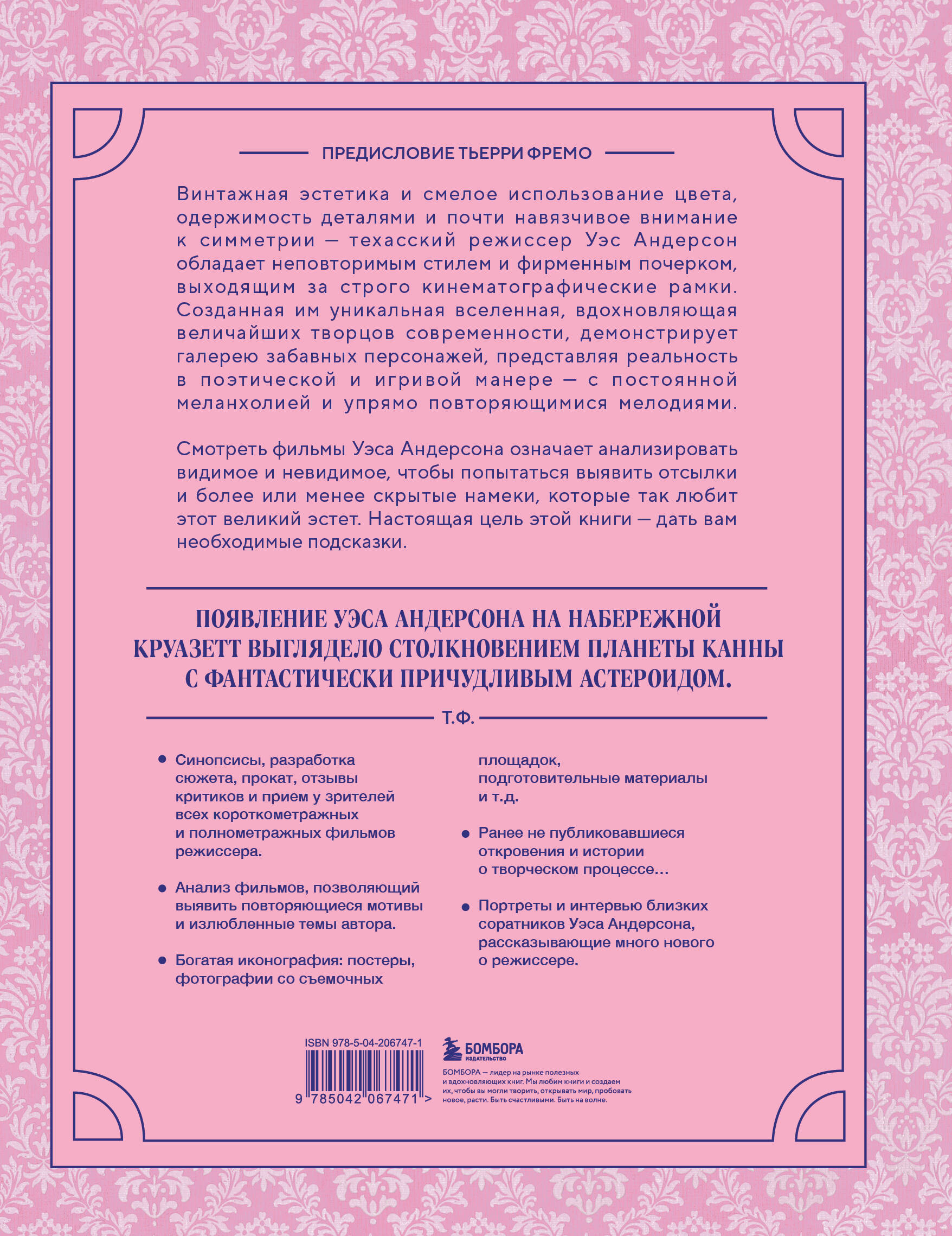 «Мне кажется, что мои фильмы немного сложнее, чем раньше - или, может быть, намного хитрее…» - Уэс Андерсон Уэс Андерсон - один из самых необычных, самобытных и влиятельных режиссеров современного кино. Его фильмы «Королевство полной луны», «Отель "Гранд-Будапешт"» или «Бесподобный мистер Фокс» - феномены, которые мгновенно стали классикой кинематографа. У Андерсона свой уникальный и очень узнаваемый стиль. Даже если вы не знаете, что смотрите его фильм - вам хватит пары минут, чтобы понять - да. Это Уэс! Миры, которые создает Уэс Андерсон, никогда не перестают удивлять и вдохновлять. Любите ли вы его фирменные симметричные кадры, уникальную палитру цветов или сложные действия его эксцентричных персонажей, книга «Уэс Андерсон. Все фильмы. От "Бутылочной ракеты" до "Города астероидов"» станет для вас источником бесконечного вдохновения и эстетического наслаждения. Все его фильмы (и полный метр и короткометражки) здесь, и все разобраны по косточкам! Взгляните на фильмографию Андерсона под новым углом и раскройте секреты создания его невероятных миров. Внутри вас ждет: • История каждого фильма: от идеи до воплощения. • Богатая иконография: постеры, фото со съемок, реквизит. • Интервью с близкими соратниками Уэса Андерсона. • Невиданные ранее откровения: секреты съемок и анекдоты о творческом процессе. Книга напечатана на плотной мелованной бумаге, что позволяет передать всю палитру фильмов режиссера. Кроме прочего, ее будет приятно держать в руках благодаря нежной обложке soft-touch. Также как и Уэс, мы были внимательны к деталям и для удобства чтения добавили ленту-ляссе (цвета сладкой розовой ваты). Позвольте себе роскошь полного погружения во вселенную Уэса Андерсона!| Издательство | ООО "Издательство "Эксмо" |