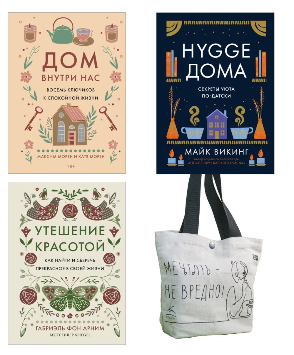 Погрузитесь в мир скандинавского уюта и счастья с нашим уникальным набором книг! Включает 3 книги в подарочном мини-формате в стильном оформлении, наполненных яркими иллюстрациями. Что входит в комплект? 1. «Hygge дома: Секреты уюта по-датски». Открой для себя искусство создания уюта и гармонии по-датски. Позволь своему дому стать островком тепла и комфорта. 2. «Дом внутри нас. Восемь ключиков к спокойной жизни». Вечно занятые бесконечным списком дел, мы не успеваем жить. Загруженность на работе, ссоры с партнером, самообвинение, прокрастинация - все это огромный стресс, от которого хочется сбежать. Катя и Максим Морен предлагают остановиться и с помощью их концепции «дома внутри нас» понять, что с нами происходит. Восемь ключей научат: принимать свои особенности, как Доминик принял СДВГ; уделять себе время для восстановления, как Эммануэль, что минимум 24 часа в месяц посвящает исключительно себе; не брать чужую ответственность, как Шанталь, решившая больше не тащить на себе лишний груз. 3. «Утешение красотой. Как найти и сберечь прекрасное в своей жизни». В этом сборнике эссе немецкая писательница и журналистка Габриэль фон Арним изучает многогранность выдающегося феномена красоты. Погрузитесь в мир автора, созданный из снов, мечтаний и воспоминаний. Найдите тепло и поддержку в чутких и нежных словах, из которых соткана каждая история, и вместе с маленькой девочкой по имени Габриэль научитесь видеть красоту рядом с собой и утешаться ею даже в самые тревожные времена. БОНУС: стильный шоппер «Мечтать не вредно!» с удобной кнопкой. Это не только практичный аксессуар, но и изысканное дополнение к твоему подарку. Этот набор станет отличным подарком на Новый год, День рождения, 14 февраля, 8 марта и другие праздники. Подойдет в качестве подарка мужчине и женщине, коллеге, парню и девушке, маме и папе, любимому человеку, брату и сестре, другу и подруге. Подарок, который вдохновляет: книги, наполненные мудростью, теплом, красотой, психологией, которые помогут сделать жизнь ярче и гармоничнее.| Издательство | КоЛибри |