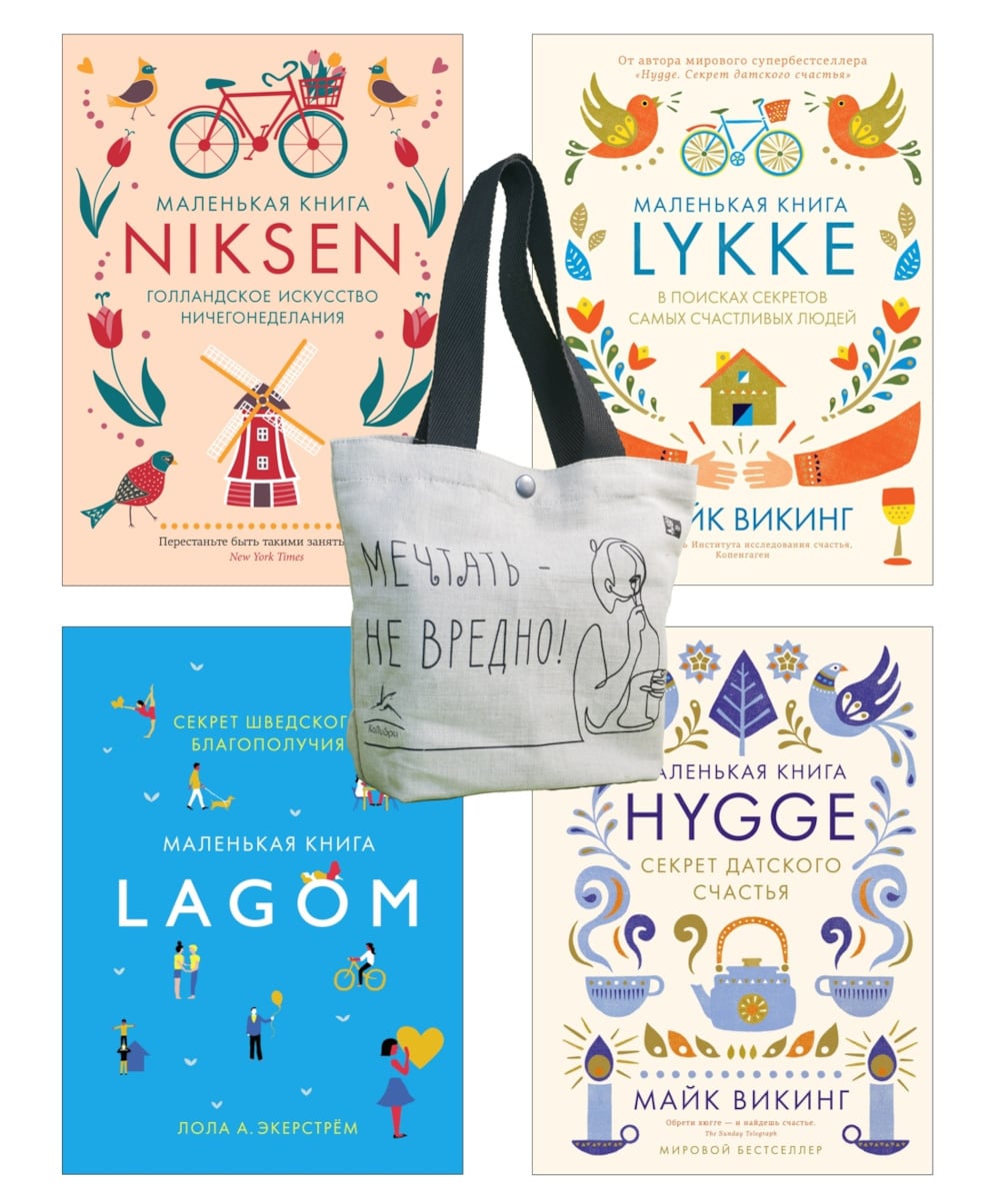 Погрузитесь в мир скандинавского уюта и счастья с нашим уникальным набором книг! Включает 4 книги в подарочном мини-формате в стильном оформлении, наполненных яркими иллюстрациями. Помните о простых радостях жизни: зажгите свечу, сварите кофе, съешьте вкусную булочку, откройте книгу. Ну как? Вам уже лучше? Что входит в комплект? 1. «Hygge: Секрет датского счастья». Откройте для себя магию датского уюта благодаря советам Майка Викинга. Узнайте, как превратить ваше жилье в место, где царят тепло, спокойствие и счастье. Наслаждайтесь своим телом! Катайтесь на велосипеде, бегайте, прыгайте, танцуйте. Стряхните с себя лень и усталость. Подобные занятия не только способствуют выделению эндорфинов, но, к тому же, улучшают внешность, делают ее по-настоящему датской. Помните об эстетике! Сделайте окружающую вас среду максимально комфортной. 2. «Lykke: В поисках секретов самых счастливых людей». Погружение в философию датчан, секреты благополучия и счастья. Простые радости, такие как ароматный кофе и уютная обстановка, помогут вам почувствовать себя по-настоящему счастливым. 3. «Lagom: Секрет шведского благополучия». Изучите шведскую концепцию Lagom - баланс во всём. Насладитесь простыми вещами и научитесь жить в гармонии с собой и окружающим миром. 4. «Маленькая книга Niksen: Голландское искусство ничегонеделания». Освойте искусство отдыха и расслабления по-голландски. Научитесь наслаждаться моментом и получать удовольствие от ничегонеделания. Дополнительный бонус - шоппер «Мечтать не вредно!» с удобной кнопкой: стильный аксессуар, который добавит вашему подарку нотки элегантности и удобства. Этот набор станет отличным подарком на Новый год, День рождения, 14 февраля, 8 марта и другие праздники. Подойдет в качестве подарка мужчине и женщине, коллеге, парню и девушке, маме и папе, любимому человеку, брату и сестре, другу и подруге. Хюгге, Lykke, Lagom и Niksen - четыре ключа к счастью и благополучию.| Издательство | КоЛибри |