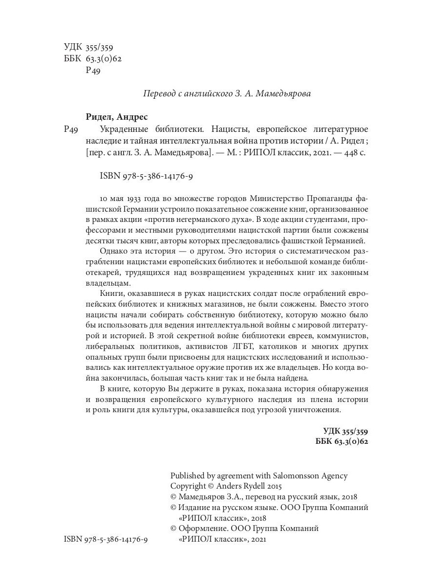 10 мая 1933 года во множестве городов Министерство Пропаганды фашистской Германии устроило показательное сожжение книг, организованное в рамках акции «против негерманского духа». В ходе акции студентами, профессорами и местными руководителями нацистской партии были сожжены десятки тысяч книг, авторы которых преследовались фашисткой Германией. Однако эта история - о другом. Это история о систематическом разграблении нацистами европейских библиотек и небольшой команде библиотекарей, трудящихся над возвращением украденных книг их законным владельцам. Книги, оказавшиеся в руках нацистских солдат после ограблений европейских библиотек и книжных магазинов, не были сожжены. Вместо этого нацисты начали собирать собственную библиотеку, которую можно было бы использовать для ведения интеллектуальной войны с мировой литературой и историей. В этой секретной войне библиотеки евреев, коммунистов, либеральных политиков, активистов ЛГБТ, католиков и многих других опальных групп были присвоены для нацистских исследований и использовались как интеллектуальное оружие против их же владельцев. Но когда война закончилась, большая часть книг так и не была найдена. В книге, которую Вы держите в руках, показана история обнаружения и возвращения европейского культурного наследия из плена истории и роль книги для культуры, оказавшейся под угрозой уничтожения.| Издательство | Рипол Классик |