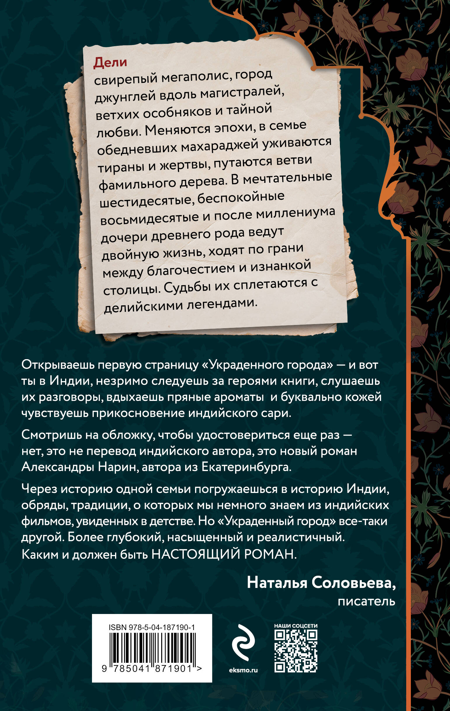 Дели - свирепый мегаполис, город джунглей вдоль магистралей, ветхих особняков и тайной любви. Меняются эпохи, в семье обедневших махараджей уживаются тираны и жертвы, путаются ветви фамильного дерева. В мечтательные шестидесятые, беспокойные восьмидесятые и после миллениума дочери древнего рода ведут двойную жизнь, ходят по грани между благочестием и изнанкой столицы. Судьбы их сплетаются с делийскими легендами. Наталья Соловьева, писатель: «Через историю одной семьи погружаешься в историю Индии, обряды, традиции, о которых мы немного знаем из индийских фильмов, увиденных в детстве. Но "Украденный город" все-таки другой. Более глубокий, насыщенный и реалистичный. Каким и должен быть НАСТОЯЩИЙ РОМАН».| Издательство | ООО "Издательство "Эксмо" |