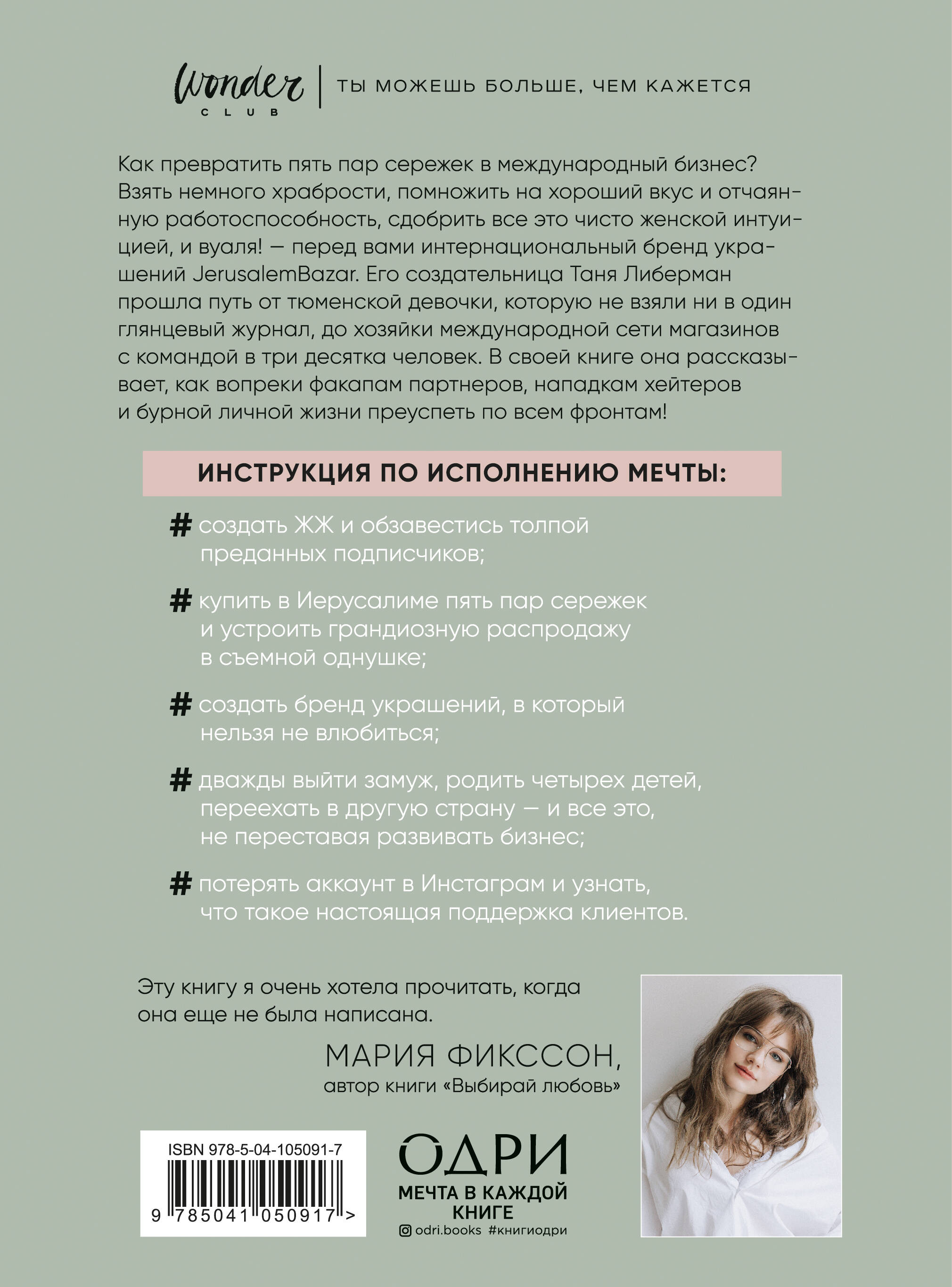 От издателя «Бизнес - это весело и очень азартно», - примерно такую установку транслирует Таня Либерман, которая виртуозно совмещает развитие международного бренда ювелирных украшений и воспитание четырех детей. При этом ведет блог, руководит командой из трех десятков человек в двух странах и активно участвует в создании каждого украшения. В своей книге Таня честно, без фильтров и купюр, рассказывает о превращении тюменской девочки в бизнесвумен с ежемесячным оборотом в пару десятков миллионов рублей. И заодно объясняет, как: - справиться с типичными страхами начинающего бизнесмена; - снизить до минимума риски на старте; - построить личный бренд, который привлечет тысячи клиентов; - начать продавать не столько товар, сколько связанные с ним эмоции и ощущения; - нанять первых сотрудников и построить преданную команду; - выдержать атаки хейтеров, сохранив свой бизнес; - преодолеть болезни роста своего дела; - обрести настоящее счастье, вопреки напряженной работе и нападкам окружающих. Об авторе Предприниматель, создатель бренда ювелирных украшений JerusalemBazar, блогер с армией верных подписчиков, мама четырех детей. Для кого эта книга Для всех, кто создает и развивает свой бизнес или только мечтает о нем. Для тех, кто любит хорошие истории о сильных, умных и целеустремлённых героях. Для бывших, настоящих и будущих подписчиков Тани Либерман.| Издательство | ООО "Издательство "Эксмо" |