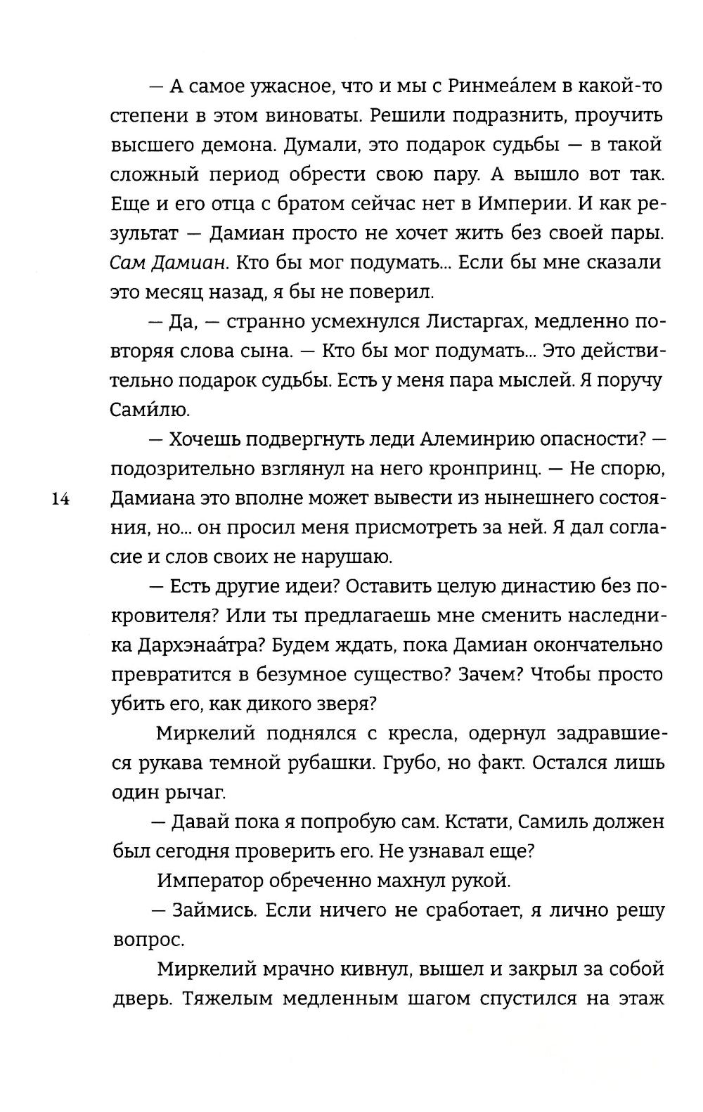 Алеминрия ИуренГаарских знаменита своим хладнокровием и твердым характером. Вечно сдержанная, рассудительная и равнодушная, боевой маг всегда четко знала свою цель - и никогда не ставила чувства выше голоса разума. После ошибок прошлого она так и не научилась снова доверять. Не хотела вновь влюбляться. Однако, когда несносный высший демон снова врывается в ее жизнь, Алеминрия впервые начинает сомневаться - сможет ли она отказаться от него. Ведь, несмотря на поступки и слова, Дамиан Вефириийск - единственный, рядом с кем ее сердце начинает биться быстрее.| Издательство | Мангата |