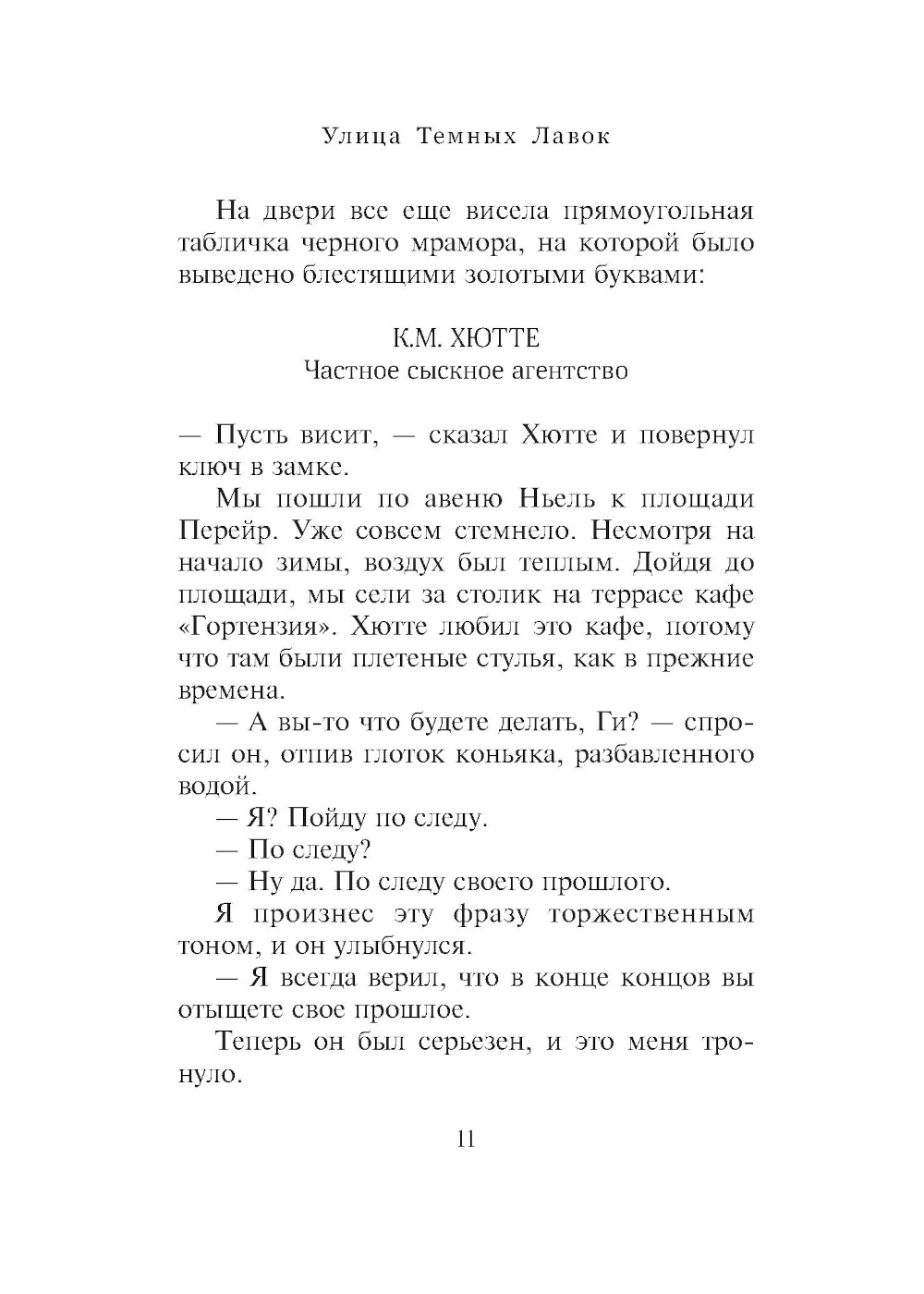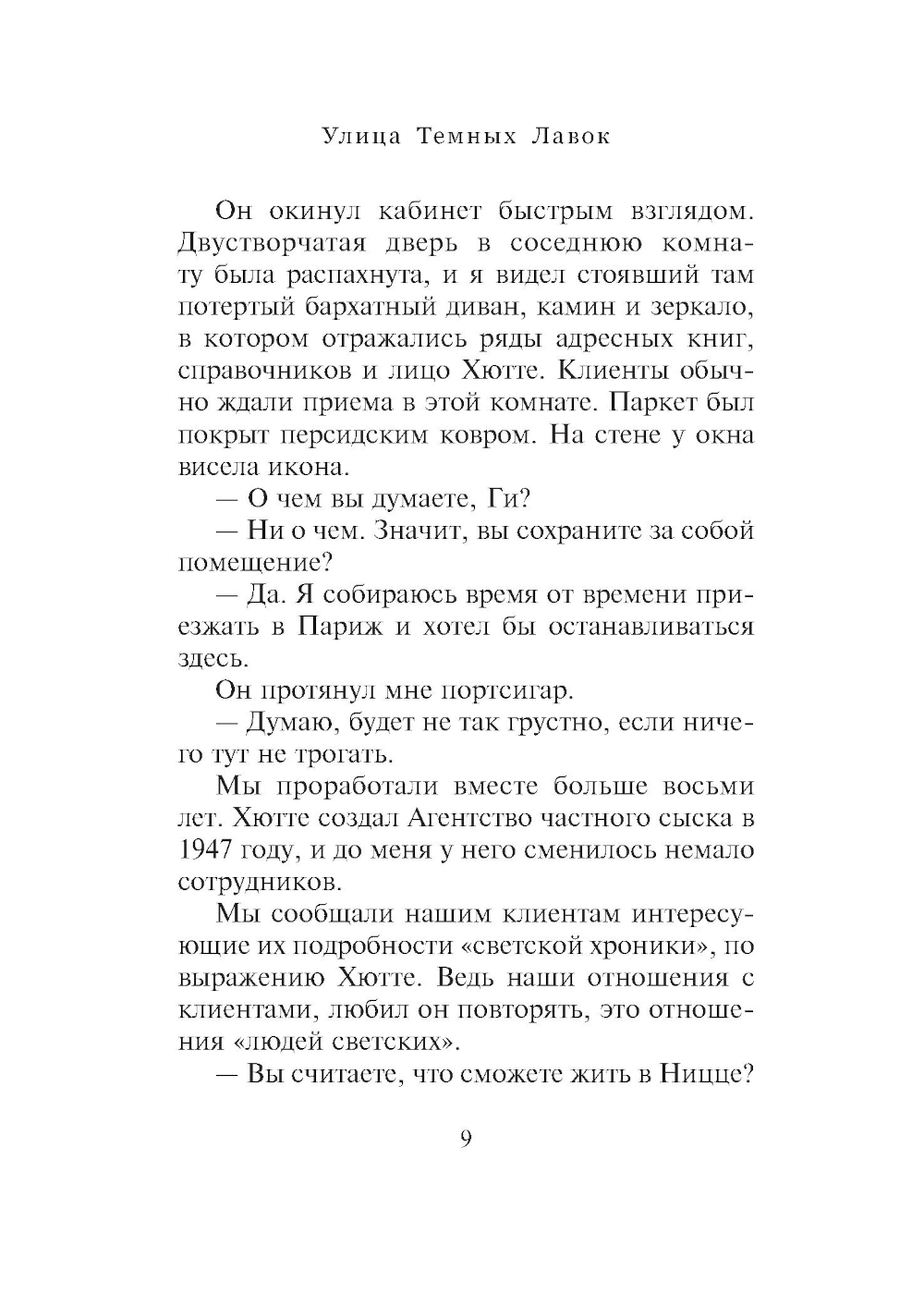 Как и во многих других романах нобелевского лауреата Патрика Модиано, главная тема «Улицы Темных Лавок» - поиск самого себя. У героя романа - серьезное расстройство памяти, он ничего не помнит о прошлой жизни. Даже имени своего он не знает. И все-таки именно через прошлое он пытается понять свое настоящее: кто же он есть на самом деле. Перед нами, если можно так сказать, путешествие по следам собственной жизни в попытке найти самого себя.| Издательство | Текст |