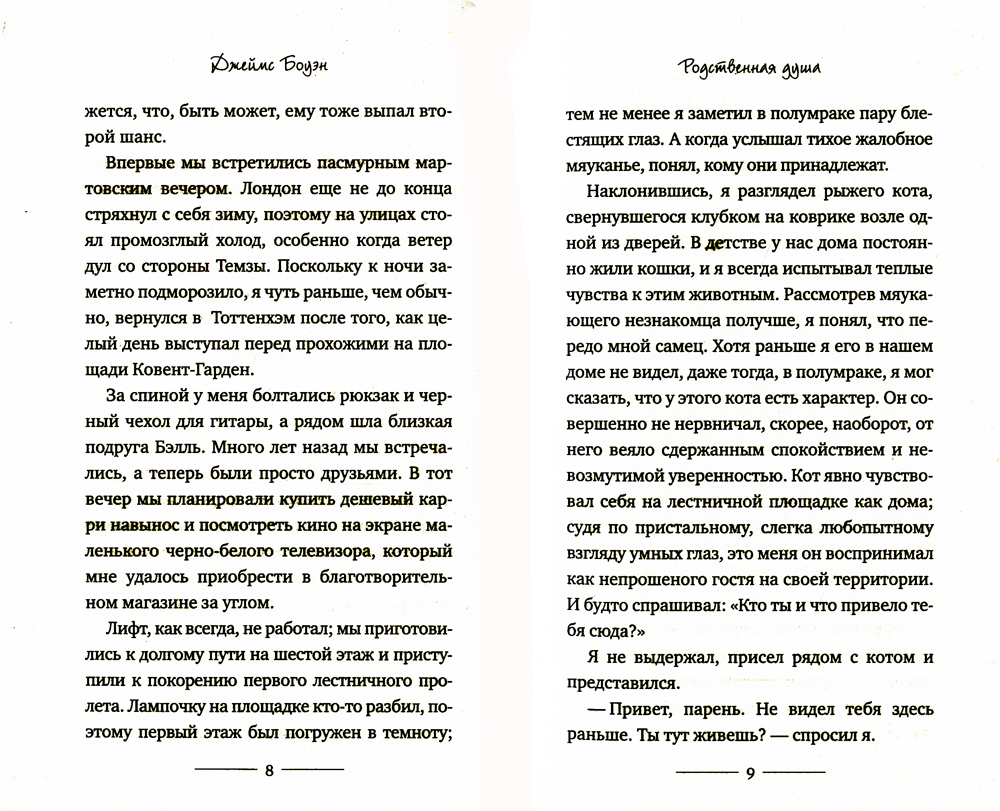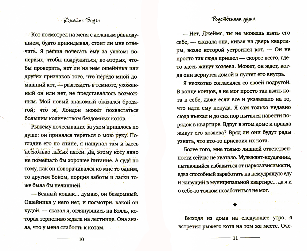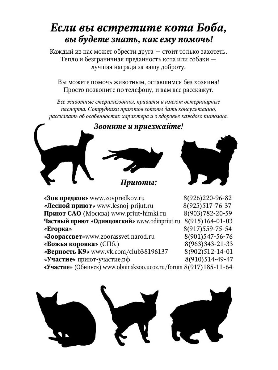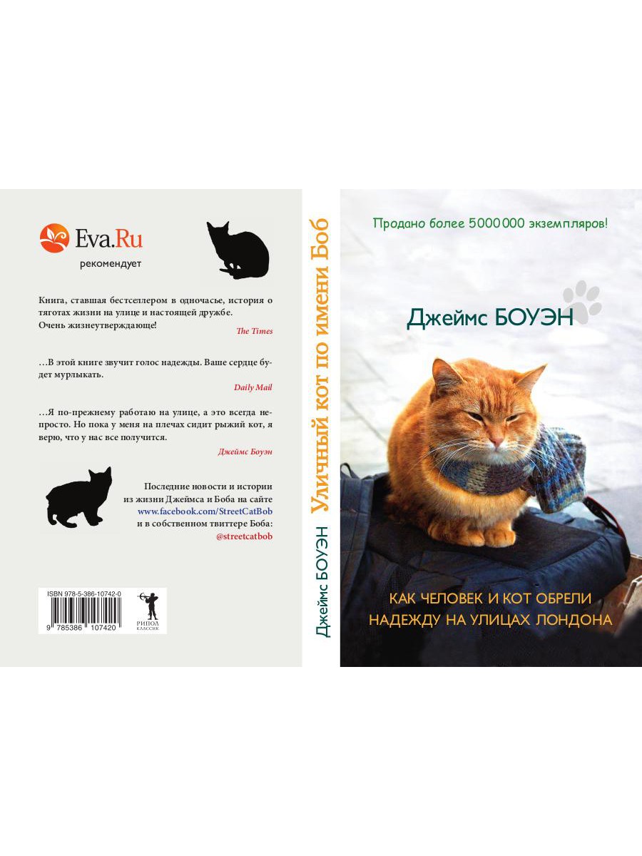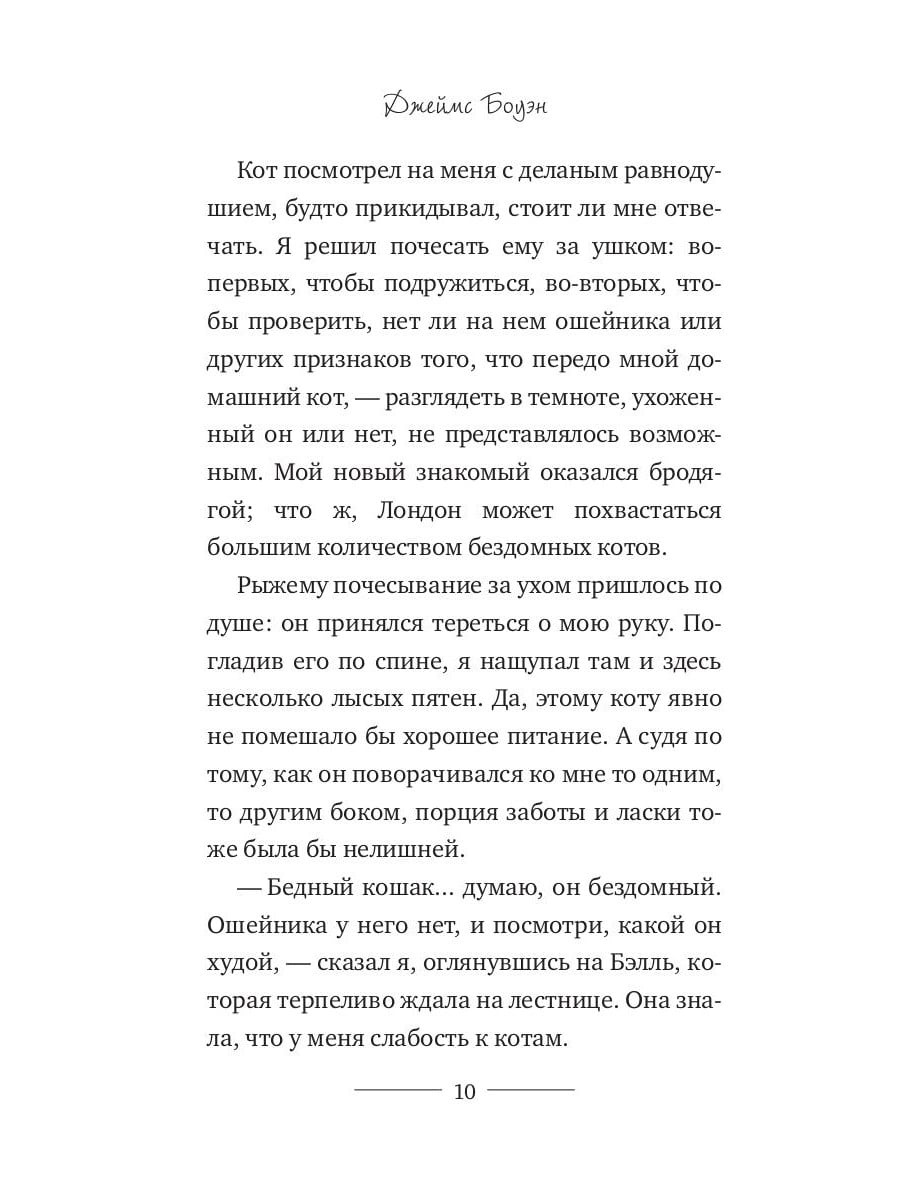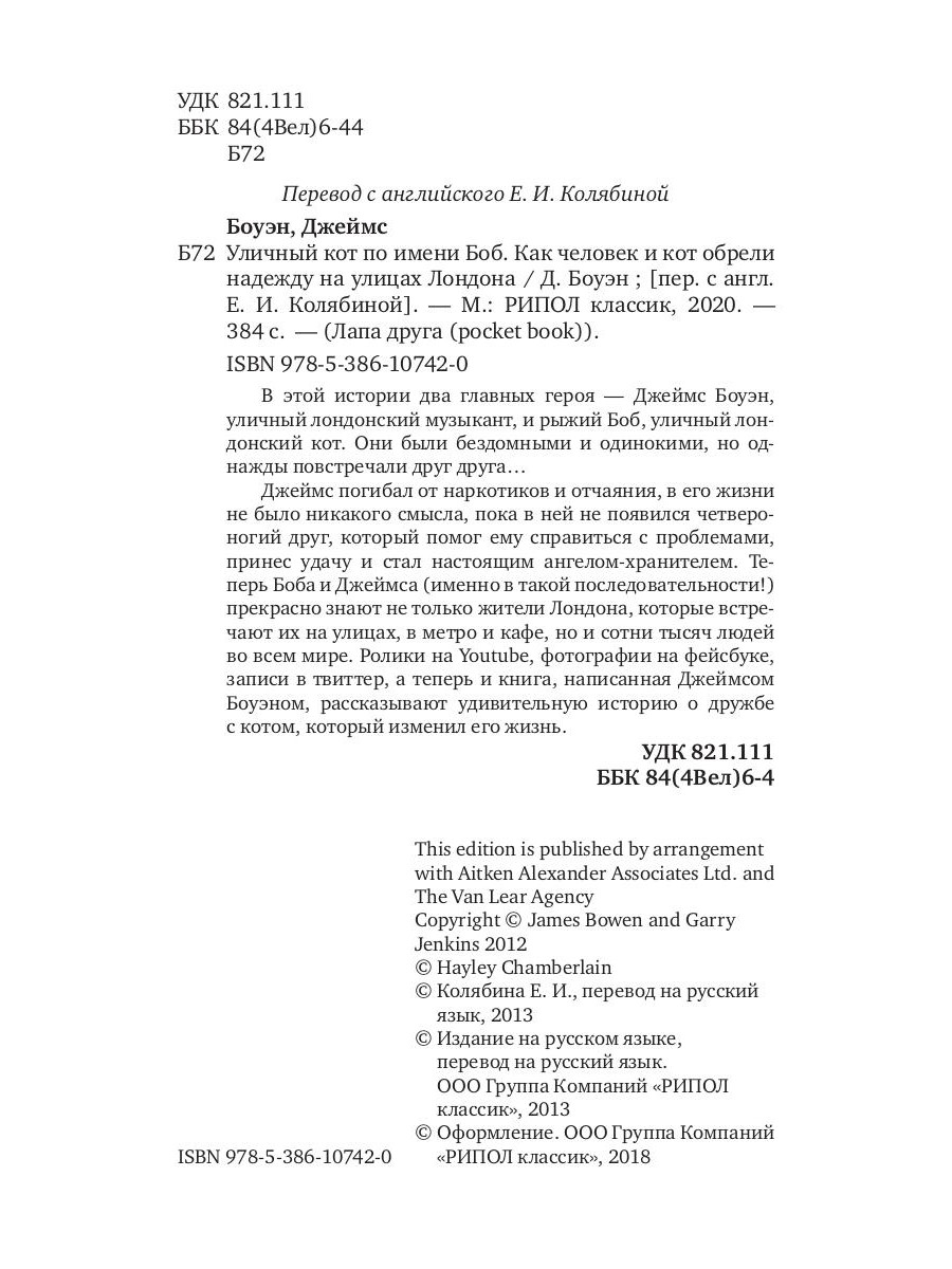 В этой истории два главных героя - Джеймс Боуэн, уличный лондонский музыкант, и рыжий Боб, уличный лондонский кот. Они были бездомными и одинокими, но однажды повстречали друг друга... Джеймс погибал от наркотиков и отчаяния, в его жизни не было никакого смысла, пока в ней не появился четвероногий друг, который помог ему справиться с проблемами, принес удачу и стал настоящим ангелом-хранителем. Теперь Боба и Джеймса (именно в такой последовательности!) прекрасно знают не только жители Лондона, которые встречают их на улицах, в метро и кафе, но и сотни тысяч людей во всем мире. Ролики на Youtube, фотографии на фейсбуке, записи в твиттер, а теперь и книга, написанная Джеймсом Боуэном, рассказывают удивительную историю о дружбе с котом, который изменил его жизнь.| Издательство | Рипол Классик |