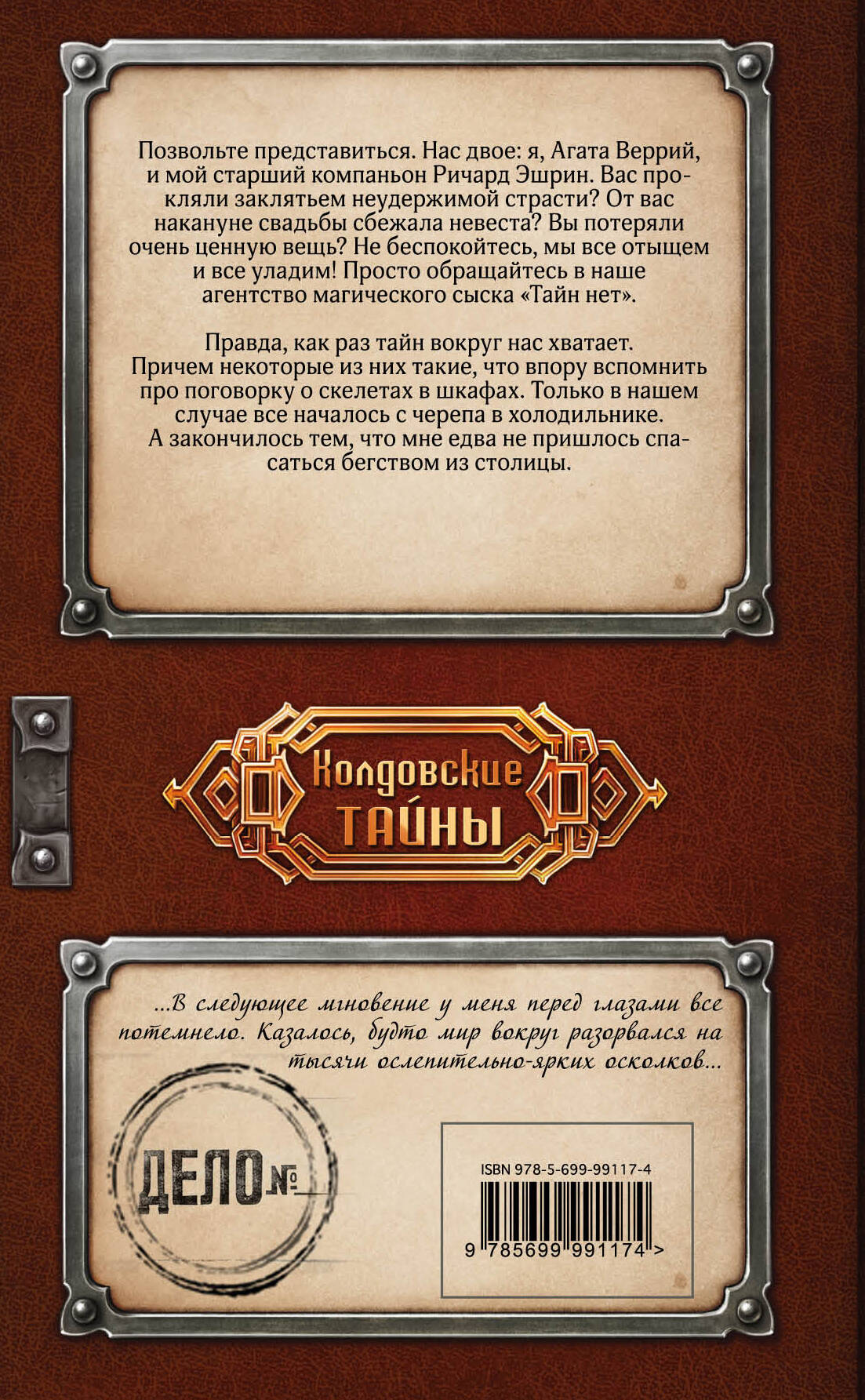 Позвольте представиться. Нас двое: я, Агата Веррий, и мой старший компаньон Ричард Эшрин. Вас прокляли заклятьем неудержимой страсти? От вас накануне свадьбы сбежала невеста? Вы потеряли очень ценную вещь? Не беспокойтесь, мы все отыщем и все уладим! Просто обращайтесь в наше агентство магического сыска "Тайн нет". Правда, как раз тайн вокруг нас хватает. Причем некоторые из них такие, что впору вспомнить про поговорку о скелетах в шкафах. Только в нашем случае все началось с черепа в холодильнике. А закончилось тем, что мне едва не пришлось спасаться бегством из столицы.| Издательство | ООО "Издательство "Эксмо" |