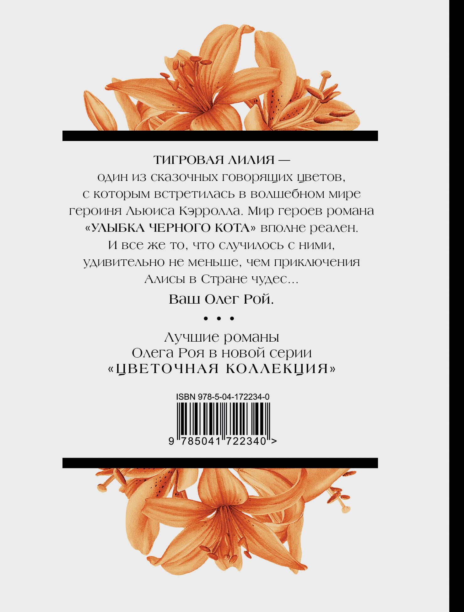 ТИГРОВАЯ ЛИЛИЯ - один из сказочных говорящих цветов, с которым встретилась в волшебном мире героиня Льюиса Кэрролла. Мир героев романа «УЛЫБКА ЧЁРНОГО КОТА» вполне реален. И всё же то, что случилось с ними, удивительно не меньше, чем приключения Алисы в Стране Чудес…| Издательство | ООО "Издательство "Эксмо" |