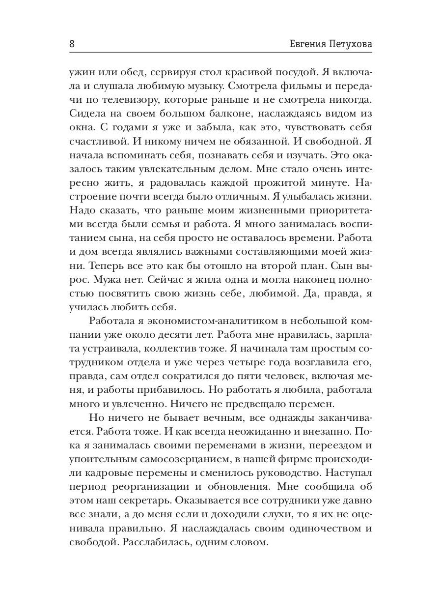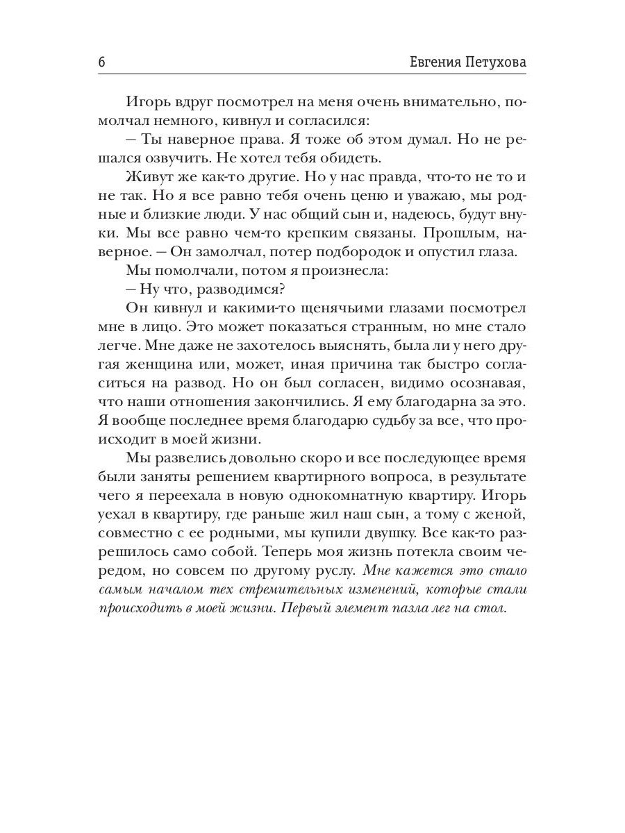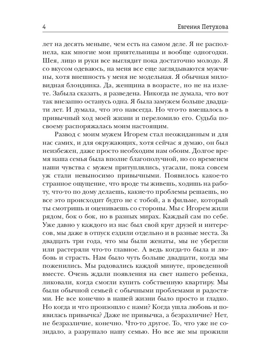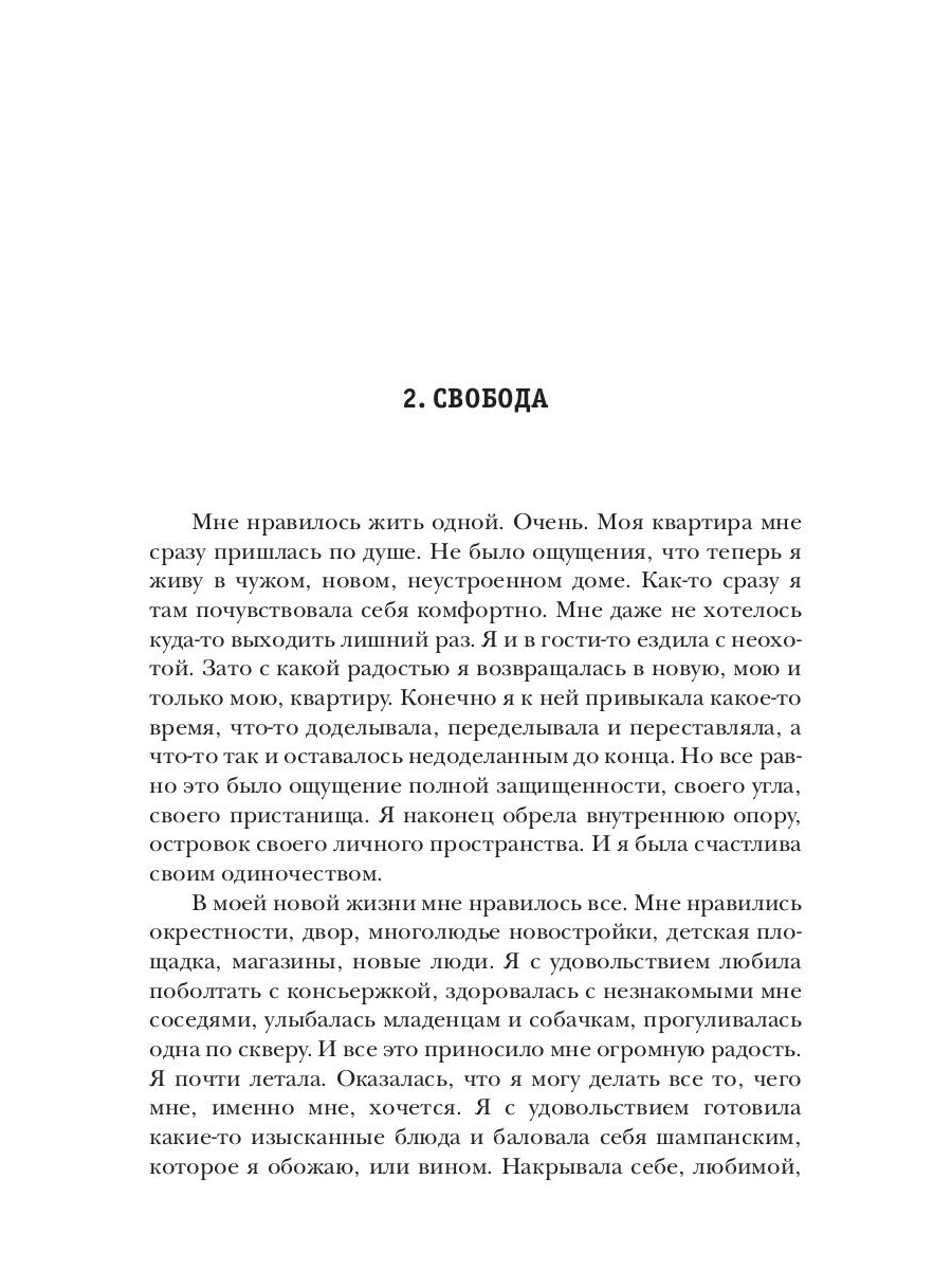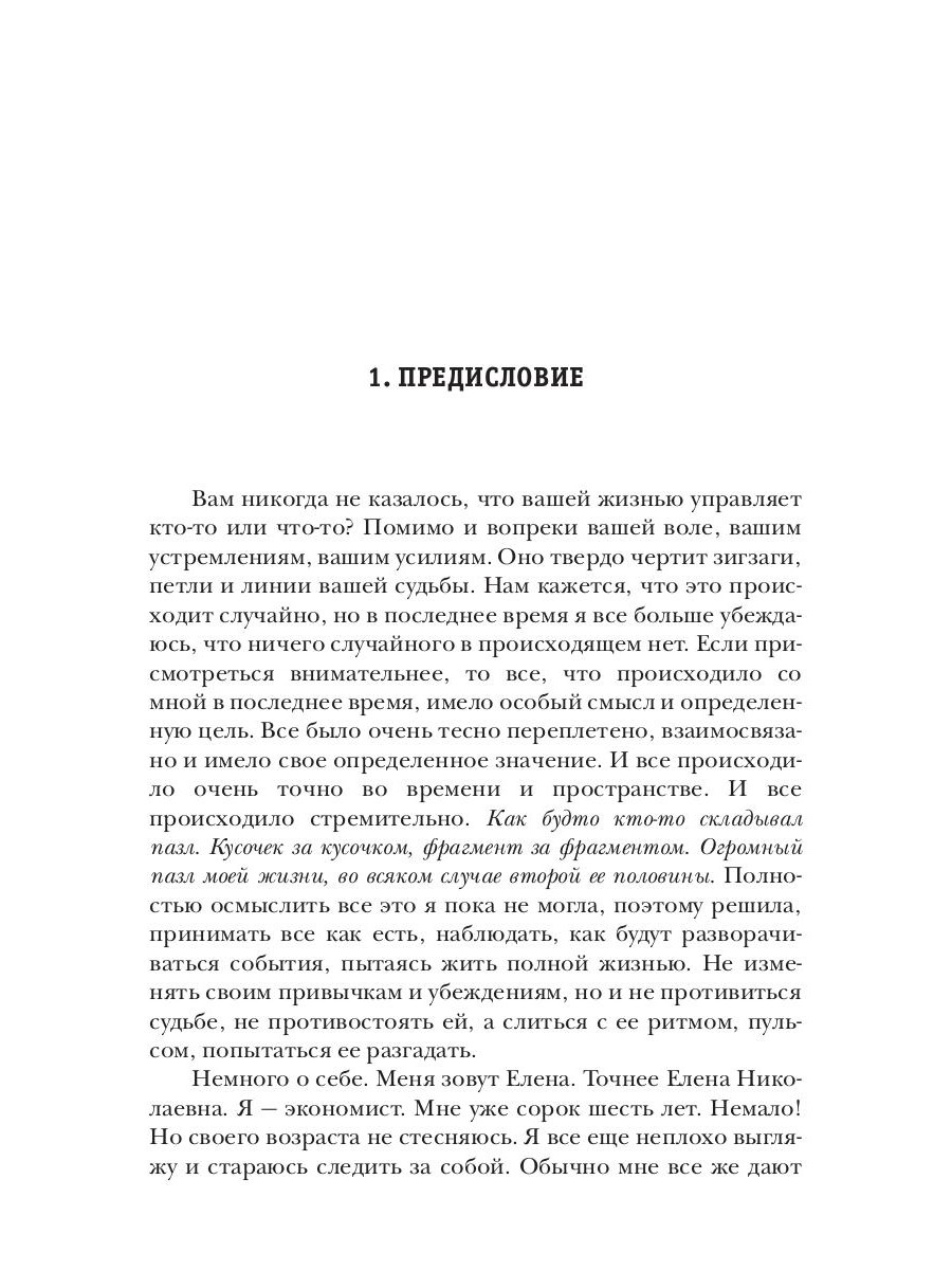 Как приходит любовь? Как определить она ли это? Что чувствует влюбленный человек? Что способен открыть в себе? На что он способен ради любви? На эти и другие вопросы пытается ответить героиня романа Елена. Когда женщине уже за сорок, а за плечами брак и выросшие дети, кажется, что жизнь состоялась, и уже ничего особенного в твоей жизни случиться не может. Но зато теперь много свободного времени, которое можно посвятить самой себе. Что собственно и делает Елена. Она пробует наслаждаться жизнью, прислушиваясь к внутреннему Я. Но когда она сталкивается с сильными чувствами, то сначала не может понять и принять их. Эта книга о том, как совместить мечту и реальность, как оградить свое личное пространство и остаться открытой для любви. Что делать с негативным прошлым и как решать проблемы настоящего, как впустить в себя Любовь, дать ей очередной шанс. Многие найдут ответы на эти животрепещущие вопросы в этой книге.