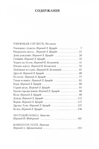 В книгу вошли повести «Честный обман» (1982) и «Каменное поле» (1984), а также сборник коротких рассказов и миниатюр «Умеющая слушать» (1971).