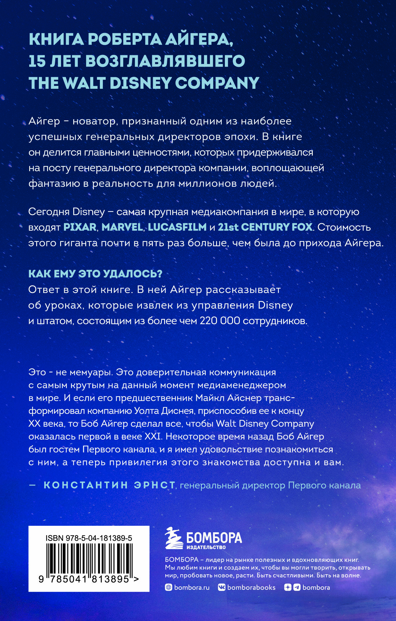 Книга Роберта Айгера, 15 лет возглавлявшего The Walt Disney Company. Айгер - новатор, признанный одним из наиболее успешных генеральных директоров эпохи. В книге он делится главными ценностями, которых придерживался на посту генерального директора компании, воплощающей фантазию в реальность для миллионов людей. Сегодня Disney - самая крупная медиа-компания в мире, в которую входят Pixar, Marvel, Lucasfilm и 21st Century Fox. Стоимость этого гиганта почти в пять раз больше, чем была до прихода Айгера. Как ему это удалось? Ответ в этой книге. В ней Айгер рассказывает об уроках, которые извлек из управления Disney и штатом, состоящим из более чем 220 000 сотрудников. «Это - не мемуары. Это доверительная коммуникация с самым крутым на данный момент медиа-менеджером в мире. И если его предшественник Майкл Айснер трансформировал компанию Уолта Диснея, приспособив ее к концу XX века, то Боб Айгер сделал все, чтобы Walt Disney Company оказалась первой в веке XXI. Некоторое время назад Боб Айгер был гостем Первого канала, и я имел удовольствие познакомиться с ним, а теперь привилегия этого знакомства доступна и вам». - Константин Эрнст, генеральный директор Первого канала| Издательство | ООО "Издательство "Эксмо" |
