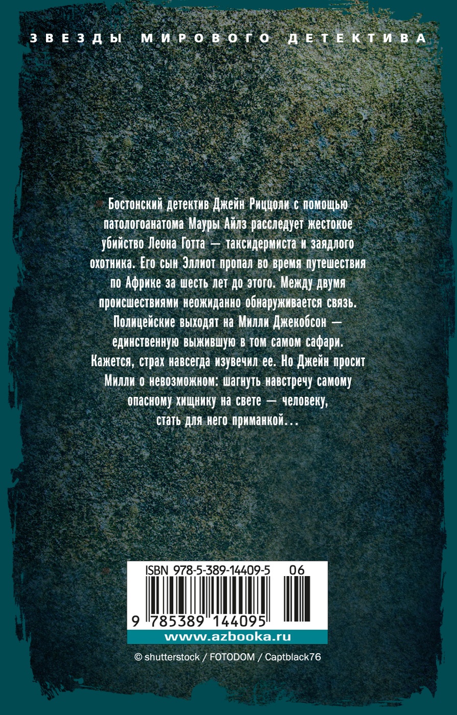 Бостонский детектив Джейн Риццоли с помощью патологоанатома Мауры Айлз расследует жестокое убийство Леона Готта - таксидермиста и заядлого охотника. Его сын Эллиот пропал во время путешествия по Африке за шесть лет до этого. Между двумя происшествиями неожиданно обнаруживается связь. Полицейские выходят на Милли Джекобсон - единственную выжившую в том самом сафари. Кажется, страх навсегда изувечил ее. Но Джейн просит Милли о невозможном: шагнуть навстречу самому опасному хищнику на свете - человеку, стать для него приманкой…| Издательство | Азбука |