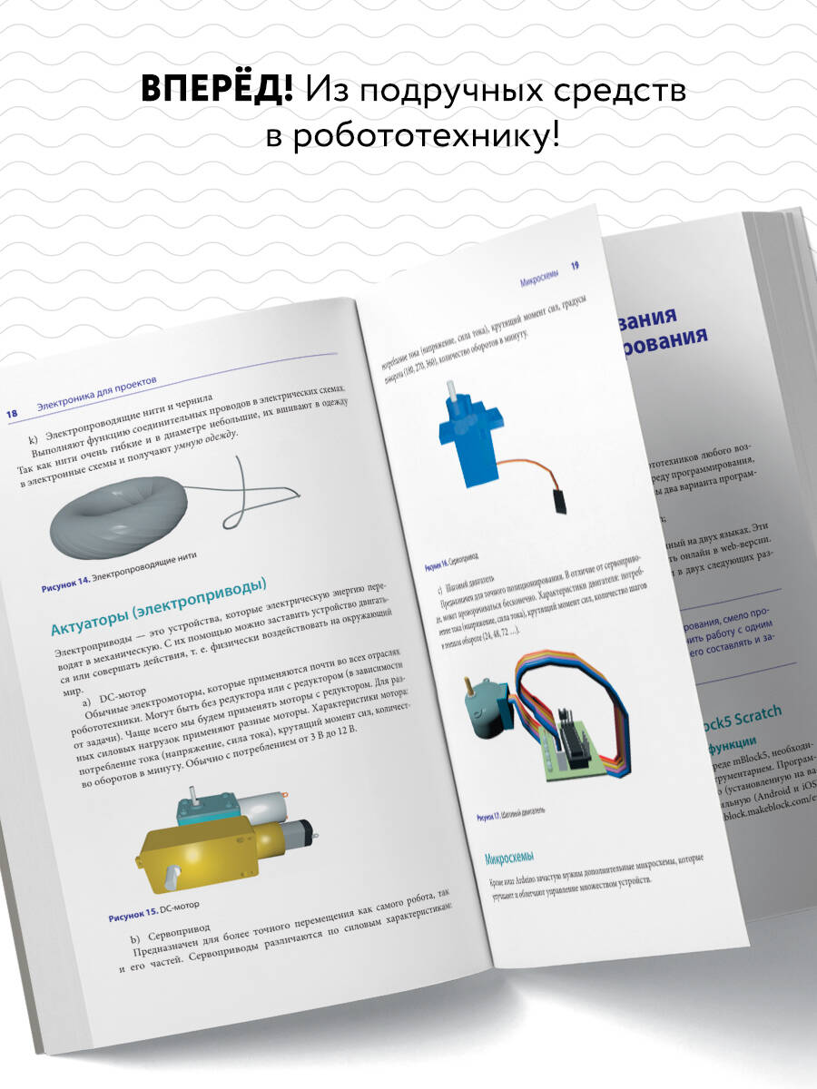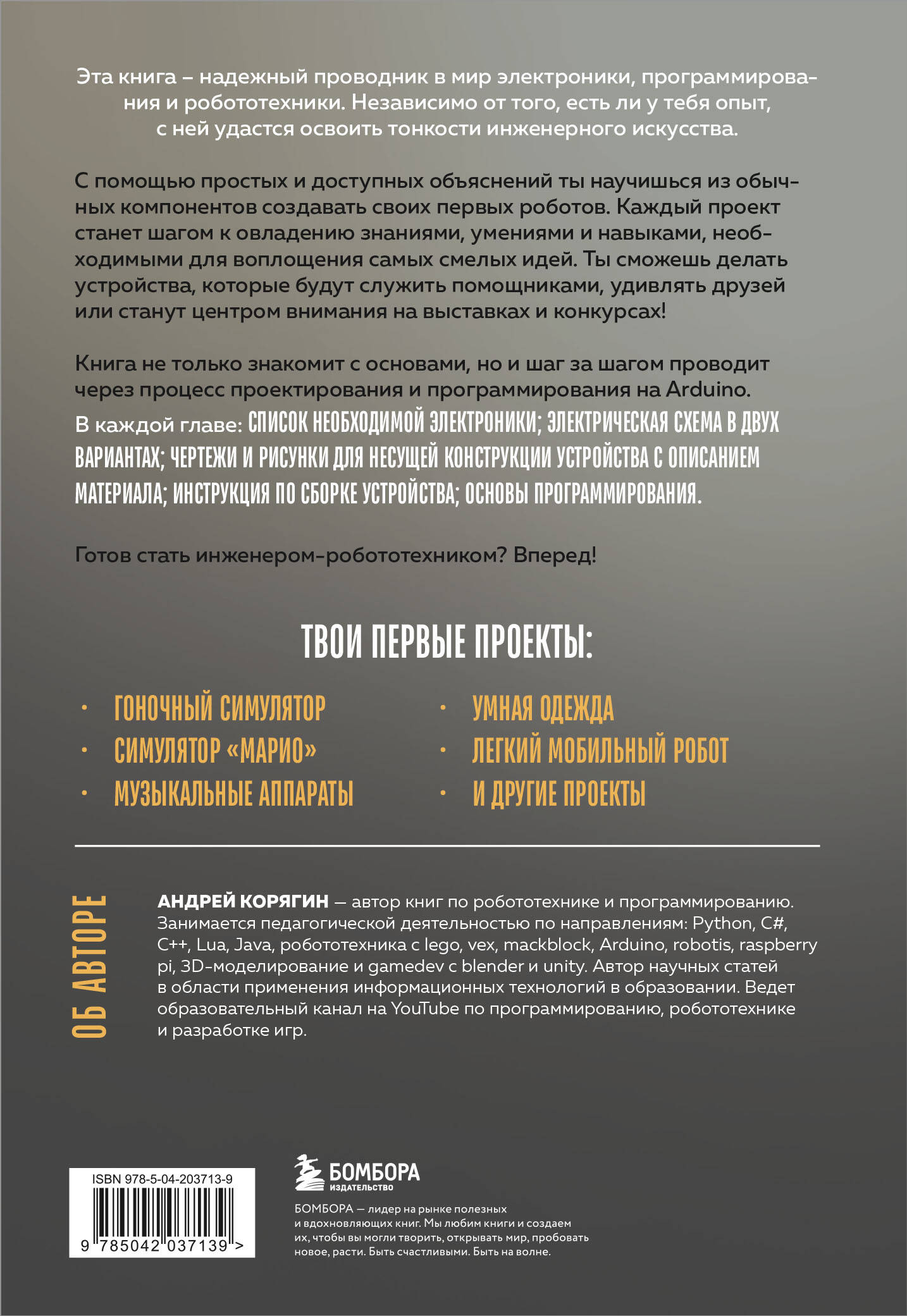 Эта книга - надежный проводник в мир электроники, программирования и робототехники. Независимо от того, есть ли у тебя опыт, с ней удастся освоить тонкости инженерного искусства. С помощью простых и доступных объяснений ты научишься из обычных компонентов создавать своих первых роботов. Каждый проект станет шагом к овладению знаниями, умениями и навыками, необходимыми для воплощения самых смелых идей. Ты сможешь делать устройства, которые будут служить помощниками, удивлять друзей или станут центром внимания на выставках и конкурсах! Книга не только знакомит с основами, но и шаг за шагом проводит через процесс проектирования и программирования на Arduino. В каждой главе: список необходимой электроники; электрическая схема в двух вариантах; чертежи и рисунки для несущей конструкции устройства с описанием материала; инструкция по сборке устройства; основы программирования. Готов стать инженером-робототехником? Вперед!| Издательство | ООО "Издательство "Эксмо" |