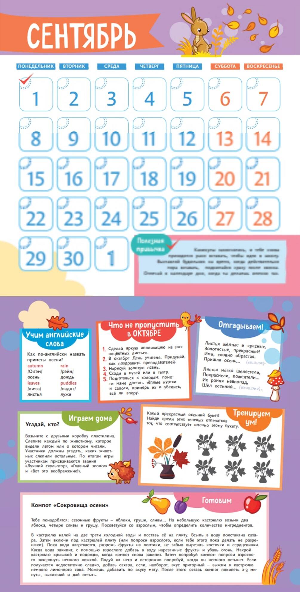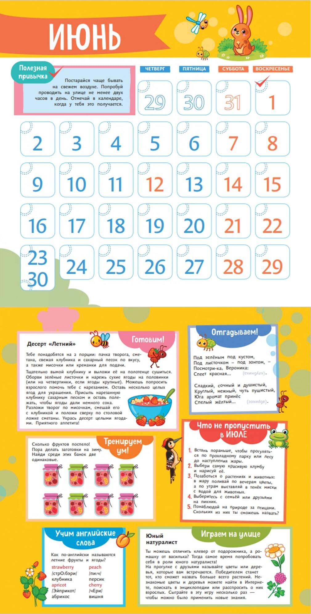 Не знаете, чем занять ребёнка долгим декабрьским вечером? Или как весело провести длинные летние каникулы? В этом календаре собраны различные советы на каждый месяц года - занятия дома и на улице, поделки и игры с друзьями, рецепты и логические задания. А благодаря ежедневному трекеру ребенок сможет выработать полезные привычки, такие как зарядка, чистка зубов на ночь или уборка в комнате.| Издательство | ООО "Издательство "Эксмо" |