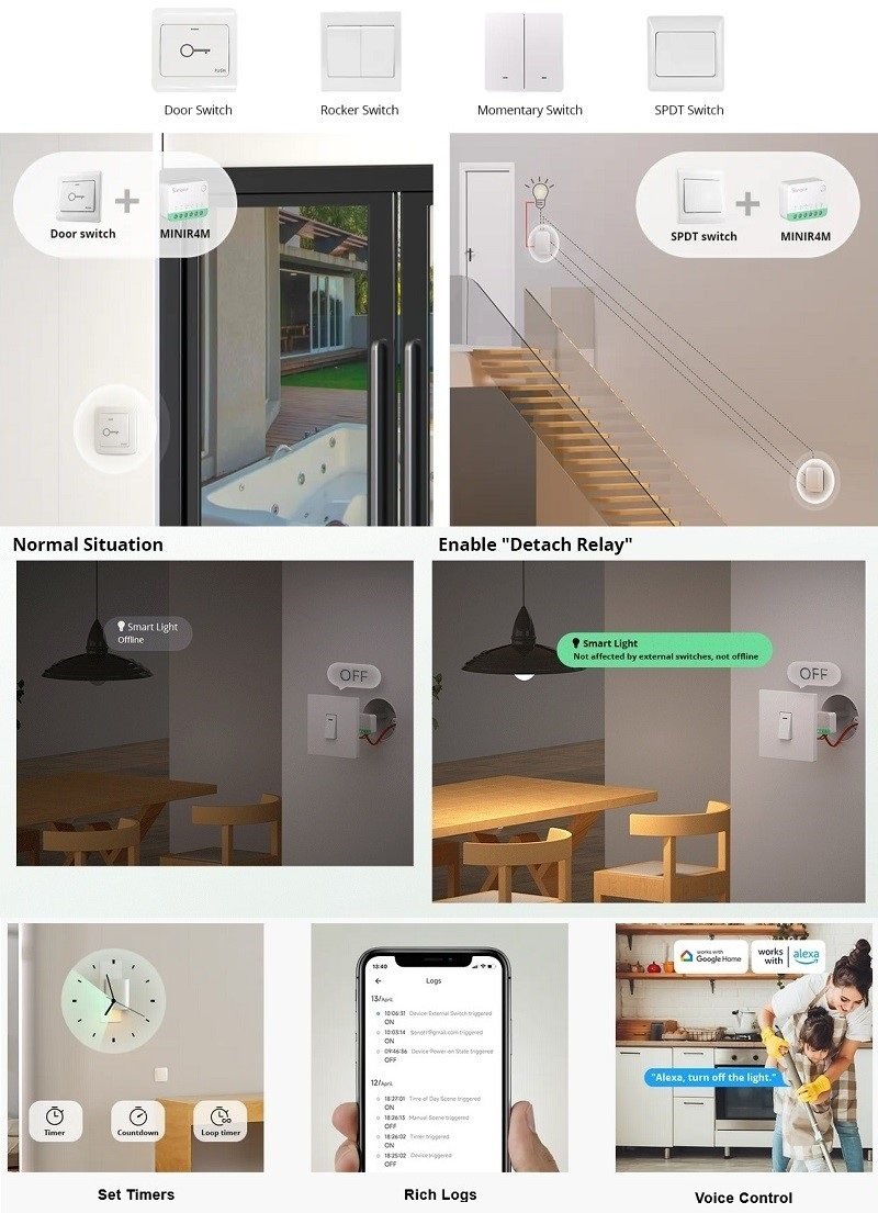<p data-start="156" data-end="333"><strong data-start="156" data-end="218">Умный одноканальный выключатель (реле) для электроприборов</strong>. Поддерживает удалённое управление по Wi-Fi 2,4 ГГц, подходит для различных бытовых устройств, совместим с Matter.</p><br /> <p data-start="335" data-end="904">Система умного дома <strong data-start="355" data-end="365">SONOFF</strong> позволяет управлять электроприборами удалённо через приложение <strong data-start="429" data-end="440">eWeLink</strong> или голосом через <strong data-start="459" data-end="475">Amazon Alexa</strong> и <strong data-start="478" data-end="493">Google Home</strong>. Вы можете создавать сценарии, объединять устройства в группы (включать/выключать сразу несколько одним нажатием), настраивать таймеры и расписания, отслеживать статус устройств в реальном времени и делиться доступом к управлению. Подключите eWeLink к <strong data-start="746" data-end="755">IFTTT</strong>, чтобы расширить возможности автоматизации. Благодаря настраиваемой локальной поддержке <strong data-start="844" data-end="851">LAN</strong> система SONOFF может работать без облачного сервера.</p><br /> <h3 data-start="906" data-end="921">Особенности</h3><br /> <ul data-start="922" data-end="2814"><br /> <li data-start="922" data-end="1069"><br /> <p data-start="924" data-end="1069">Удалённое управление через приложение <strong data-start="962" data-end="973">eWeLink</strong> (Android, iOS) или подключение по <strong data-start="1008" data-end="1018">Matter</strong> с использованием приложений, совместимых с Matter.</p><br /> </li><br /> <li data-start="1070" data-end="1204"><br /> <p data-start="1072" data-end="1204">Сертификация <strong data-start="1085" data-end="1095">Matter</strong> обеспечивает совместимость с разными устройствами и платформами: <strong data-start="1161" data-end="1170">Alexa</strong>, <strong data-start="1172" data-end="1186">Apple Home</strong>, <strong data-start="1188" data-end="1203">Google Home</strong>.</p><br /> </li><br /> <li data-start="1205" data-end="1311"><br /> <p data-start="1207" data-end="1311">Передача сигнала реле по <strong data-start="1232" data-end="1249">Wi-Fi 2,4 ГГц</strong> (сеть 5 ГГц не поддерживается). Поддерживается режим <strong data-start="1303" data-end="1310">LAN</strong>.</p><br /> </li><br /> <li data-start="1312" data-end="1408"><br /> <p data-start="1314" data-end="1408">Версия <strong data-start="1321" data-end="1327">R4</strong>: улучшенное качество исполнения, процессор <strong data-start="1371" data-end="1380">ESP32</strong> с поддержкой <strong data-start="1394" data-end="1407">Bluetooth</strong>.</p><br /> </li><br /> <li data-start="1409" data-end="1659"><br /> <p data-start="1411" data-end="1659"><strong data-start="1411" data-end="1422">MINI R4</strong> также называют <em data-start="1438" data-end="1459">Sonoff Mini Extreme</em> - поддерживает управление внешним выключателем. Легко подключается к кнопке (momentary), дверной кнопке выхода, переключателю <strong data-start="1586" data-end="1594">SPDT</strong>, фиксируемому выключателю, а также датчикам с «сухим контактом».</p><br /> </li><br /> <li data-start="1660" data-end="1769"><br /> <p data-start="1662" data-end="1769">Можно подключить пару проходных (2-way) выключателей, чтобы включать/выключать свет внизу с верхнего этажа.</p><br /> </li><br /> <li data-start="1770" data-end="2008"><br /> <p data-start="1772" data-end="2008">В сочетании с <strong data-start="1786" data-end="1803">Sonoff S-MATE</strong> модуль <strong data-start="1811" data-end="1821">MINIR4</strong> может управляться локально по сигналу <strong data-start="1860" data-end="1878">eWeLink-Remote</strong> на расстоянии до <strong data-start="1896" data-end="1904">50 м</strong> (в открытом пространстве) и запускать другие устройства в сценариях. <strong data-start="1974" data-end="2007">S-MATE приобретается отдельно</strong>.</p><br /> </li><br /> <li data-start="2009" data-end="2255"><br /> <p data-start="2011" data-end="2255">Новая функция MINI R4 - режим <strong data-start="2041" data-end="2057">Detach Relay</strong>: состояние внешнего выключателя и реле разделены, поэтому нажатие внешней кнопки не меняет состояние реле. При этом внешний выключатель можно использовать для запуска сценария или группы устройств.</p><br /> </li><br /> <li data-start="2256" data-end="2413"><br /> <p data-start="2258" data-end="2413">Поддерживает: включение/выключение, поведение при подаче питания (вкл./выкл./запоминание посл