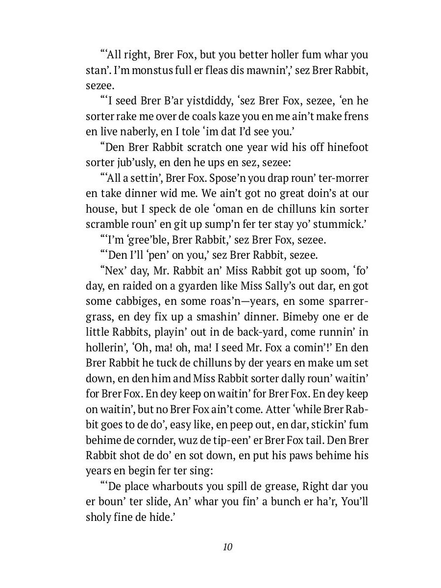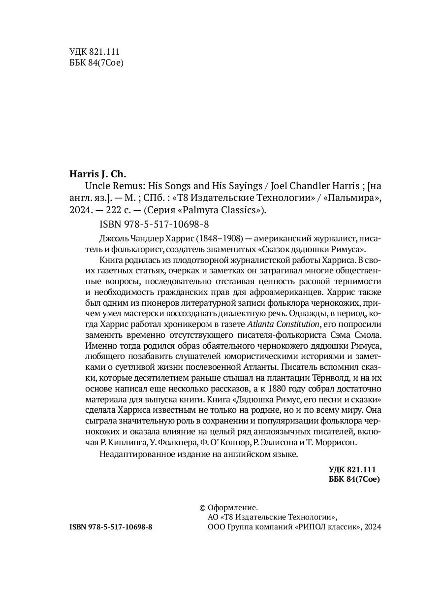 Джоэль Чандлер Харрис (1848-1908) - американский журналист, писатель и фольклорист, создатель знаменитых «Сказок дядюшки Римуса». Книга родилась из плодотворной журналистской работы Харриса. В своих газетных статьях, очерках и заметках он затрагивал многие общественные вопросы, последовательно отстаивая ценность расовой терпимости и необходимость гражданских прав для афроамериканцев. Харрис также был одним из пионеров литературной записи фольклора чернокожих, причем умел мастерски воссоздавать диалектную речь. Однажды, в период, когда Харрис работал хроникером в газете Atlanta Constitution, его попросили заменить временно отсутствующего писателя-фолькориста Сэма Смола. Именно тогда родился образ обаятельного чернокожего дядюшки Римуса, любящего позабавить слушателей юмористическими историями и заметками о суетливой жизни послевоенной Атланты. Писатель вспомнил сказки, которые десятилетием раньше слышал на плантации Тёрнволд, и на их основе написал еще несколько рассказов, а к 1880 году собрал достаточно материала для выпуска книги. Книга «Дядюшка Римус, его песни и сказки» сделала Харриса известным не только на родине, но и по всему миру. Она сыграла значительную роль в сохранении и популяризации фольклора чернокожих и оказала влияние на целый ряд англоязычных писателей, включая Р. Киплинга,У. Фолкнера, Ф. О'Коннор, Р. Эллисона и Т. Моррисон. Неадаптированное издание на английском языке.| Издательство | Т8 RUGRAM |