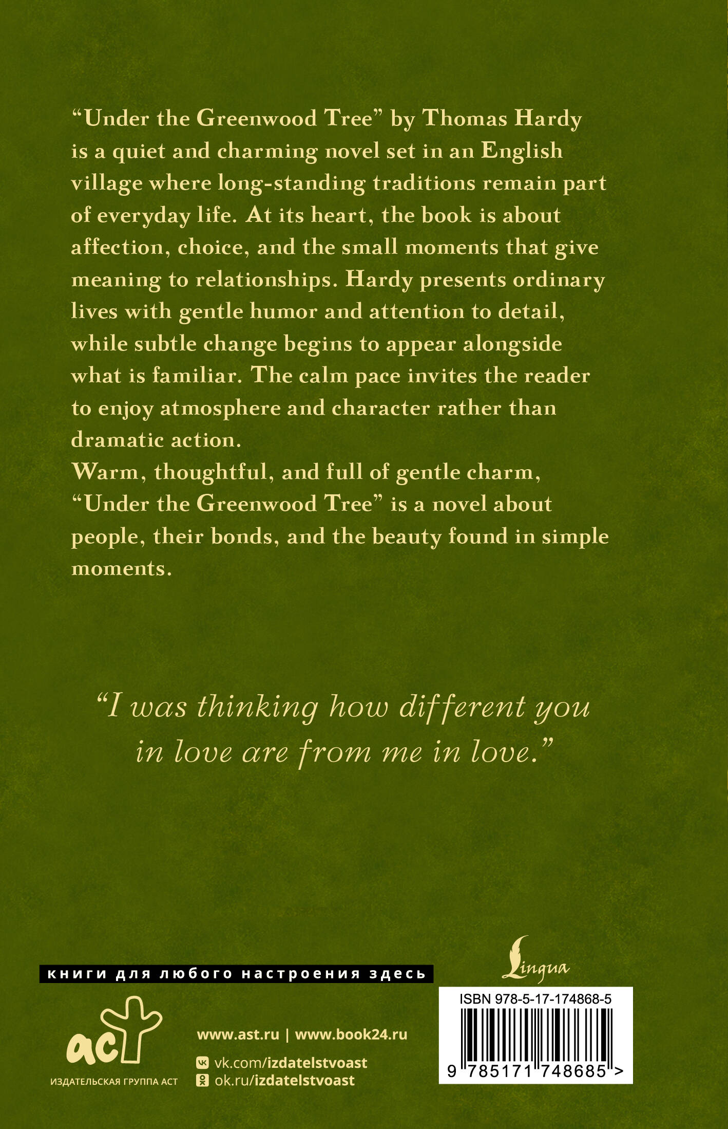 Под покровом густой зелени старого дерева живёт уютный мирок маленькой деревни, где всё дышит покоем: здесь по утрам разносится запах тёплого хлеба, по вечерам звучат песни хористов, а жители свято хранят свои давние традиции. Но вместе с юной учительницей Фэнси Дэй в Мелсток приходит перемена - тихая, едва ощутимая, словно свежий ветер. В сердце Дика Дьюи рождается робкое чувство, и деревня постепенно наполняется напряжением ожидания: надежды сталкиваются с амбициями, а светлая влюблённость сплетается с ревностью и тайными мечтами. Погрузитесь в тёплый, жизнерадостный роман Томаса Харди и откройте мир, где красота природы сплетается с человеческими сердцами. Читайте оригинальный текст без сокращений и адаптации!| Издательство | Издательство "АСТ" |