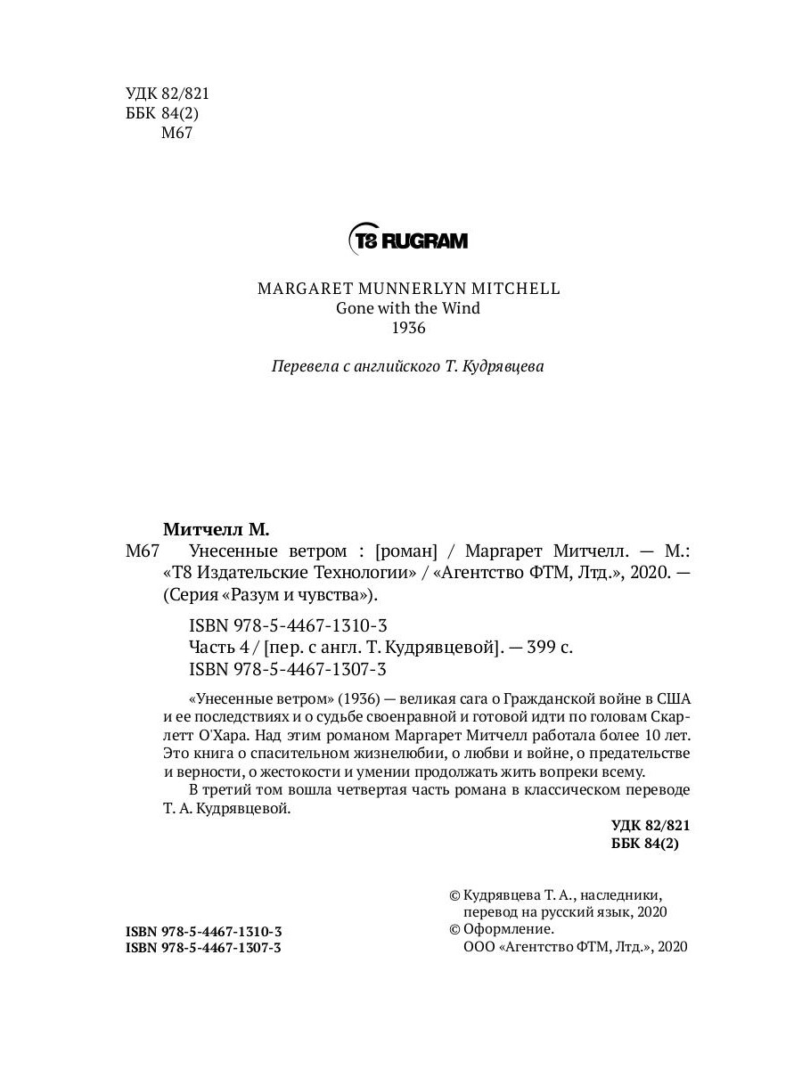 «Унесенные ветром» (1936) - великая сага о Гражданской войне в США и ее последствиях и о судьбе своенравной и готовой идти по головам Скарлетт О'Хара. Над этим романом Маргарет Митчелл работала более 10 лет. Это книга о спасительном жизнелюбии, о любви и войне, о предательстве и верности, о жестокости и умении продолжать жить вопреки всему. В третий том вошла четвертая часть романа в классическом переводе Т. А. Кудрявцевой.| Издательство | Т8 RUGRAM |