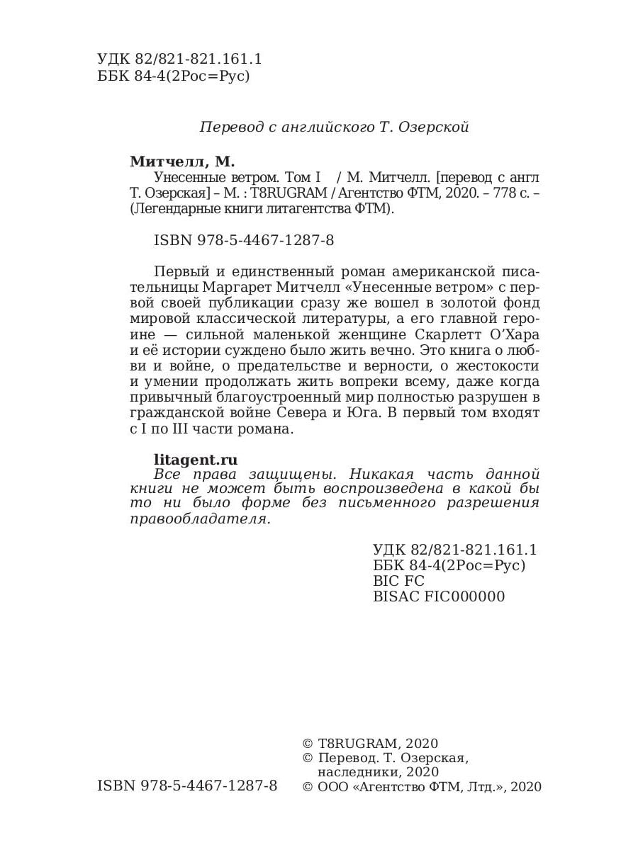 Первый и единственный роман американской писательницы Маргарет Митчелл «Унесенные ветром» с первой своей публикации сразу же вошел в золотой фонд мировой классической литературы, а его главной героине - сильной маленькой женщине Скарлетт О'Хара и её истории суждено было жить вечно. Это книга о любви и войне, о предательстве и верности, о жестокости и умении продолжать жить вопреки всему, даже когда привычный благоустроенный мир полностью разрушен в гражданской войне Севера и Юга. В первый том входят с I по III части романа.| Издательство | Т8 RUGRAM |