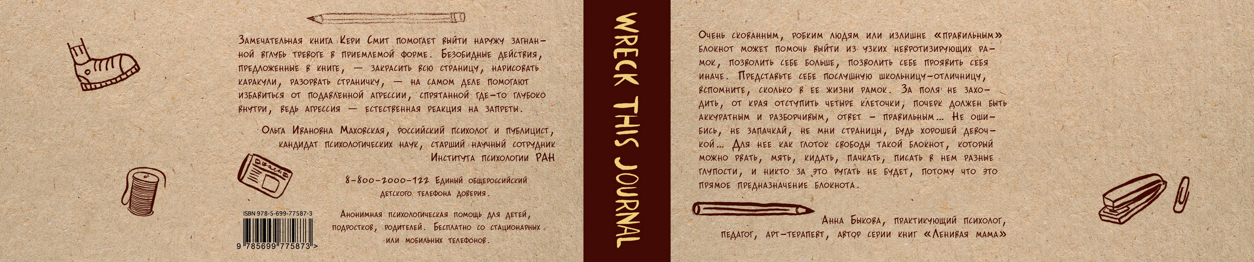 О чем эта книга Перед вами книга-сенсация, проданная миллионными тиражами по всему миру. Поздравляем, теперь и вы сможете приобщиться к разрушительному творчеству Кери Смит! На страницах нашего блокнота вы найдете множество способов уничтожения, а вскоре начнете изобретать и свои собственные! Развивайте креативность, не бойтесь экспериментировать, сделайте то, на что никогда раньше не решались! Для кого Для креативных и молодых. Для веселых компаний. В подарок лучшему другу Фишки Мировой бестселлер. Развивает творческий подход. Помогает преодолеть страх перед пустой страницей. Бесконечный простор для креатива! Отзывы «Не важно, где вы начнете и закончите - эта книга всегда сможет удивить вас...» - Buffalo news «Обожаю! Особенно весело "уничтожать" этот блокнот в компании друзей)». - Дэниел Хэззел «Потрясающе! Подарила лучшей подруге на Рождество, а потом и себе купила))». - Леа Кэмпбелл «Идея создания такого дневника просто клевая! Получая возможность выплескивать негативные эмоции, да и эмоции вообще, в творчестве, ты получаешь еще бонусом возможность выразить свою индивидуальность и переключить с мысли, переживания на созидание. Короче, респект автору идеи». - Анет «Скажите, кто в детстве не хотел порвать книжку, порисовать в ней и сделать много разных "неприличностей", которые нам упорно запрещали родители? Сразу хочу сказать - это не книга. Это целый мир. Вот ты берешь в руки этот блокнот, открываешь, чувствуешь, как хрустят новые страницы и обложка (моя русская версия этого wreck this journal в красной обложке). Когда ты делаешь задания, черным по белому написанные в этой книжке, ты понимаешь, какое удовольствие в разрушении. "Вырви страницу и скомкай ее"? Да без проблем, если честно, давно руки чесались. "Прорежь несколько страниц"? Еще лучше. "Сломай корешок, оторви форзац книги и повесь его на стену"? Чудесно! "Размажь здесь свой кофе, задокументируй завтрак, здесь собирай марки с писем, а здесь - наклейки с фруктов"? Изумительно! Эта книга дает все возможности для развития воображения, для выплескивания эмоций. Эта книга делает мир лучше. Мой Wreck this journal лежит уже толстенький, распухший и обмотанный ниткой, потому что по-другому он не закрывается. Англоязычный вариант сделан в мягкой обложке, а вот наш - в твердой, и это, пожалуй, единственный минус, потому что книга стала приличного веса. Особенно после того, как ты сделал большую часть заданий, налепил внутрь кучу наклеек, журнальных вырезок и прочей гадости, после того, как взял свое творение в душ, вылил туда краски и выгулял как собачку по местному парку. Это - развлечение! Книгоманам, которые сдувают пылинки с каждого томика, в руки не давать! ;)». - nataliyazh. «Наверняка каждый покупал себе какой-нибудь миленький дневник, или даже обычную тетрадку, чтобы заполнить ее своими мыслями, любимыми цитатами, красивыми картинками, своими рисунками, но через некоторое время просто забрасывали это дело и выкидывали. Такая штука с "Wreck this journal" не пройдет. А именно потому что вас затянет в этот ничем с виду неприметный дневничок. Вроде что в нем необычного? Снаружи - ничего, но внутри вас ждет удивительное путешествие с увлекательными заданиями на каждой странице, порой даже сумасшедшими. А именно, потому что этот дневник вам нужно будет уничтожить! "Ха, что за бред", - скажете вы. Но поверьте мне, это просто удивительна