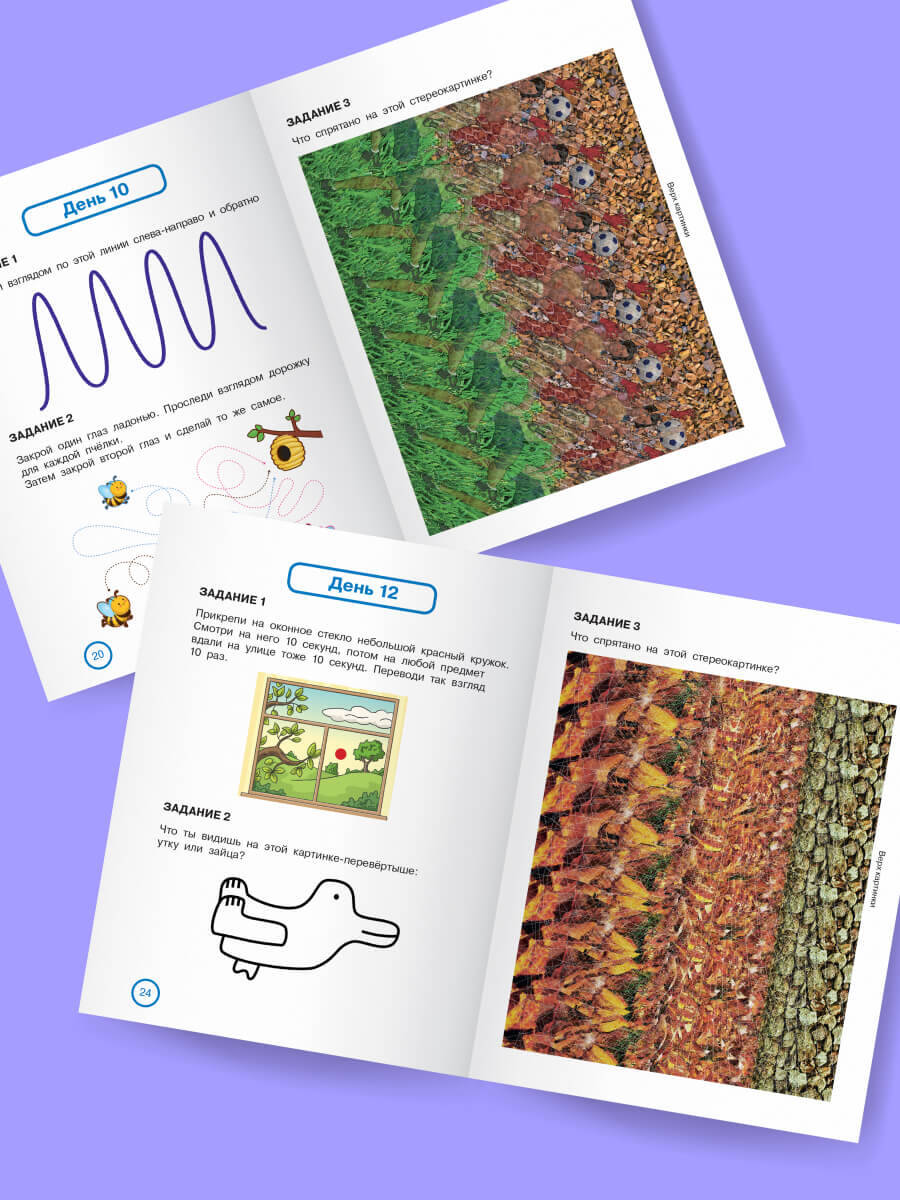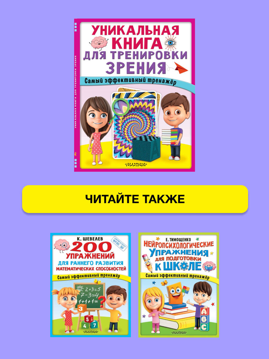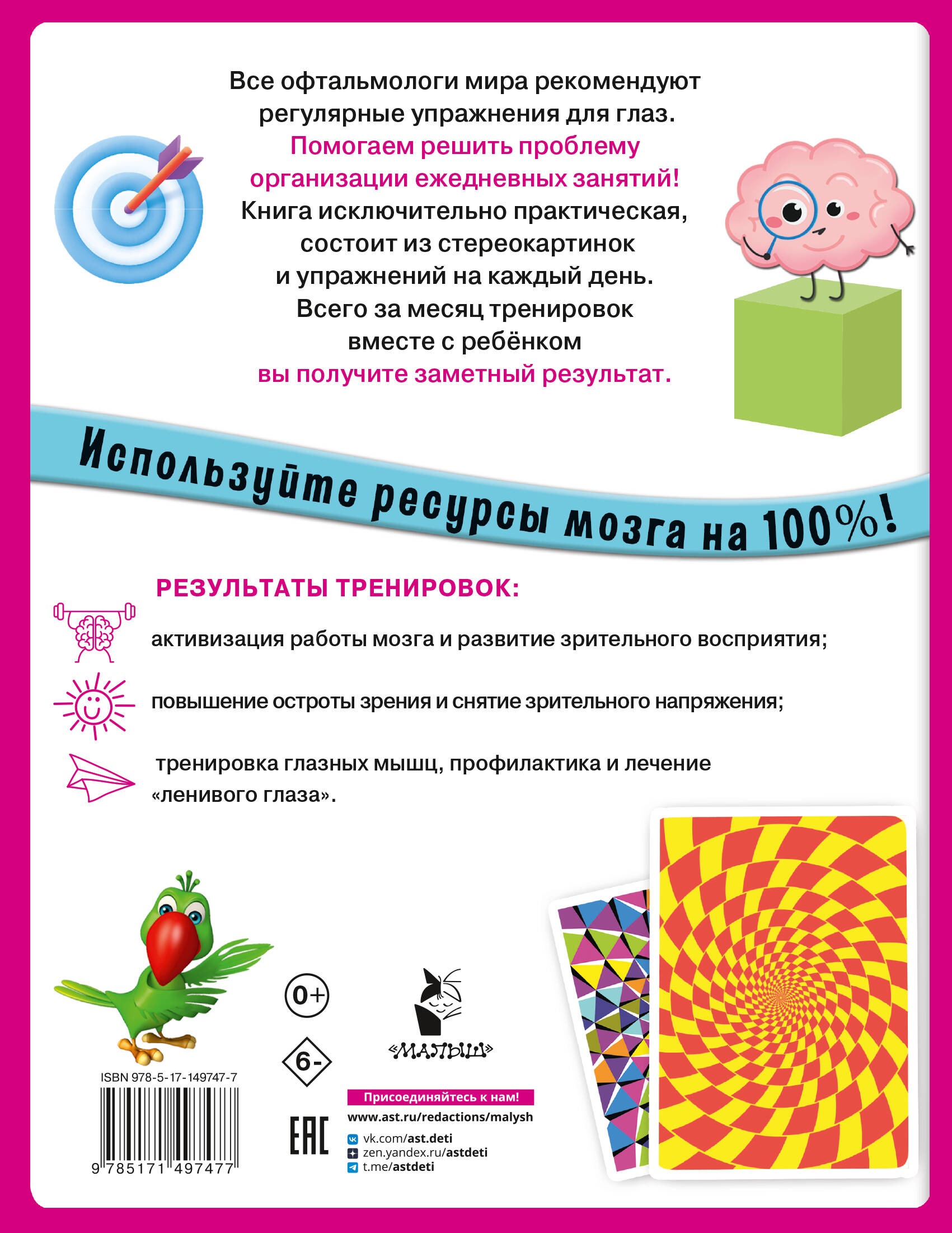 Уникальная книга для тренировки зрения Все офтальмологи мира рекомендуют регулярные упражнения для глаз. Помогаем решить проблему организации ежедневных занятий! Книга исключительно практическая, состоит из стереокартинок и упражнений на каждый день. Всего за месяц тренировок вместе с ребёнком вы получите заметный результат. Результаты тренировок: • активизация работы мозга и развитие зрительного восприятия; • повышение остроты зрения и снятие зрительного напряжения; • тренировка глазных мышц, профилактика и лечение «ленивого глаза».| Издательство | АСТ |
