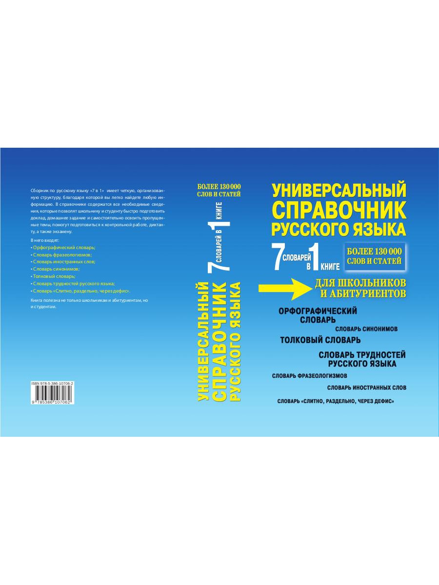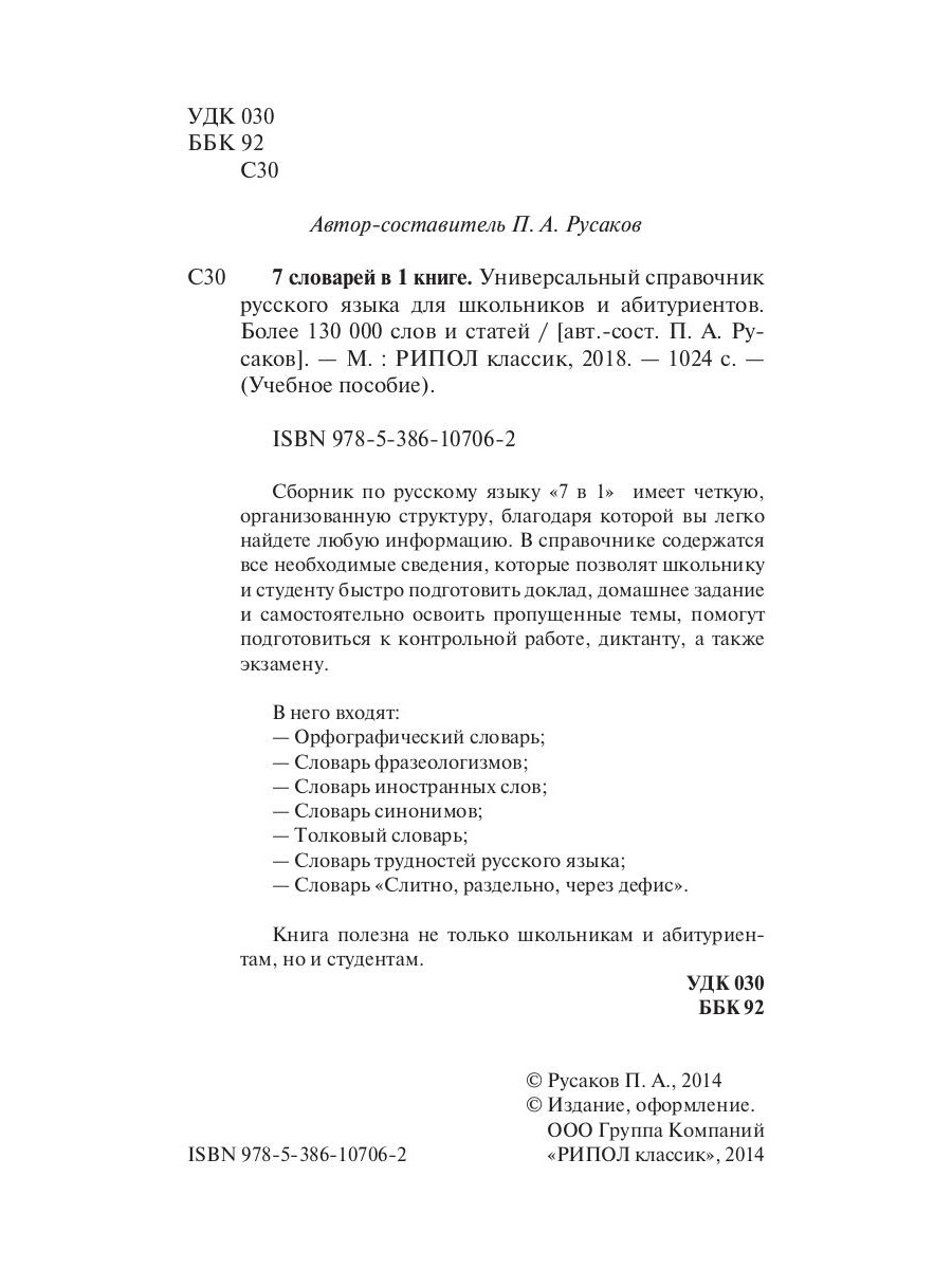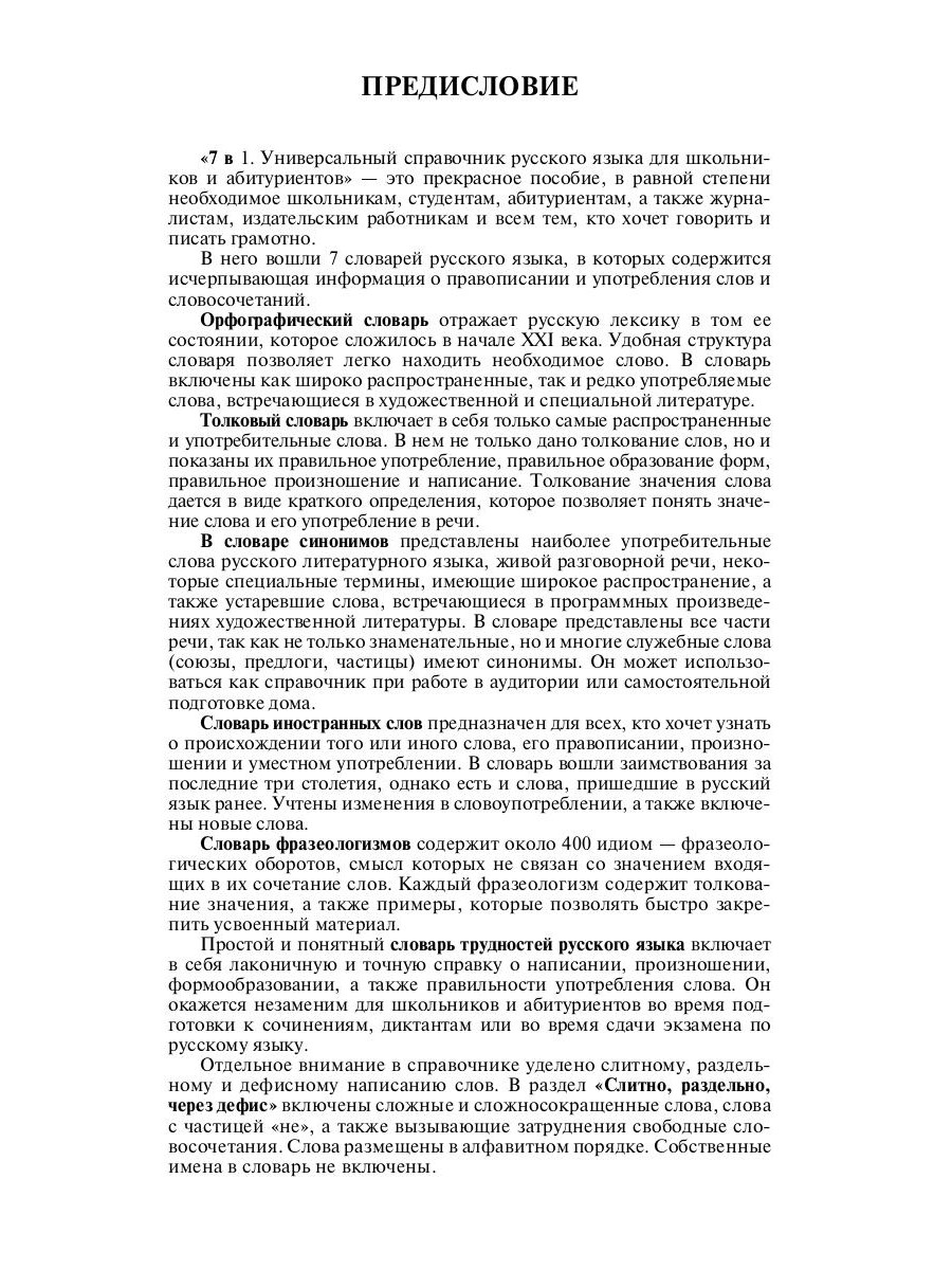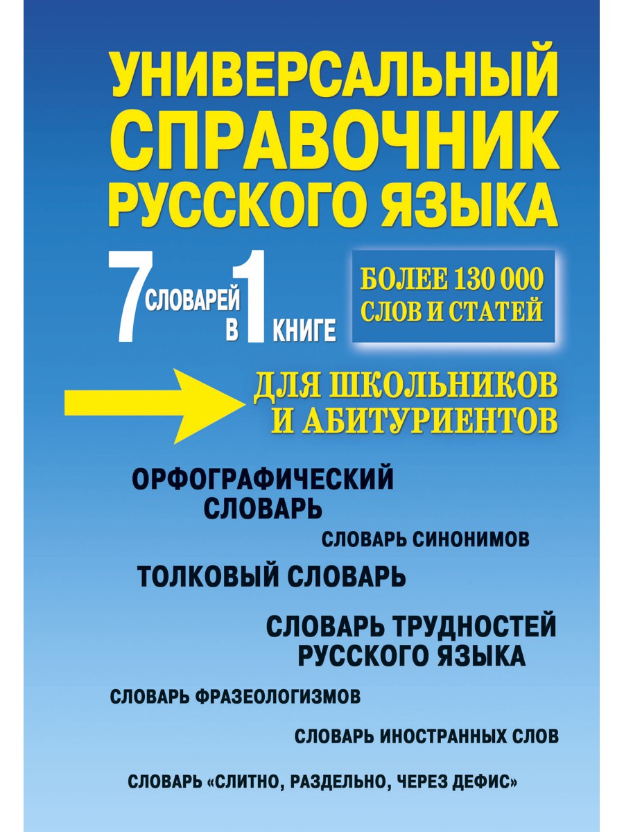Аннотация: Универсальный справочник русского языка для школьников и абитуриентов. 7 словарей в 1 книге. Более 130 000 слов и статей. Сост. Русаков П.А.