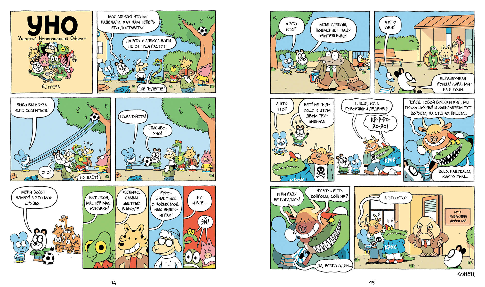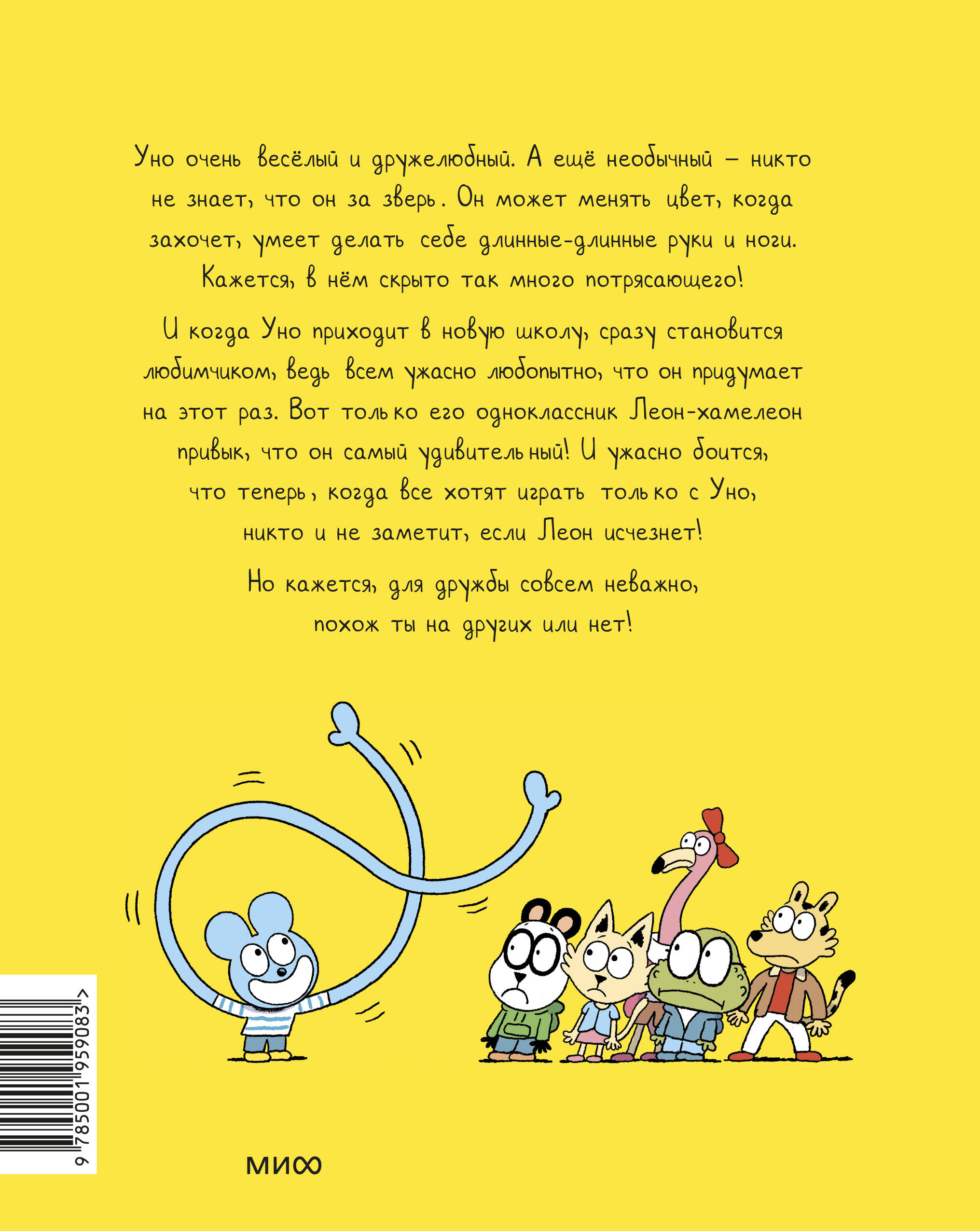 Уно - необычный маленький зверек. Он обладает суперспособностями: может стать невидимым или поменять свой цвет, форму или длину рук. А главное - никогда не угадаешь, что он придумает на этот раз, потому что это точно не все его таланты! И когда он идет в новую школу, то сразу становится всеобщим любимчиком, потому что даже скучный урок теперь превращается в приключение. Но, похоже, новичку рады не все… ведь теперь никто не замечает главную звезду школы - Леона-хамелеона! И он вовсе не намерен оставаться в тени! Фишки книги: - Емкий ситуативный юмор, понятный в любом возрасте. - Отличное визуальное оформление: хорошо проработаны детали, выражения лиц героев, эмоции очень живые и понятные без слов. - Яркие и необычные герои, которые будут близки детям. - Короткие рассказы идеально подойдут для начинающих читателей: перед сном можно прочитать 2-3 истории и спокойно засыпать. - Знакомство с серией можно начать с любого тома. - Поможет ребенку начать читать самостоятельно. Для кого эта книга: Для детей от 5 лет и их родителей. Для поклонников серии "Эмиль и Марго" Для всей семьи, если вы любите читать и веселиться вместе. Для всех любителей комиксов.