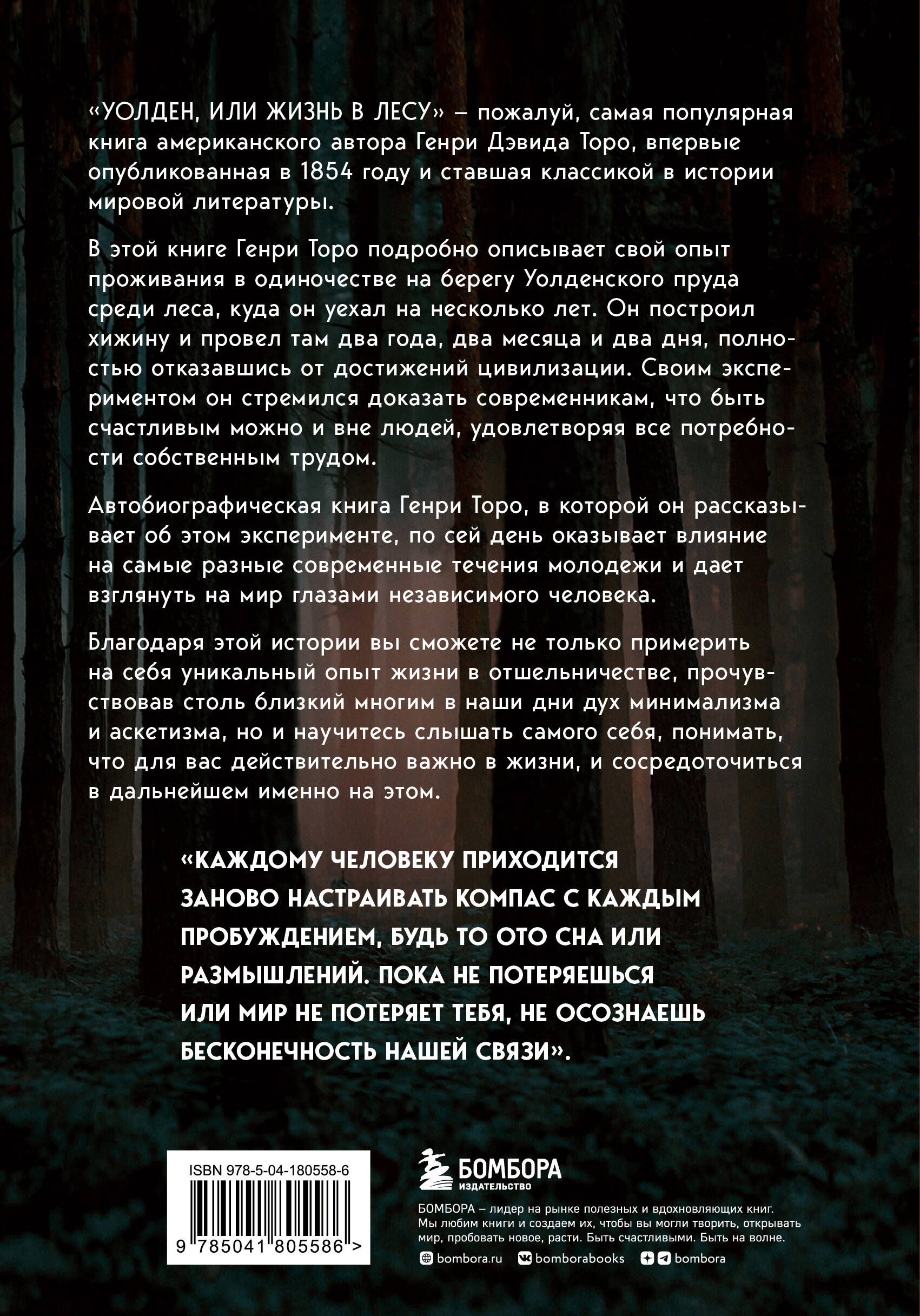 «Уолден, или Жизнь в лесу» - пожалуй, самая популярная книга американского автора Генри Дэвида Торо, впервые опубликованная в 1854 году и ставшая классикой в истории мировой литературы. В этой книге Генри Торо подробно описывает свой опыт проживания в одиночестве на берегу Уолденского пруда среди леса, куда он уехал на несколько лет - в 27 лет писатель принял решение бросить вызов обществу, увлеченному материальными благами на заре эпохи потребления, и уйти вдаль от людей. Своим экспериментом он стремился доказать современникам, что быть счастливым можно и вне людей, удовлетворяя все потребности собственным трудом. Он построил хижину в лесах Массачусетса и провел там два года, два месяца и два дня, полностью отказавшись от достижений цивилизации. Автобиографическая книга Генри Торо, в которой он рассказывает об этом эксперименте, по сей день оказывает влияние на самые разные современные течения молодежи и дает взглянуть на мир глазами независимого человека. Благодаря этой истории вы сможете не только примерить на себя уникальный опыт жизни в отшельничестве, прочувствовав столь близкий многим в наши дни дух минимализма и аскетизма, но и научитесь слышать самого себя, понимать, что для вас действительно важно в жизни, и сосредоточиться в дальнейшем именно на этом.| Издательство | ООО "Издательство "Эксмо" |
