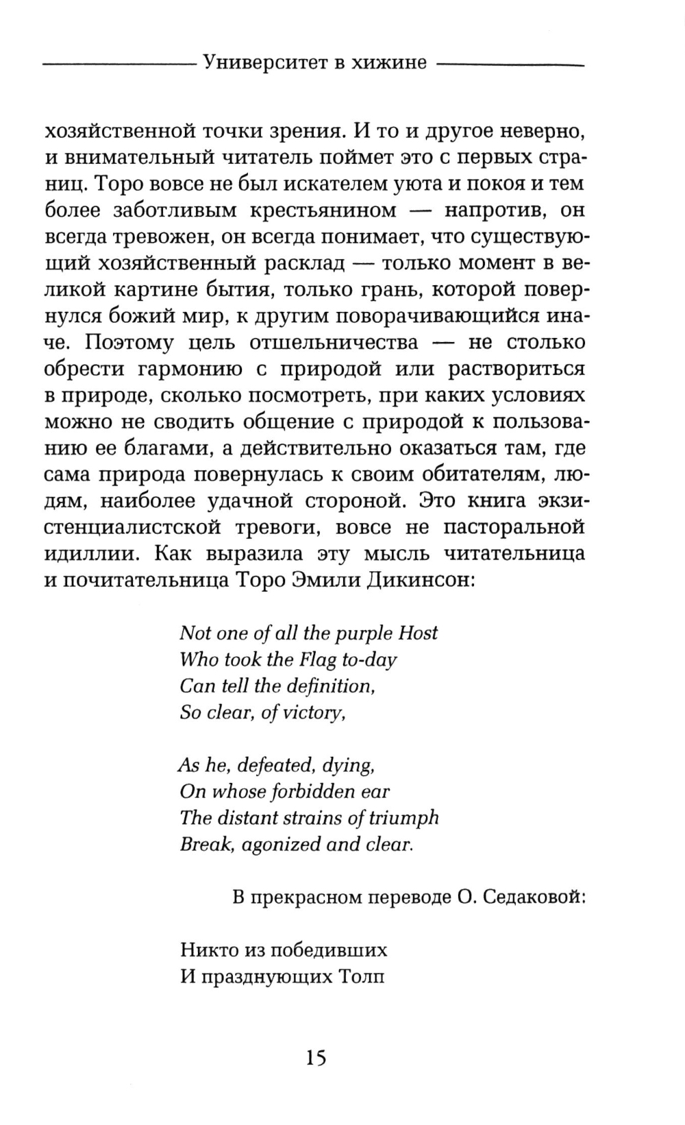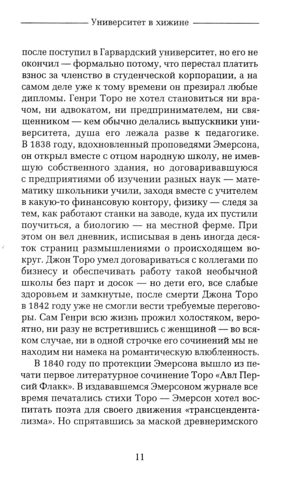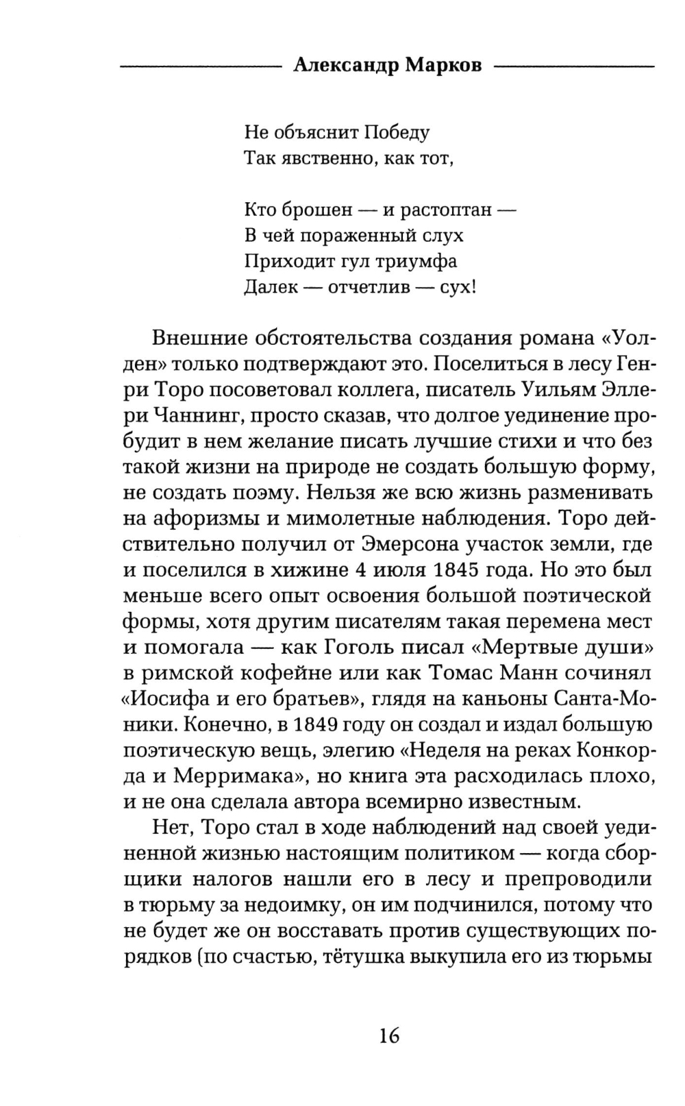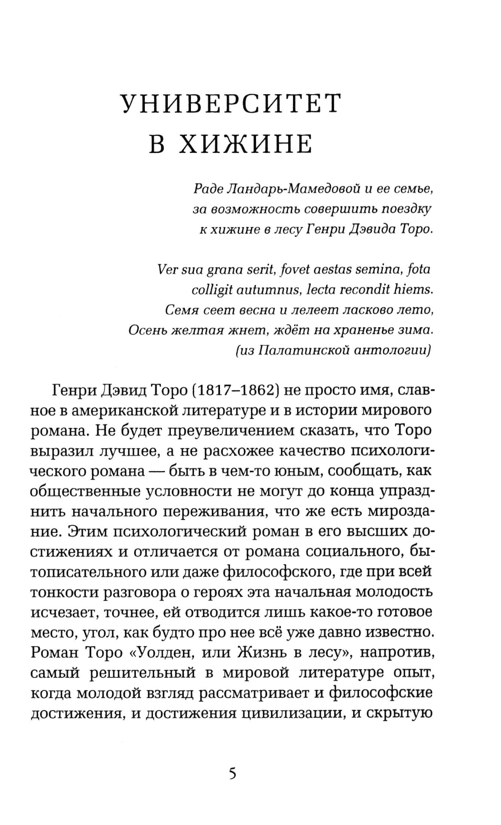 Генри Торо, американский писатель, «инспектор ливней и снежных бурь», в двадцать восемь лет удалился от общества и, построив себе дом в лесу на берегу Уолденского пруда, поселился в нем на два года. Так появилась одна из самых удивительных книг за всю историю литературы - «Уолден, или Жизнь в лесу». Рассказ Торо о двух годах, проведенных наедине с природой, стал классикой американской литературы. Своей жизнью у озера Торо стремился показать современникам с их культом материального преуспевания, что хорошо и счастливо жить можно и вне общества, удовлетворяя все естественные потребности собственным трудом. Обществу потребления он противопоставил свободу от материальных забот, уединение, самодостаточность, созерцательность и близость к природе.| Издательство | Рипол Классик |