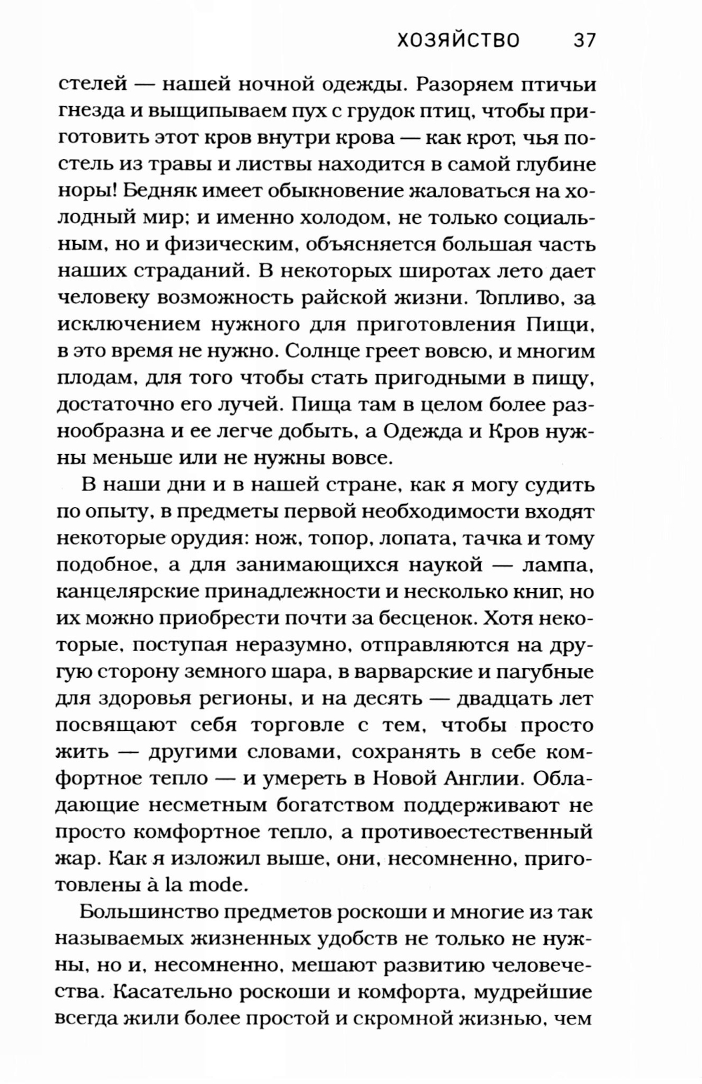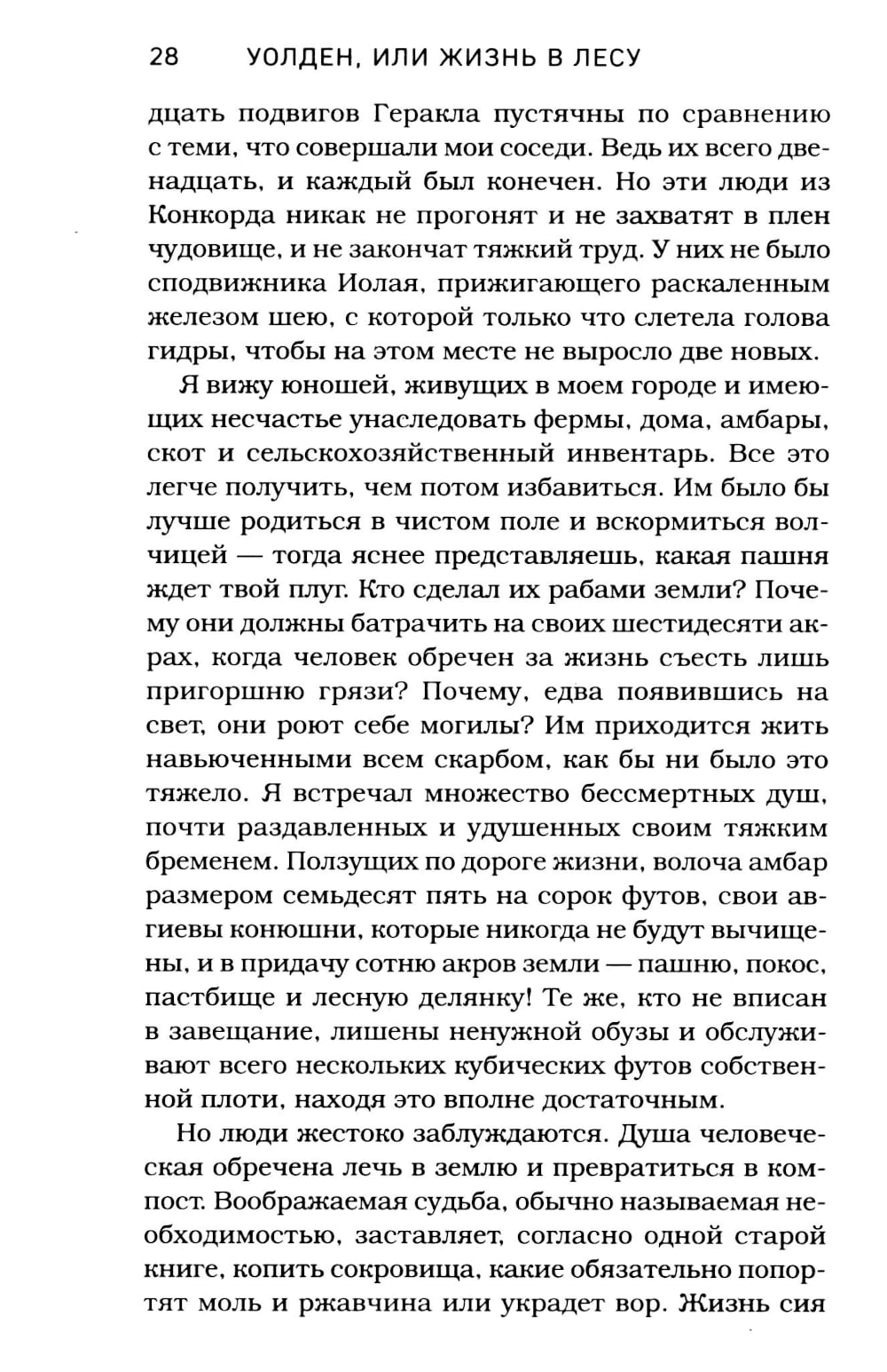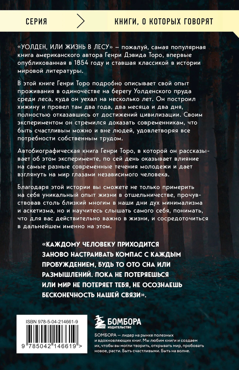 «Уолден, или Жизнь в лесу» - пожалуй, самая популярная книга американского автора Генри Дэвида Торо, впервые опубликованная в 1854 году и ставшая классикой в истории мировой литературы. В этой книге Генри Торо подробно описывает свой опыт проживания в одиночестве на берегу Уолденского пруда среди леса, куда он уехал на несколько лет, - в 27 лет писатель принял решение бросить вызов обществу, увлеченному материальными благами на заре эпохи потребления, и уйти вдаль от людей. Своим экспериментом он стремился доказать современникам, что быть счастливым можно и вне людей, удовлетворяя все потребности собственным трудом. Он построил хижину в лесах Массачусетса и провел там два года, два месяца и два дня, полностью отказавшись от достижений цивилизации. Автобиографическая книга Генри Торо, в которой он рассказывает об этом эксперименте, по сей день оказывает влияние на самые разные современные течения молодежи и дает взглянуть на мир глазами независимого человека. Благодаря этой истории вы сможете не только примерить на себя уникальный опыт жизни в отшельничестве, прочувствовав столь близкий многим в наши дни дух минимализма и аскетизма, но и научитесь слышать самого себя, понимать, что для вас действительно важно в жизни, и сосредоточиться в дальнейшем именно на этом.