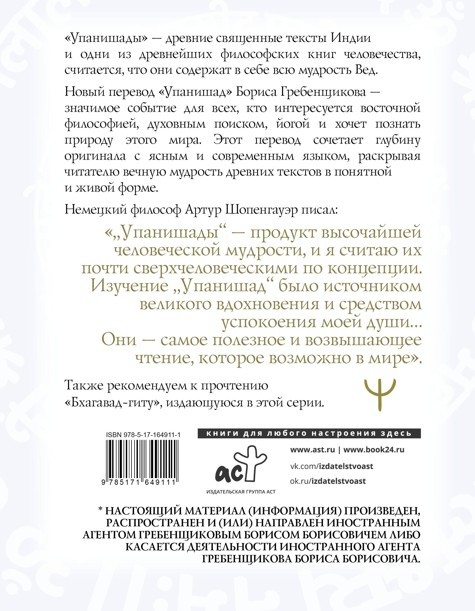 НАСТОЯЩИЙ МАТЕРИАЛ (ИНФОРМАЦИЯ) ПРОИЗВЕДЕН, РАСПРОСТРАНЕН И (ИЛИ) НАПРАВЛЕН ИНОСТРАННЫМ АГЕНТОМ ГРЕБЕНЩИКОВЫМ БОРИСОМ БОРИСОВИЧЕМ ЛИБО КАСАЕТСЯ ДЕЯТЕЛЬНОСТИ ИНОСТРАННОГО АГЕНТА ГРЕБЕНЩИКОВА БОРИСА БОРИСОВИЧА. "Упанишады" - древние священные тексты Индии и одни из древнейших философских книг человечества, считается, что они содержат в себе всю мудрость Вед. Новый перевод "Упанишад" Бориса Гребенщикова - значимое событие для всех, кто интересуется восточной философией, духовным поиском, йогой и хочет познать природу этого мира. Этот перевод сочетает глубину оригинала с ясным и современным языком, раскрывая читателю вечную мудрость древних текстов в понятной и живой форме. Немецкий философ Артур Шопенгауэр писал: ""Упанишады" - продукт высочайшей человеческой мудрости, и я считаю их почти сверхчеловеческими по концепции. Изучение "Упанишад" было источником великого вдохновения и средством успокоения моей души… Они - самое полезное и возвышающее чтение, которое возможно в мире". "Упанишады" помогут взглянуть по-новому на свое место в мире, увидеть глубокий смысл и свет за внешними, порой ставящими в тупик, событиями и явлениями. Говорят, что, узнав все сказанное в "Упанишадах", человек обретает знание обо всем на свете. 5 причин прочесть: 1. Вечные священные тексты, приоткрывающие тайну смысла жизни. 2. Красивый и простой перевод Бориса Гребенщикова. 3. Отличный подарок - стильное оформление. 4. Будет интересно всем, кто увлекается культурой Востока, философией, духовным поиском, медитацией и йогой. 5. Качественная полиграфия.