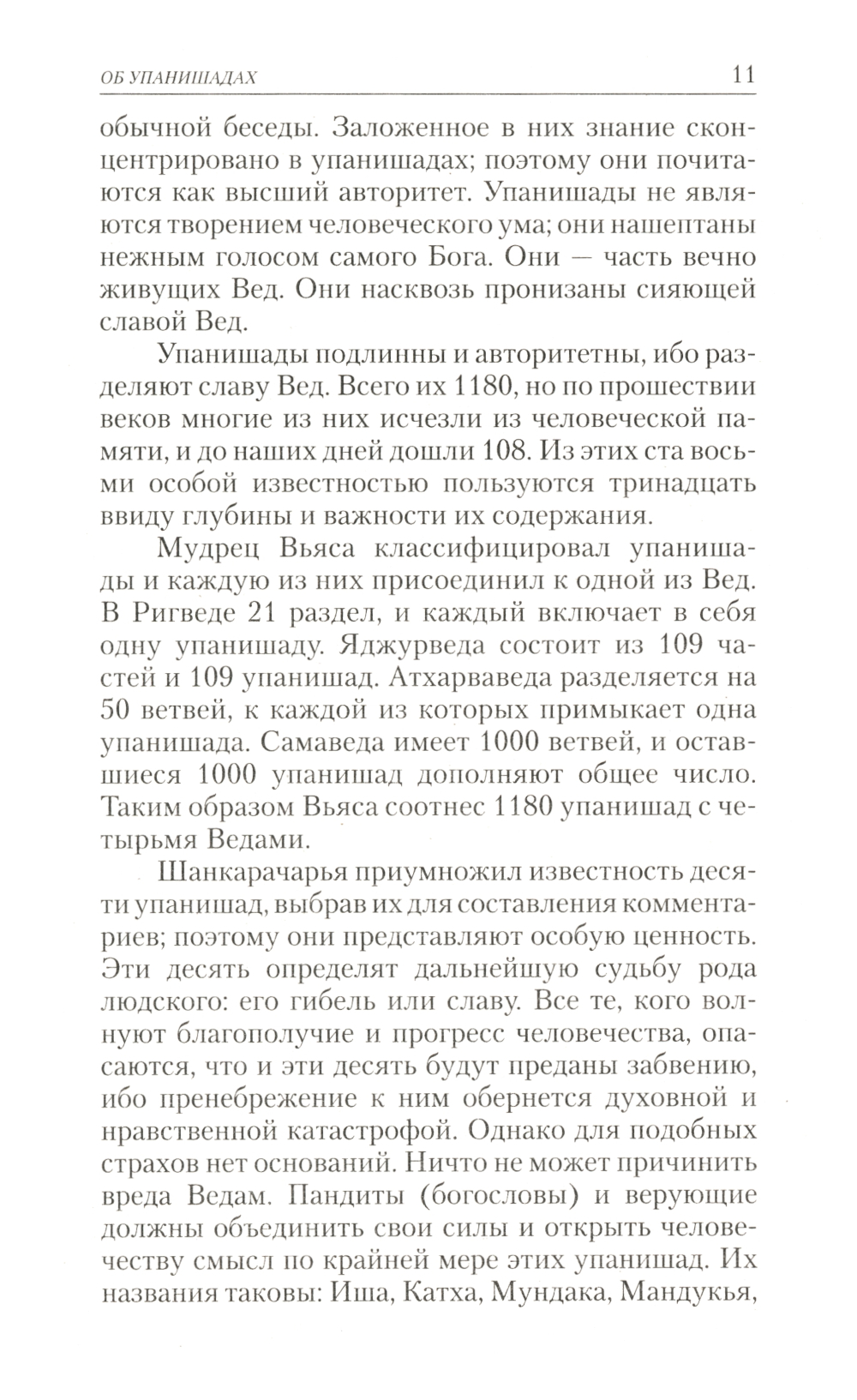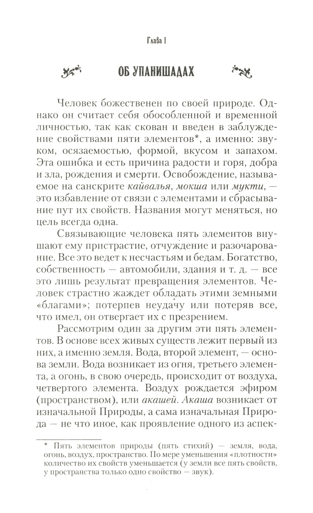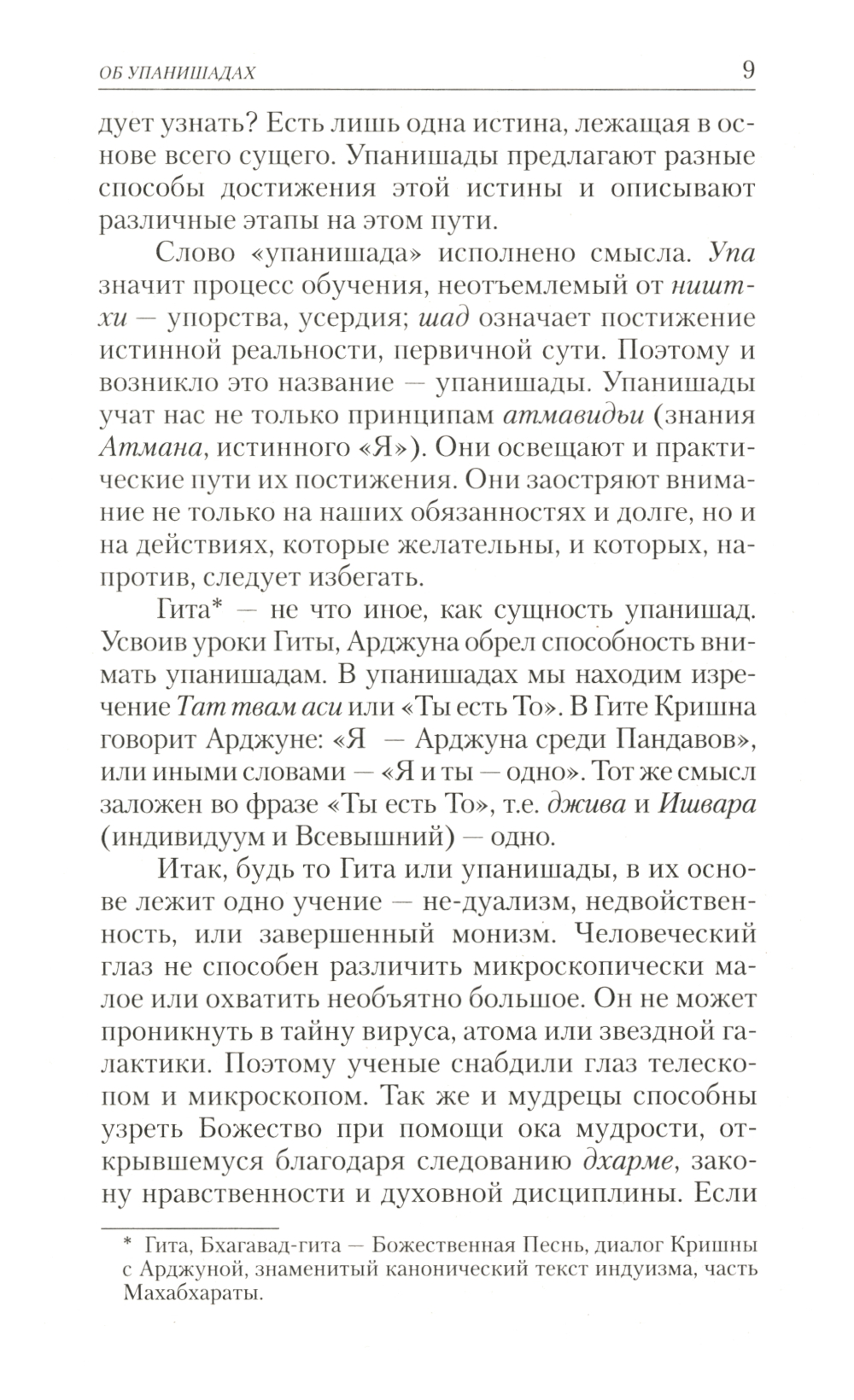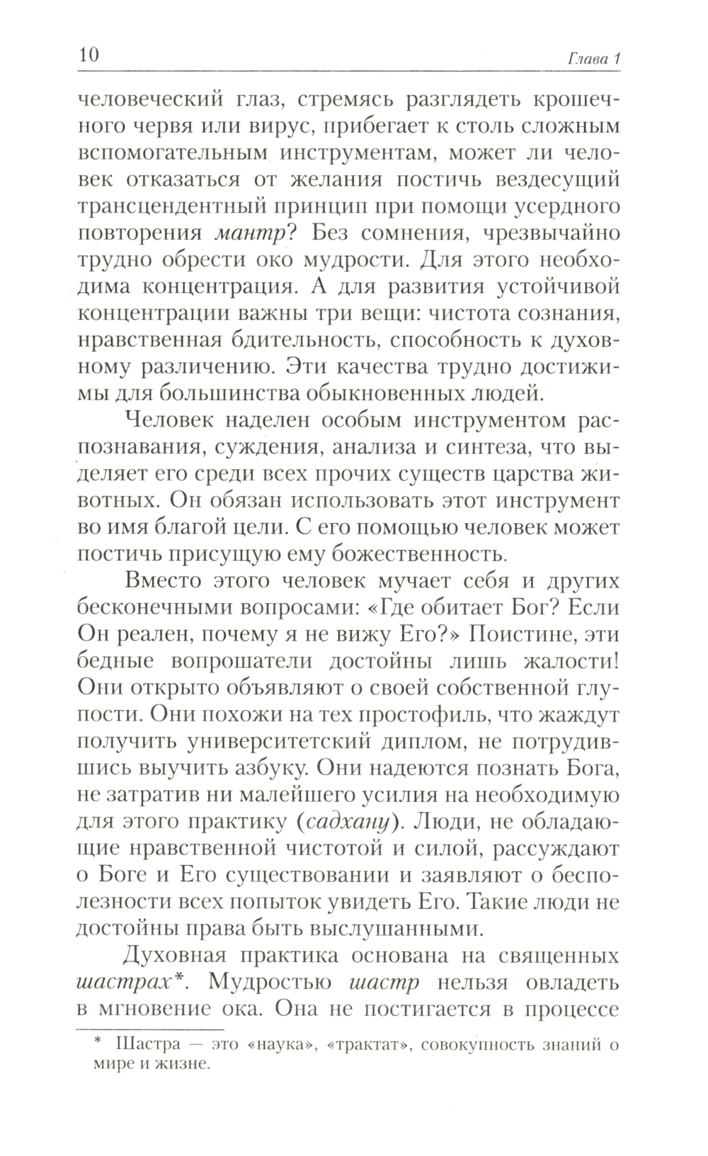 Птицу не нужно учить летать. Тому, кто уже высоко, незачем подниматься. Но тому, кто жаждет подняться высоко, нужно сначала научиться склоняться низко-низко. К стопам учителя, к святым стопам того, кто выше и чище и потому способен очистить и поднять. Изжить на корню высокомерие к тем, кто «слабее», «неудачливее», «беднее». Мы все в одной лодке, и завтра можем поменяться местами. Нет недостойных любви и сочувствия. Одно яркое солнце сияет для каждого и в каждом. «Упанишад» значит склониться низко и сесть. Сесть перед учителем и замереть, открыв уши и сердце, жадно внимая словам мудрости, захлебываясь нектаром бессмертного знания о самом себе, в восторге трепеща от новых открытий. Живую мудрость можно познать лишь с помощью разума, освобожденного от всех следов привязанности и ненависти, эгоизма и чувства собственности. Когда озеро сердца очистится от вязкого слоя тины, «Я» воссияет во всем своем первозданном великолепии.