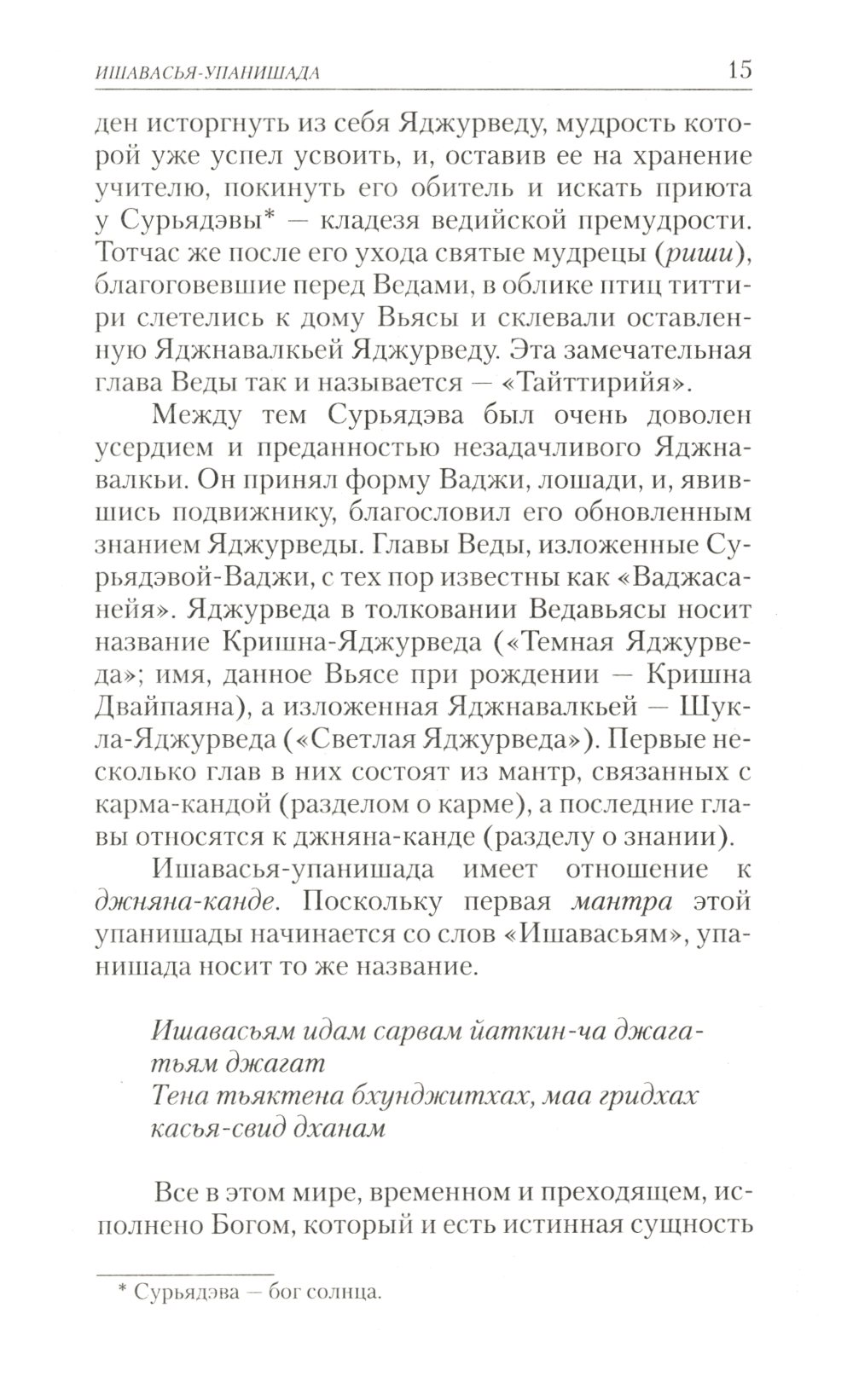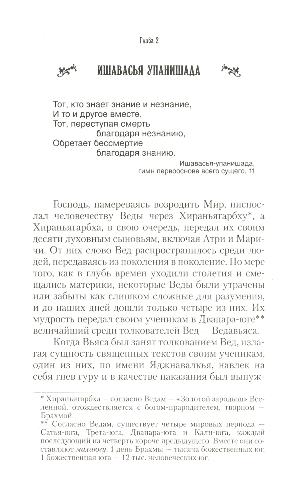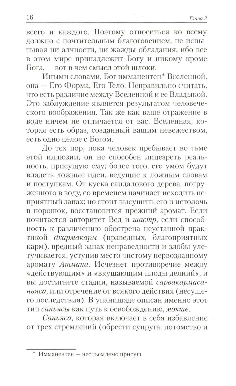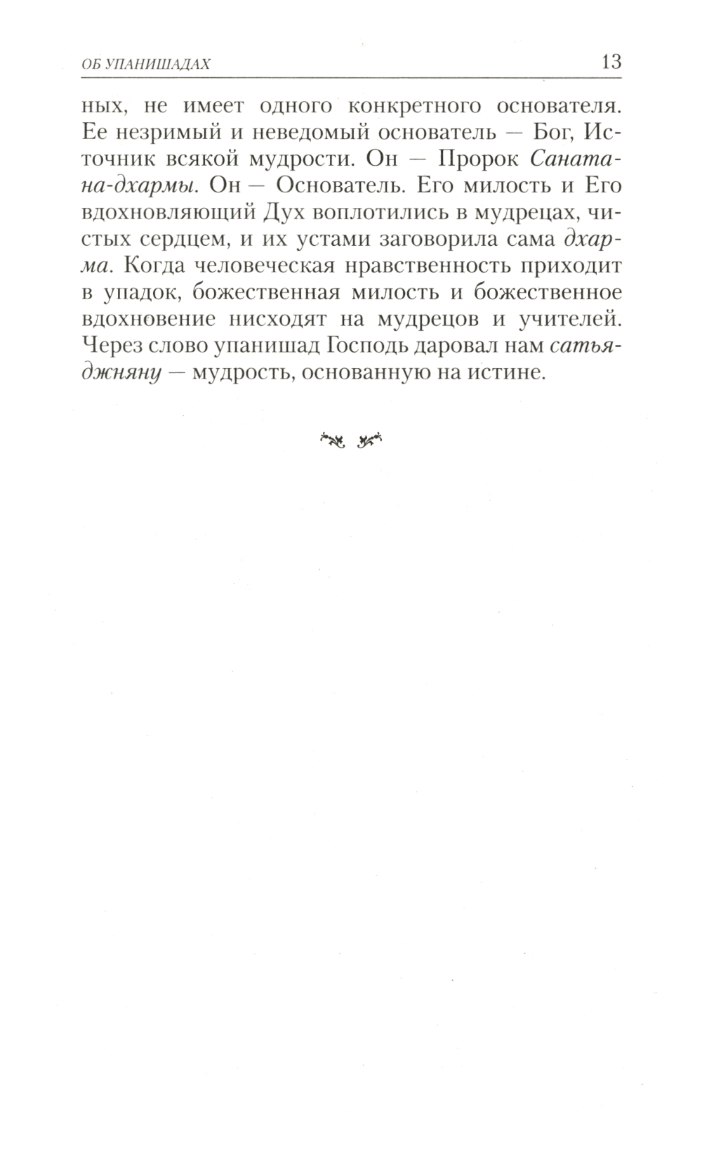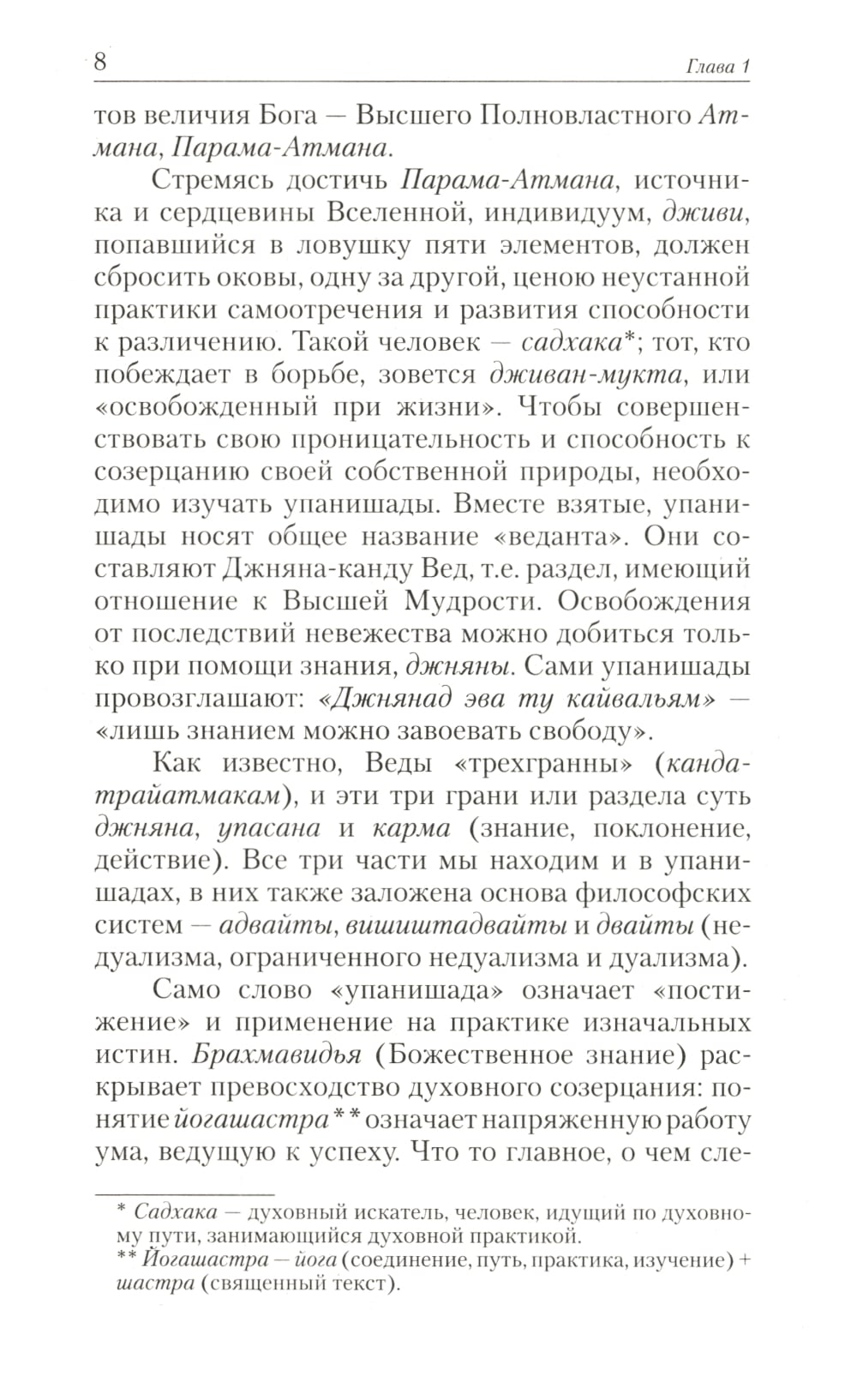 Птицу не нужно учить летать. Тому, кто уже высоко, незачем подниматься. Но тому, кто жаждет подняться высоко, нужно сначала научиться склоняться низко-низко. К стопам учителя, к святым стопам того, кто выше и чище и потому способен очистить и поднять. Изжить на корню высокомерие к тем, кто «слабее», «неудачливее», «беднее». Мы все в одной лодке, и завтра можем поменяться местами. Нет недостойных любви и сочувствия. Одно яркое солнце сияет для каждого и в каждом. «Упанишад» значит склониться низко и сесть. Сесть перед учителем и замереть, открыв уши и сердце, жадно внимая словам мудрости, захлебываясь нектаром бессмертного знания о самом себе, в восторге трепеща от новых открытий. Живую мудрость можно познать лишь с помощью разума, освобожденного от всех следов привязанности и ненависти, эгоизма и чувства собственности. Когда озеро сердца очистится от вязкого слоя тины, «Я» воссияет во всем своем первозданном великолепии.